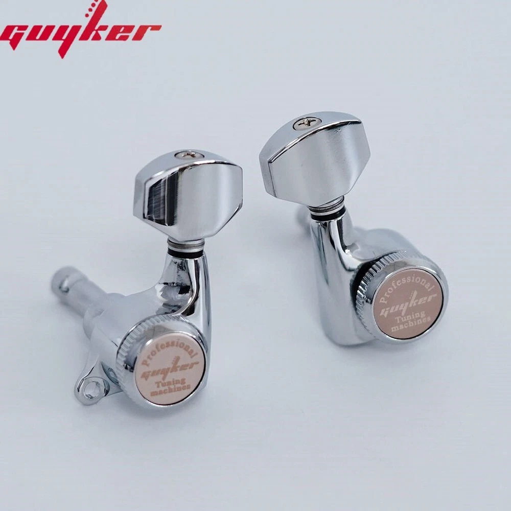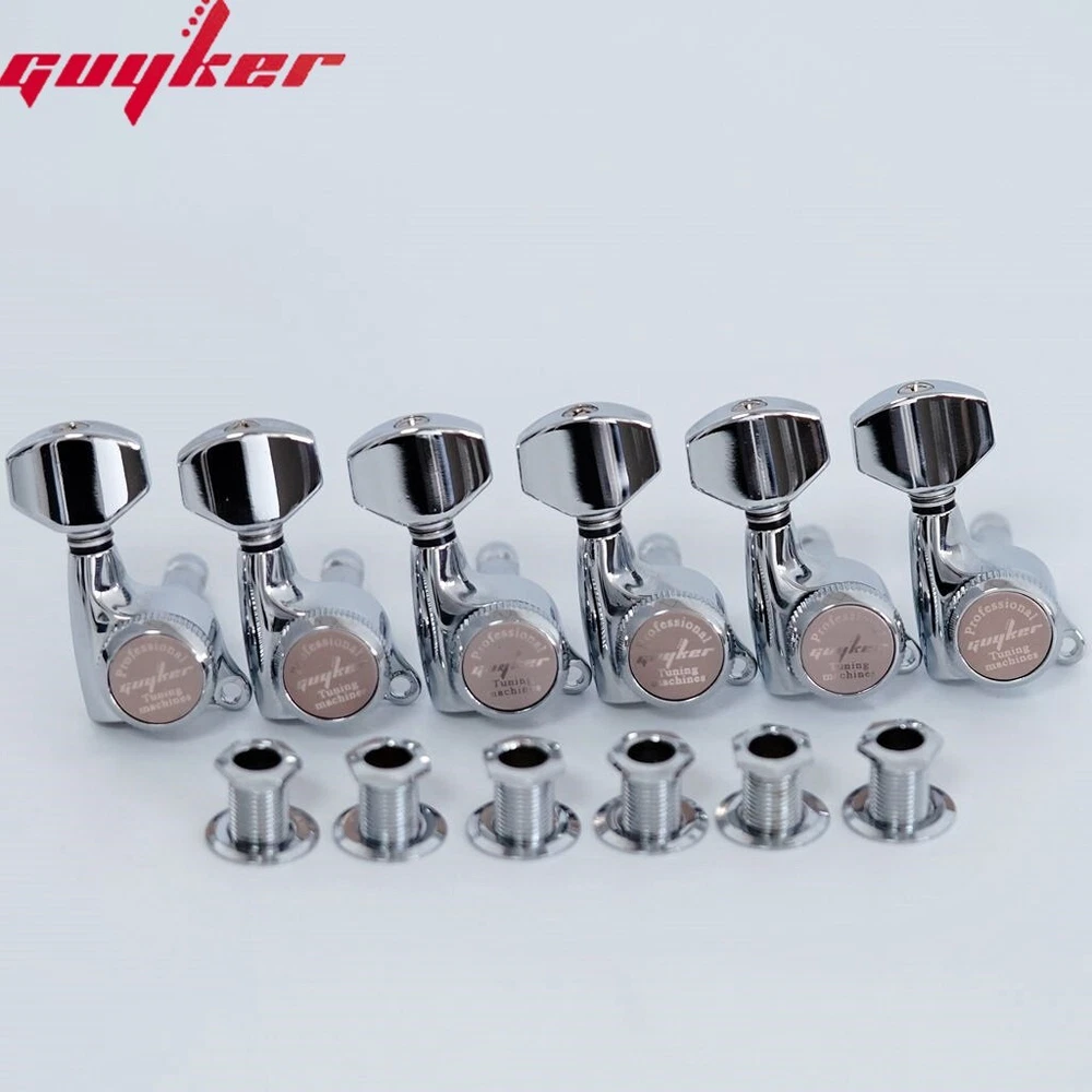 Lock chord back cover is made of metal After the version upgrade, the lock chord back cover is made of metal, which is not easy to break and damage, and has better stabilit. Good locking tuner pegs can ensure you to play your beloved guitar flexibly and accurately. Guyker locks guitar pegheads fit for LP, SG, EPI, Tele style electric or acoustic guitars. Featured with sealed machine heads and heavy-duty internal gear, it can turn smoothly, enabling the player to tune accurately and easily. product good replacement for almost electric or acoustic guitars. Guitar sealed tuning machines with heavy duty internal gear, sturdy and convenient. Easy to install, easy to replace your old and dirty guitar tuning pegs. Guyker locking tuners help to provide finer tuning and greater stability. Gear Ratio - 1:18, designed to fit modern 10mm headstock holes. Gold plated. Made in Korea. Feature: - Replacement / Upgrade parts for electric or acoustic guitars or precision instruments. - Easy to install, quick and accurate tuning. - Durable and highly reliable for easy, smooth, and precise tuning. - Made of solid materials with an elegant and professional look. - With heavy duty internal gear. - Provides finer tuning and greater stability. - Quality sealed guitar machine heads. - Made in Korea. Specifications: - 3 Combinations Available: 6R, 6L or 3R3L - Style: Hexagonal Handle GK-501D7CSP - 3 Colors Available: Golden, Black, Chrome. Package Includes: - 6 x Guitar machine head (6R, 6L or 3R3L for choose) - 6 x Ferrules - 6 x Threaded Bushings