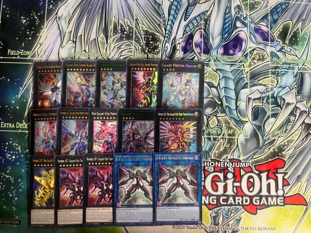 Hello! You are purchasing the deck list below, the cards will be English, real, and near mint to light play condition at worst. All decks are built with the lowest rarities for cards in mind to keep the price of the deck low and affordable for all duelists! Some cards may be in speed duel printing if this is the cheapest available copy of the card, but do not worry these are real cards and legal for tournament use! Purchase with confidence and safety! As an added bonus one pack of card sleeves will be included with your deck! Thanks again and good luck dueling! Now here's the decklist; Monsters: 1| Photon Jumper 1| Galaxy Dragon 1| Dimension Wanderer 1| Galactikuriboh 1| Galaxy-Eyes Cloudragon 1| Galaxy Cleric 1| Galaxy Tyranno 1| Galaxy Mirror Sage 1| Photon Cerberus 1| Photon Crusher 1| Photon Pirate 1| Photon Vanisher 1| Tachyon Cloudragon 1| Paladin of Photon Dragon 1| Galaxy Summoner 1| Kuriphoton 1| Guardian of Order 2| Galaxy-Eyes Afterglow Dragon 2| Photon Thrasher 3| Galaxy-Eyes Photon Dragon 3| Galaxy Knight 3| Photon Orbital Spells; 1| Rank-Up-Magic Barian's Force 1| Hyper Galaxy 1| Photon Hand 1| Galaxy Zero 1| Tachyon Spiral of Destruction 1| Luminous Dragon Ritual 1| Photon Stream of Destruction 1| Numbers Last Hope 1| Accelight 1| Photon Veil 1| Rank-Up-Magic Astral Force 1| Galaxy Hundred 1| Rank-Up- Magic - The Seventh One 2| Photon Sanctuary Traps; 1| XYZ Reborn 1| Eternal Bond 1| Photon Change 1| Lord of the Tachyon Galaxy 3| Tachyon Transmigration Extra Deck; 1| Galaxy Photon Dragon 1| Galaxy-Eyes Full Armor Photon Dragon 1| Starliege Photon Blast Dragon 1| Galaxy-Eyes Cipher Blade Dragon 1| Number 38: Hope Harbinger Dragon Titanic Galaxy 1| Number C107: Neo Galaxy-Eyes Tachyon Dragon 1| Number C62: Neo Galaxy-Eyes Prime Photon Dragon 1| Galaxy Stealth Dragon 1| Neo Galaxy-Eyes Photon Dragon 1| Number 62: Galaxy-Eyes Prime Photon Dragon 1| Galaxy-Eyes Cipher Dragon 2| Number 107: Galaxy-Eyes Tachyon Dragon 2| Galaxy Satellite Dragon