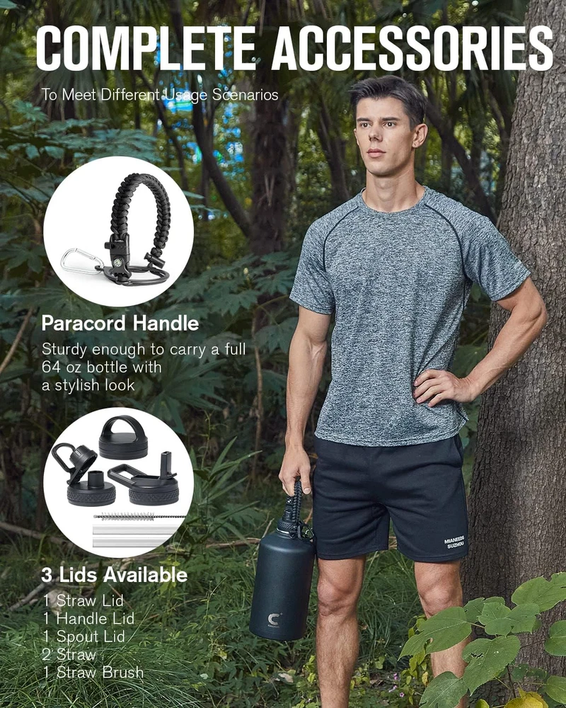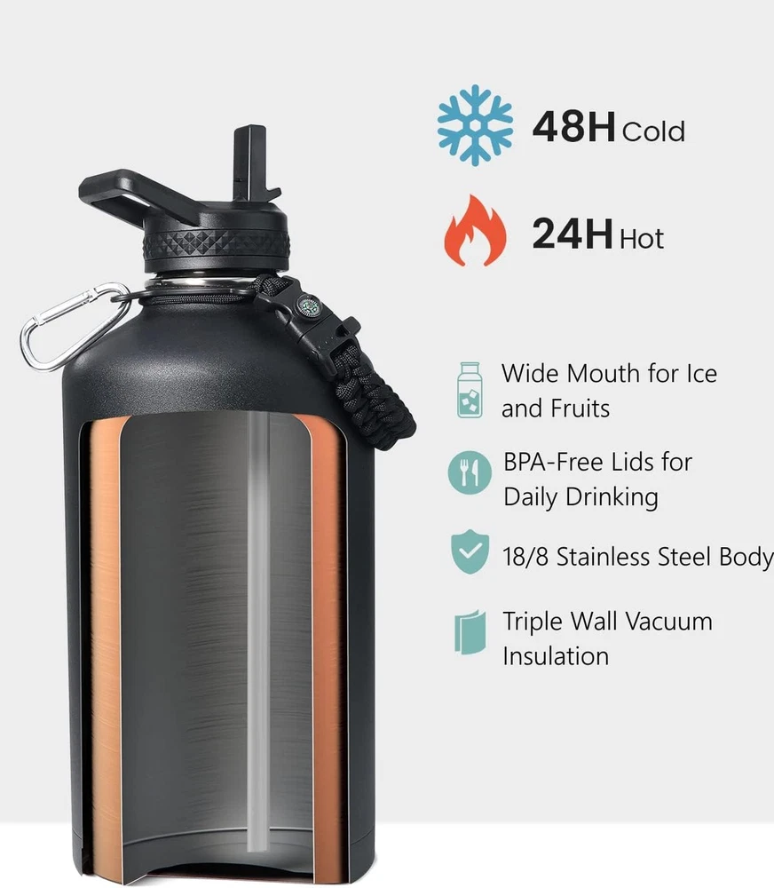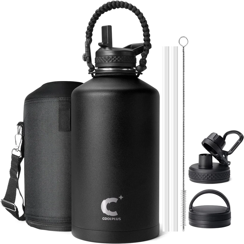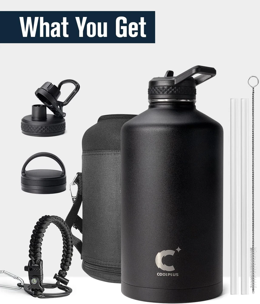 Gallon Water Bottle Insulated With Paracord Handle 128Oz Insulated Water Jug New Gallon Water Bottle Insulated With Paracord Handle 128Oz Insulated Water Jug New Coolplus Gallon Water Bottle Insulated with Paracord Handle & 3 Lids, 128 oz Insulated Water Jug Large Metal Stainless Steel Leakproof Falsk Cold 48H Hot 24H for Outdoor Product Description: Stay hydrated on your adventures with the Gallon Insulated Water Bottle. This 128 oz insulated water jug is designed to keep your beverages cold for hours, making it perfect for outdoor activities, sports, or everyday use. The bottle features a sturdy paracord handle for easy transport, ensuring you can take it wherever you go. Features: Large Capacity: Holds up to 128 oz (1 gallon) of water, ideal for long trips or all-day hydration. Insulated Design: Double-wall insulation keeps beverages cold for extended periods, perfect for hot summer days or outdoor activities. Durable Construction: Made from high-quality, BPA-free materials that ensure durability and safety for daily use. Paracord Handle: Features a strong, comfortable paracord handle for easy carrying and added versatility, making it great for hiking, camping, or gym use. Wide Mouth Opening: The wide mouth design allows for easy filling, pouring, and cleaning, accommodating ice cubes and fruit infusions. Leak-Proof Lid: Secure screw-on lid prevents spills and leaks, ensuring your bag stays dry while on the go. Versatile Use: Suitable for water, juices, or sports drinks, making it a versatile choice for all your hydration needs. This Gallon Insulated Water Bottle is a practical and stylish solution for staying hydrated, whether you’re at home, in the gym, or on an outdoor adventure. Age Range Description Any Age Group Capacity 8 Pounds Number of Items 1 Cap Type Straw Cap Pattern Solid Is the item dishwasher safe? No Material Type Stainless Steel Included Components Straw Color Black Theme Sport With Lid Yes Is the item microwaveable? No Recommended Uses For Product Sports Drinks Item Dimensions W x H 5.31"W x 12.2"H Special Feature Keep Cold 48h Special Features Keep Cold 48h Product Care Instructions Hand Wash Only Size 128 Ounces Product Dimensions: 12.2 "h x 5.31 "h. Weight: 4.0 lb About Us Welcome to our small Family shop. We're dedicated to providing you with high-quality products at unbeatable prices. Our professional customer support is more than happy to help with anything that you need. We’re proud to serve you and bring a smile to your face with our top-notch service and products. Please visit our eBay store for a full list of products on sale, and don’t miss what we have to offer. Payment policy We only accept all type of payments provided by ebay. Please make sure that your eBay shipping addresse is correct. Immediate payment is required before we send out your package. Shipping policy We are always working hard to ensure your package arrives as soon as possible. Please understand that some factors like weather, high postal traffic, and the performance of shipping companies are outside of our control. In most cases, your package will arrive before due time as it is a high priority for us. If there are any unexpected delays, please let us know and we will take care of it immediately. The package it takes 1 or 2 days to process and the delivery time will normally between 2-3 days. Returns We are committed to your happiness. That’s why we offer a 30-Day Return Policy on items that you are not completely satisfied with, no questions asked. You have the option for a refund or an exchange of the item.