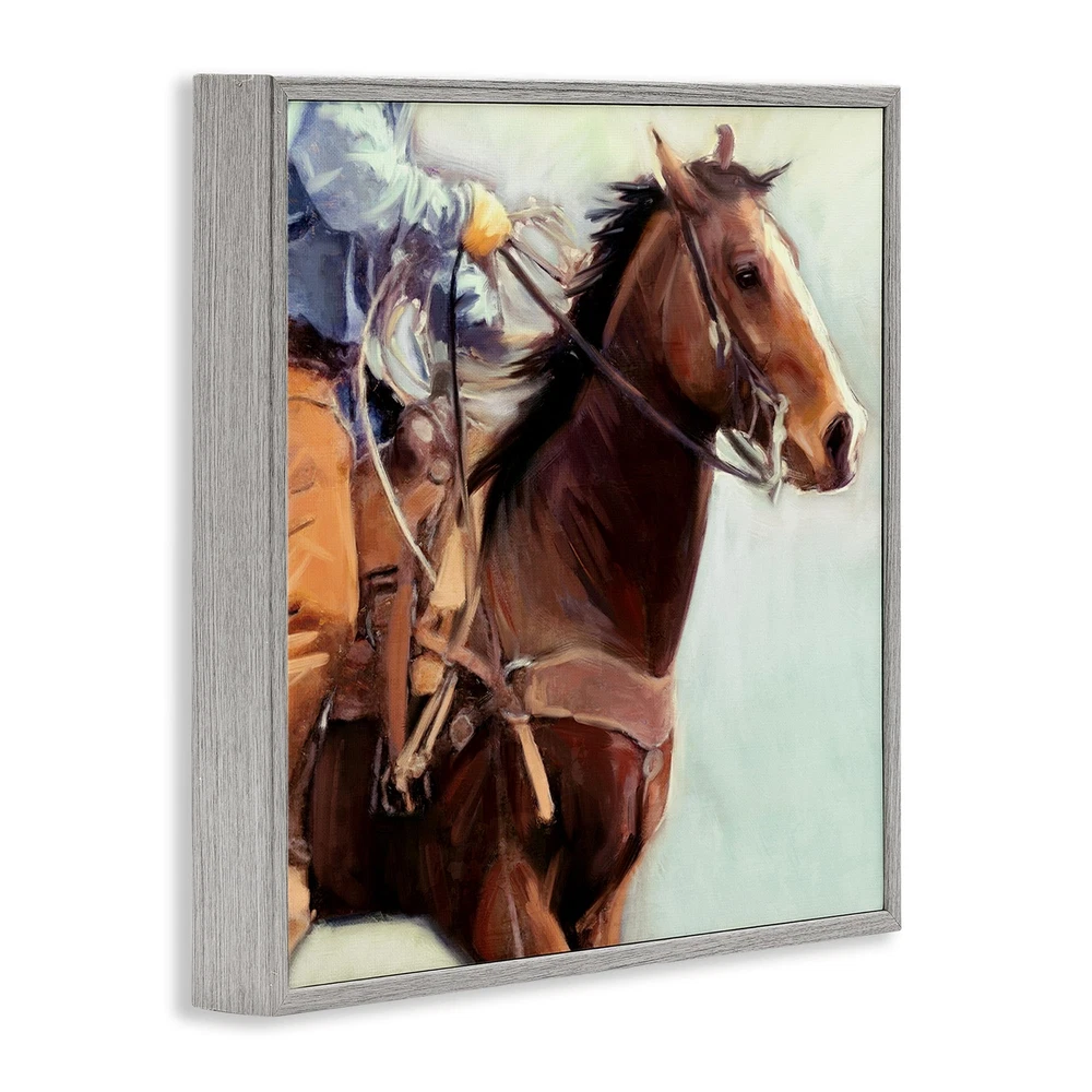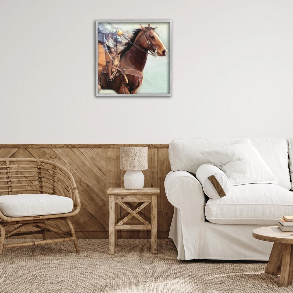 Dimensions: 24 x 1.5 x 24 Framed Framed Giclee Product Sizes Include 12"x12", 17"x17", and 24"x24". Framed Giclee Products have a 1.5" Depth. Wall Art is Ready to Hang with Hardware Free Hanging. No installation required. For Easy Set Up Lean or Layer Artwork on Shelf or Against Wall. Our giclée prints are carefully mounted on a durable MDF backing, and then perfectly finished in a 1.5 inch thick woodgrain frame. Mounted frame colors include black, gray farmhouse and white. Made In USA. Artwork Relates To: Animal, Equestrian, Horse, Mammal, Person, Stallion, Colt Horse, Painting, Cowboy Design by Nina Blue