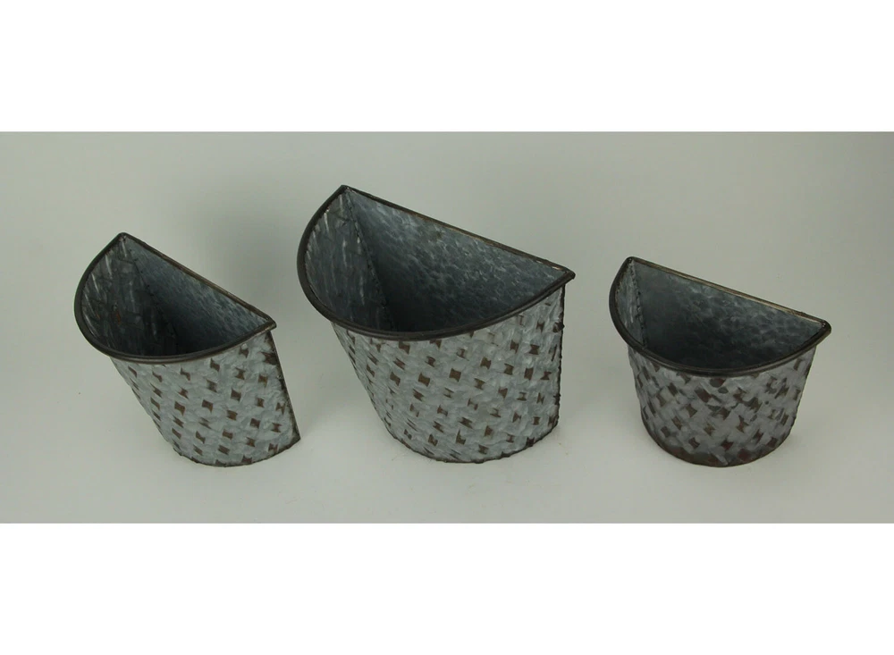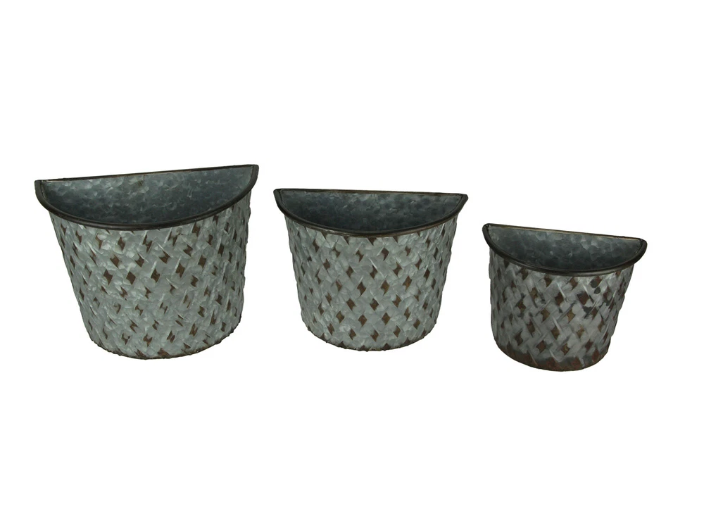NOTE - DUE TO A MISSING HOOK ON THE LARGE PLANTER, this item is being sold at a reduced price (DAMAGE MAY VARY PER PRODUCT AVAILABLE). Please see last photo for damages/defects. Made of Metal in a Distressed Galvanized Finish with Darkened Edges and a Woven Lattice-Look Front Simply Hang From a Single Nail, Screw or Decorative Wall Hook From the Built-In Keyhole Mounting Hangers Hang On a Living Room Wall or Display On a Garden Fence or Outdoor Patio Wall and Give Your Decor a Touch of Vintage Farmhouse Flair Largest - 11.25 inch Long, 8.5 inch Deep, 6.25 inch Wide / Smallest - 8 inch Long, 6.25 inch Deep, 4.5 inch Wide Our eBay Store About Us Add to Favorite Sellers Galvanized Metal Indoor Outdoor Wall Mount Basket Planters Lattice Look Set of 3 NOTE: DUE TO A MISSING HOOK ON THE LARGE PLANTER, this item is being sold at a reduced price (DAMAGE MAY VARY PER PRODUCT AVAILABLE). Please see last photo for damages/defects. NOTE - DUE TO A MISSING HOOK ON THE LARGE PLANTER, this item is being sold at a reduced price (DAMAGE MAY VARY PER PRODUCT AVAILABLE). Please see last photo for damages/defects. Made of Metal in a Distressed Galvanized Finish with Darkened Edges and a Woven Lattice-Look Front Simply Hang From a Single Nail, Screw or Decorative Wall Hook From the Built-In Keyhole Mounting Hangers Hang On a Living Room Wall or Display On a Garden Fence or Outdoor Patio Wall and Give Your Decor a Touch of Vintage Farmhouse Flair Largest - 11.25 inch Long, 8.5 inch Deep, 6.25 inch Wide / Smallest - 8 inch Long, 6.25 inch Deep, 4.5 inch Wide NOTE: DUE TO A MISSING HOOK ON THE LARGE PLANTER, this item is being sold at a reduced price (DAMAGE MAY VARY PER PRODUCT AVAILABLE). Please see last photo for damages/defects. Give your home a touch of vintage farmhouse flair in a modern design and bring your plants to new decorative heights with this set of wall planters. The stylish woven basket look fits in with most any of today's farmhouse and rustic inspired decor styles. They look great with trailing plants, tall grasses and colorful flowers, and if you don't have a green thumb, just arrange some silk greenery to bring a sense of nature into your indoor or outdoor living space. They are made of metal in a galvanized finish with a woven lattice-look front and darkened edges for a wonderfully weathered patina. This set of 8 inch long, 6.25 inch deep, 4.5 inch wide, 10 inch long, 7.5 inch deep, 5 inch wide and 11.25 inch long, 8.5 inch deep, 6.25 inch wide planters easily attaches to a wall or garden fence from the built-in keyhole mounting hangers on the back. Product Details Color Gray Height 8.5 Length 11.25 Weight 2.6 LB