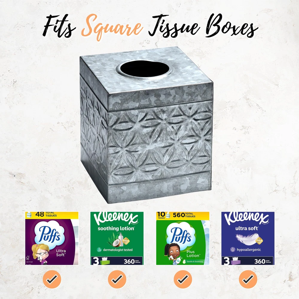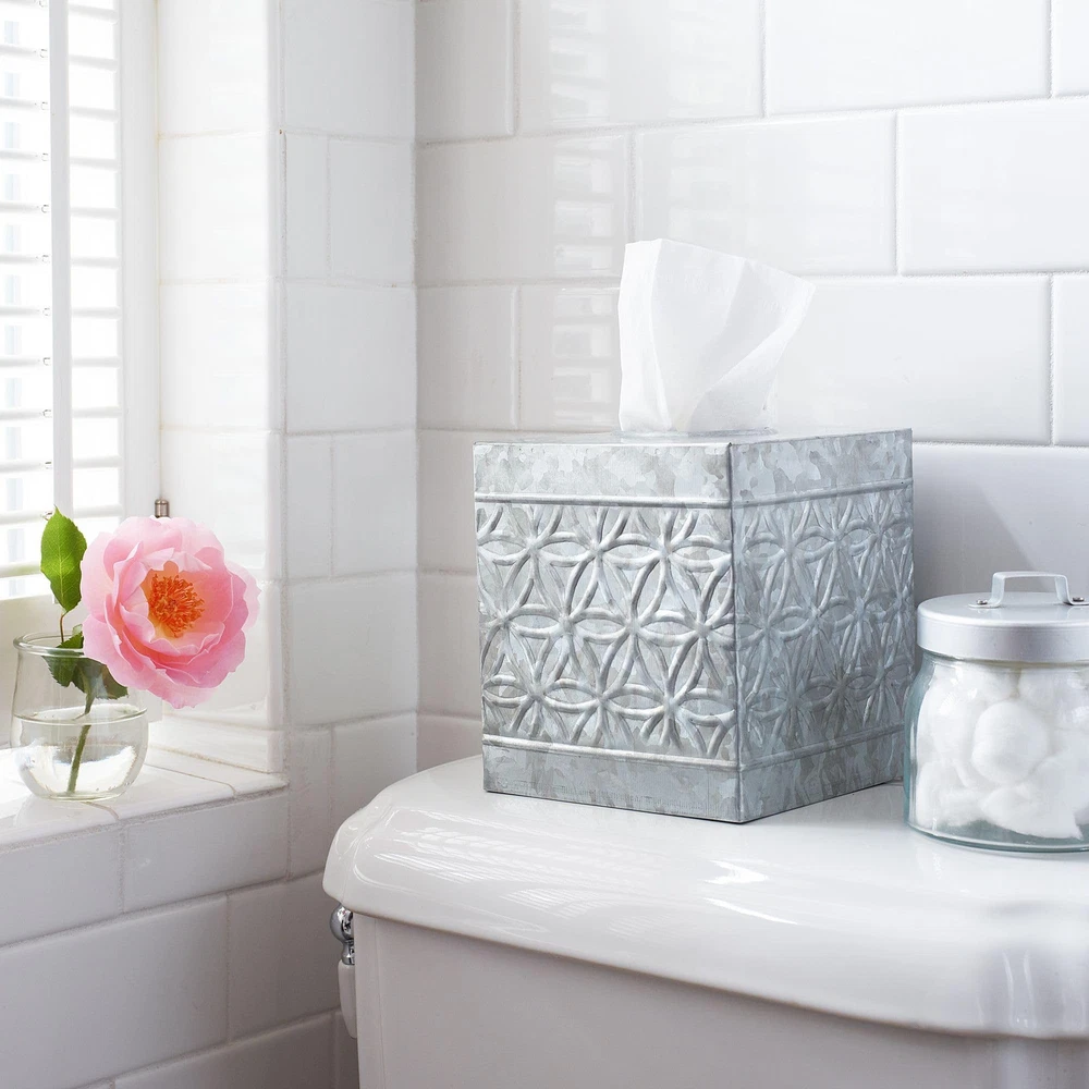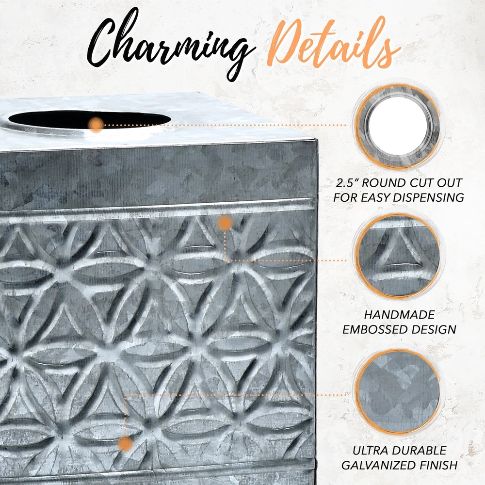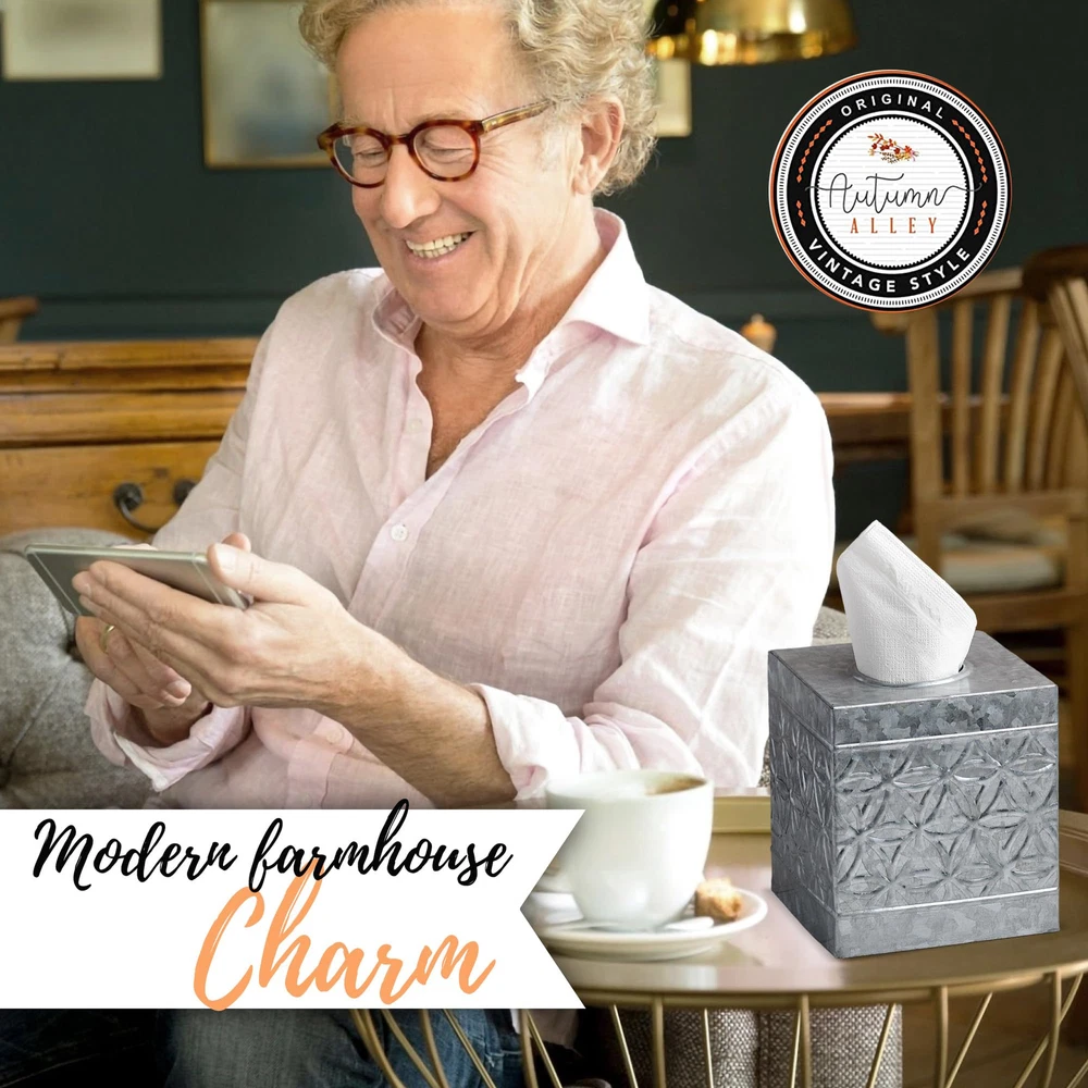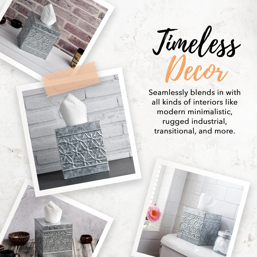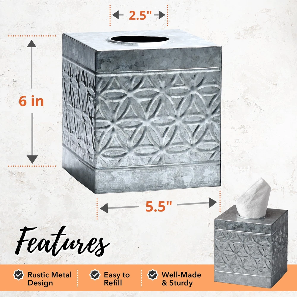 Premium Rustic Décor - Farmhouse Galvanized Square Tissue Box Cover blends sturdy metal with aged vintage charm, creating an eclectic mix. Infuse a touch of old-world grace and reclaimed goodness into your space with this square metal tissue box cover High-end Appeal - Boasting a timeless galvanized country tissue box cover exterior finish adorned with iconic embossed rings, our handcrafted farmhouse tissue box cover seamlessly blends into various interior styles—adding a touch of high-end appeal to modern minimalistic, rugged industrial, transitional, and more. Our rustic tissue box holder square can be used in the bedroom, bathroom, living room or wherever you want to add a little vintage charm Sturdy & Durable Rusic Decorations - Our decorative tissue box, made from sturdy steel and galvanized tin, withstands corrosion and weather changes, ensuring a lifelong rustic charm. Handcrafted by skilled artisans, it adds a touch of old-world allure to any space as a thoughtful and ruggedly sophisticated gift Effortless Refill Design Tissue Box Holder - Easy dispensing and replenishment, this galvanized kleenex cover rustic boasts neatly folded edges, ensuring safety and furniture protection. Ideal for enhancing the rustic charm of your living room or bathroom décor Add to Your Rustic Home Décor - farmhouse tissue holder is designed to fit seamlessly into most spaces. Explore our wide array of rustic decor and galvanized bathroom accessories, perfect for complementing the industrial-chic home decor aesthetic and completing your desired look!
