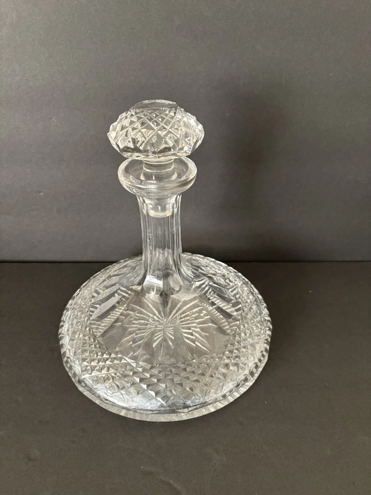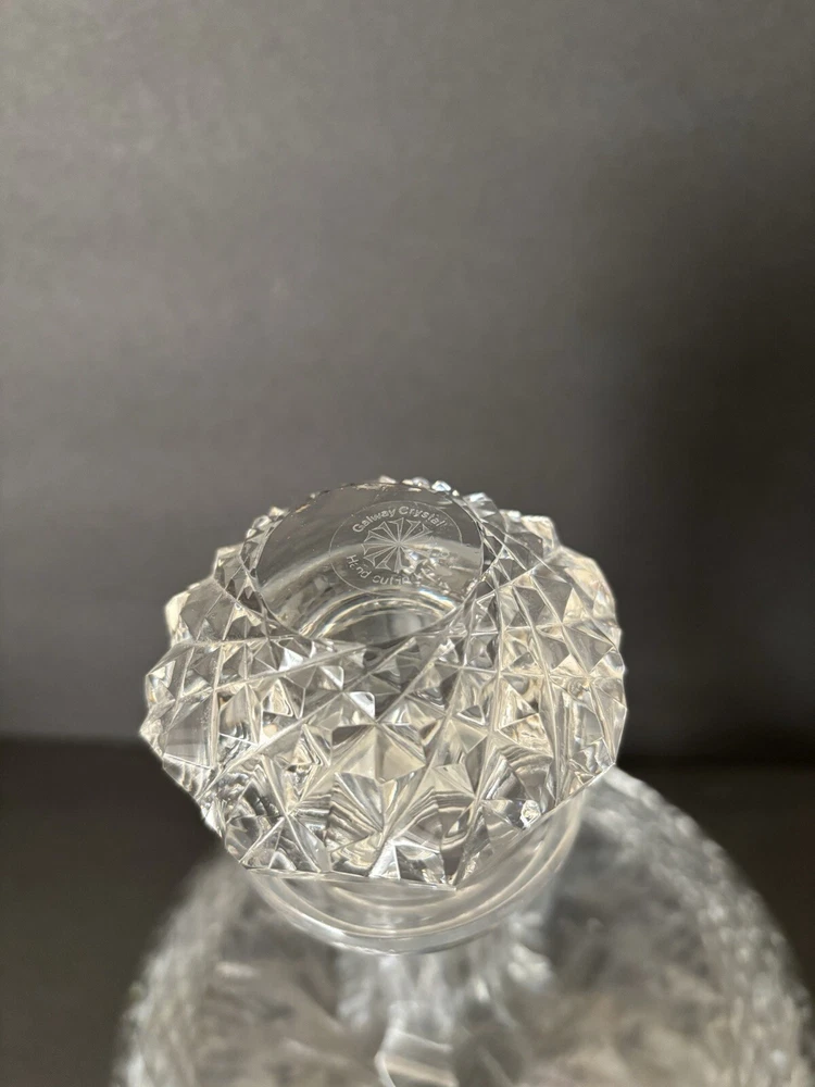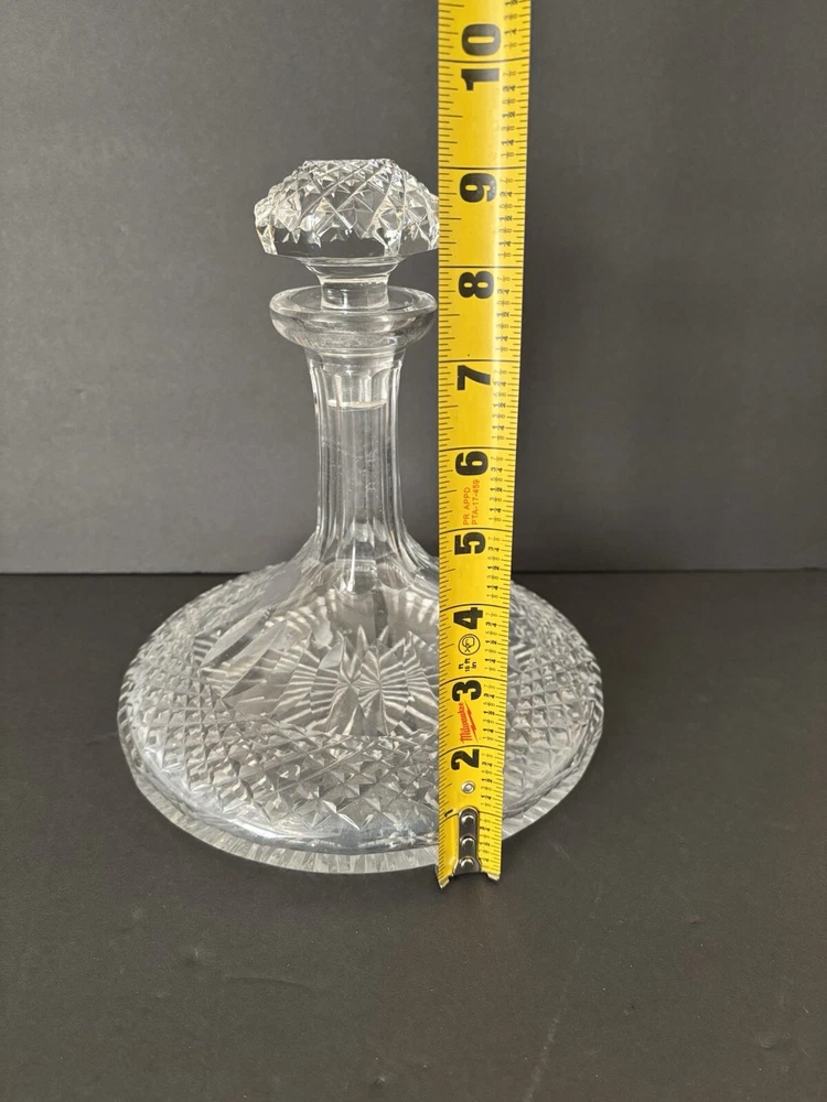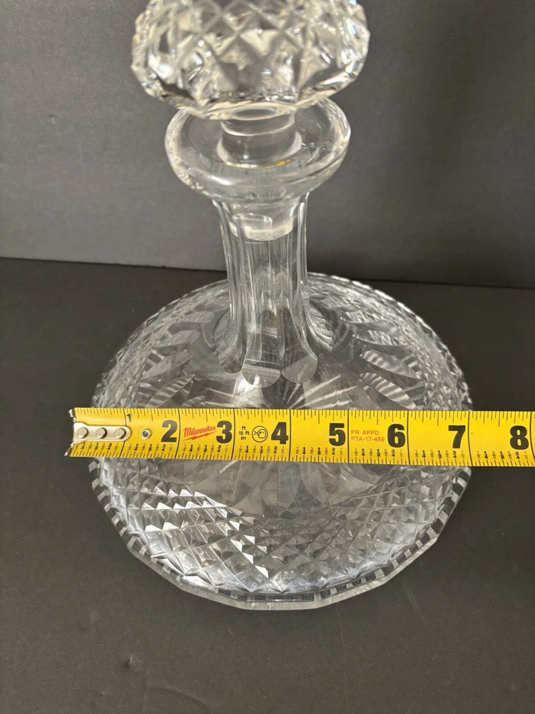Galway Irish Crystal 9" Tall Ships Decanter Bottle With Stopper PREOWNED EXCELLENT CONDITION - HAS THE ORIGINAL GALWAY STICKER ON STOPPER. SHIPS OUT WITHIN 24HRS!! MEASURES 7” DIAMETER, 7 1/2" TALL WITHOUT STOPPER 9" TALL W/ STOPPER. INSIDE DOES HAVE SOME CLOUDS/WHITE SPOTS FROM LIQUID BEING IN IT *Will be packaged with care, bubble wrapped inside a box for safe shipping*