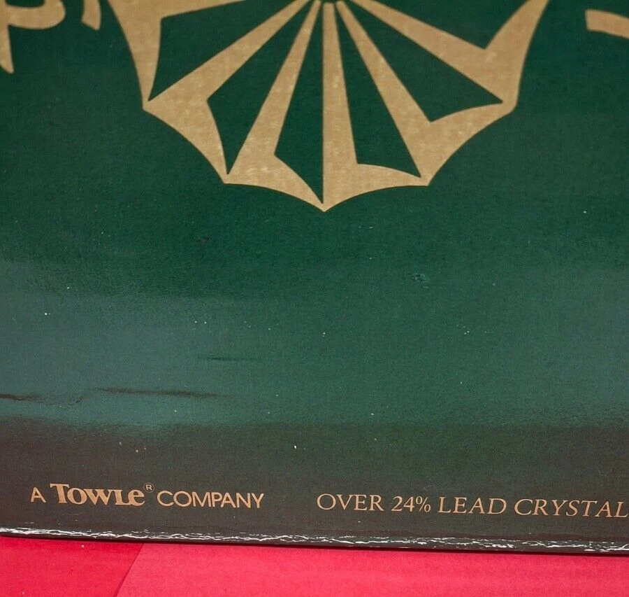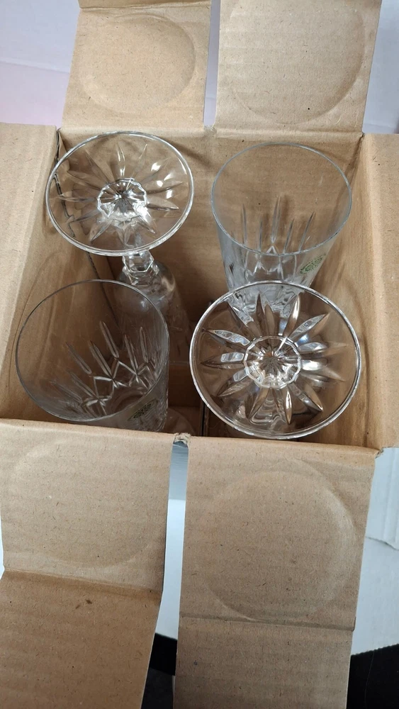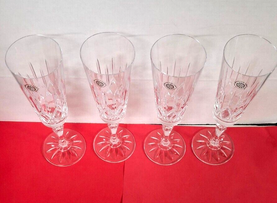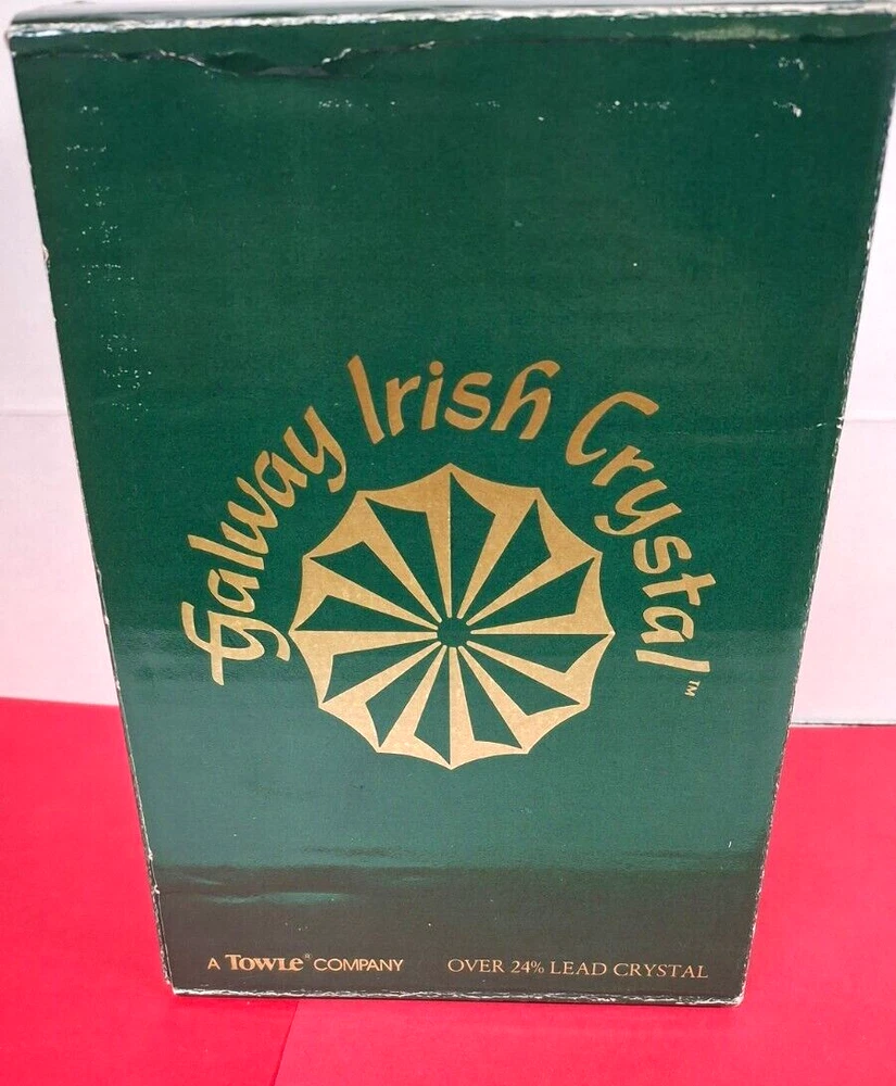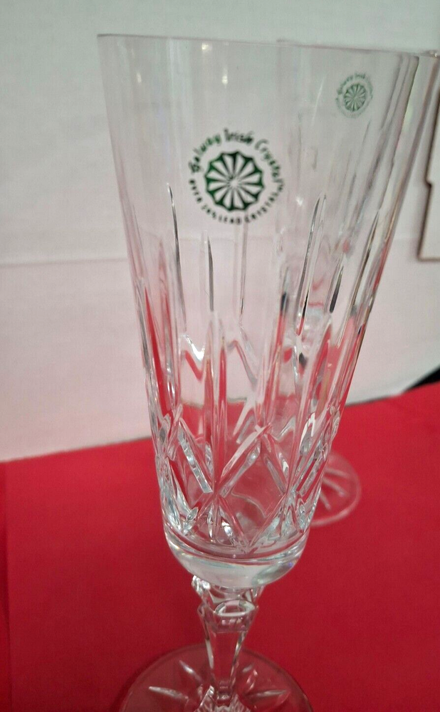 Brand New in Original Box. Model #25123 From Ireland Galway Irish Crystal Over 24% Lead Crystal. 4 Piece Set Fluted Champagne Glasses Vintage 1982 A Towle Company Box show signs of wear and sticker on bottom of box.