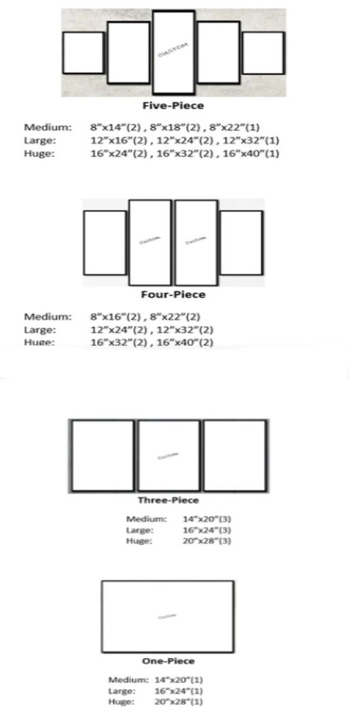 FREE SHIPPING - Painting comes carefully packaged with hard carton cardboard on the corners. Please allow 2-6 weeks for shipping. BRAND NEW - Straight from the manufacturer to your door! Great Gift - Fathers Day, Birthday, Mothers Day, Christmas, any occasion! Customer Service - We strive to offer the best product and service to our customers, please feel free to leave feedback as this greatly helps our business. Please ask any questions you may have and we will try to answer as soon as we can. Thanks Measurement in inches FIVE PIECE SIZES- MEDIUM: 8x14 x2 8x18x2 8x22x1 LARGE: 12x16x2 12x24x2 12x32x1 X-LARGE: 16x24x2 16x32x2 16x40x1 FOUR PIECE MEDIUM: 8x16x2 8x22x2 LARGE: 12x24x2 12x32x2 X-LARGE: 16x32x2 16x40x2 THREE PIECE MEDIUM: 14x20x3 LARGE: 16x24x3 X-LARGE: 20x28x3 ONE PIECE MEDIUM: 14x20x1 LARGE: 16x24x1 X-LARGE: 20x28x1 All sizes are in inches . All of our canvases our printed with HD printers for the highest quality prints. Each framed canvas is carefully individually hand-stretched onto each wooden frame. Each print is printed extended so it wraps around the wooden frame that gives it an art gallery look. Know that we will do our best to send you the canvas that you love. If for some reason you don't like what you receive know that we have a 30 day money back guarantee for any canvases that may arrive damaged through transit and that we stand by our products. Quite simply we value our customers and understand that our quality and customer service help us rise above the rest of our competitors. We are always available and will answer any questions as soon as possible seven days a week.