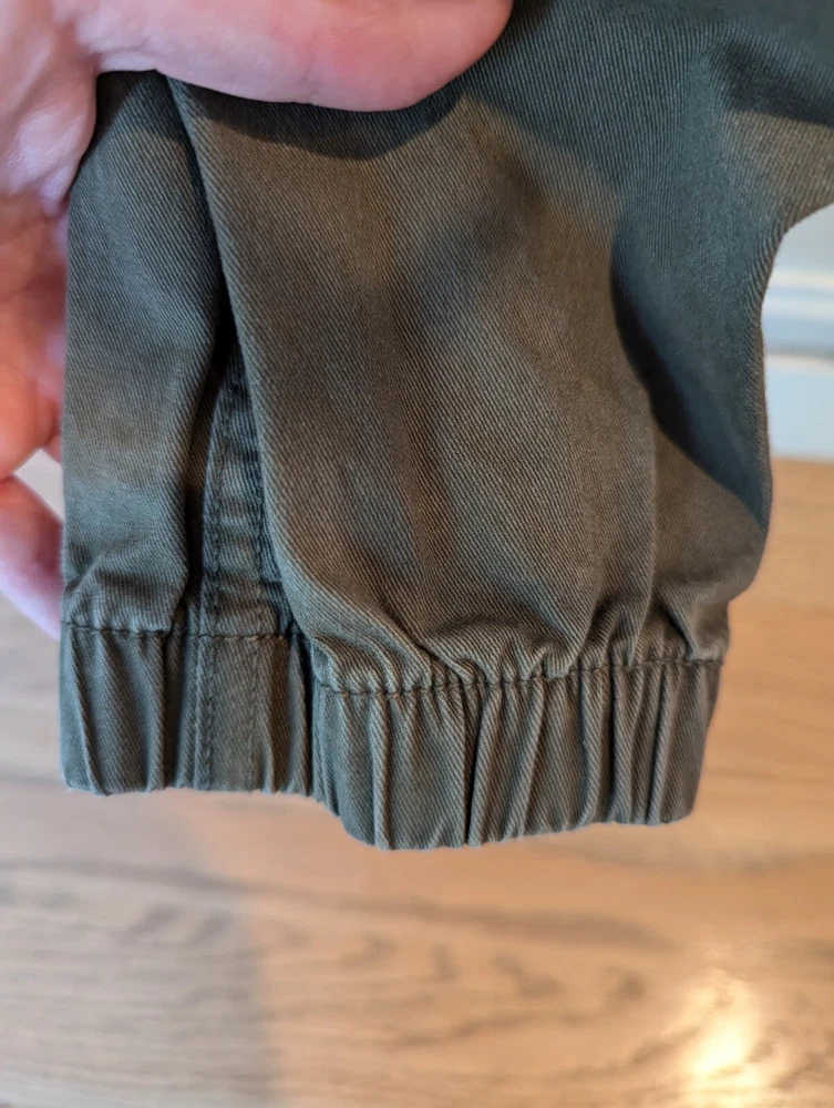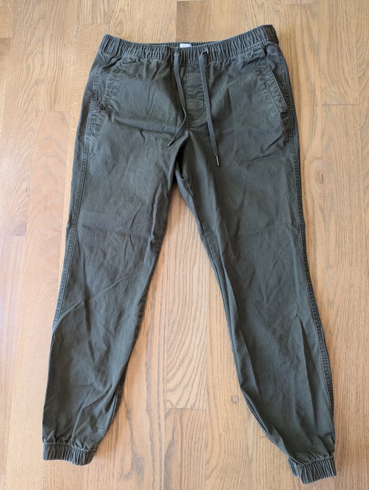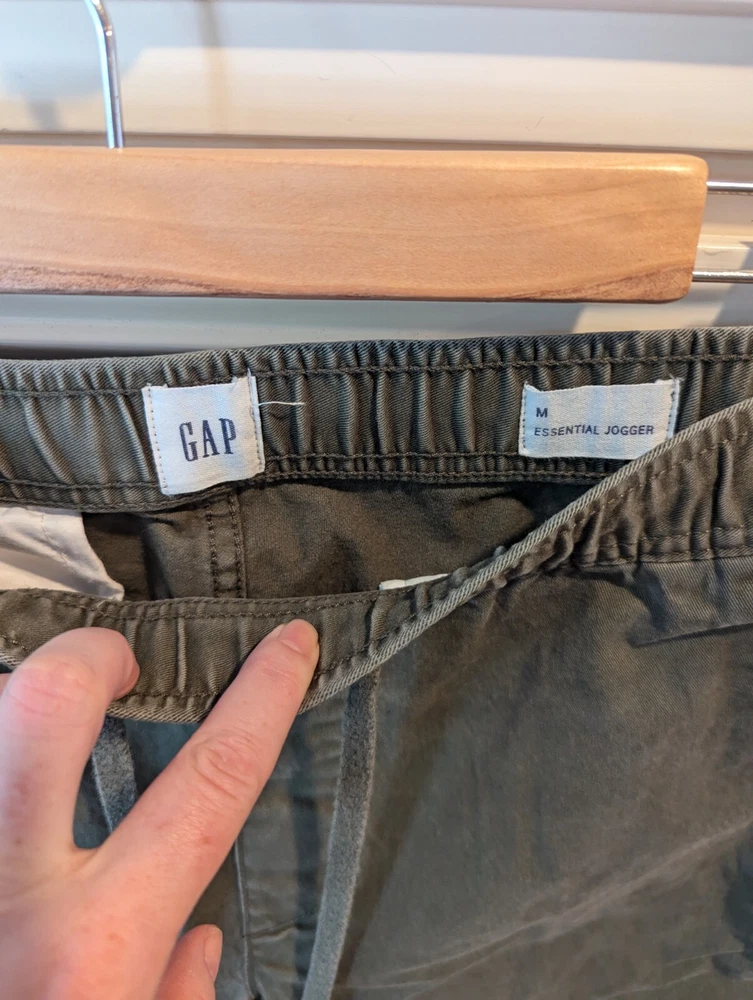 Good pre owned condition men's Gap Essentials Joggers in size Medium. Fabric is an olive colored twill. Ankles as re gathered, as shown in photos.
