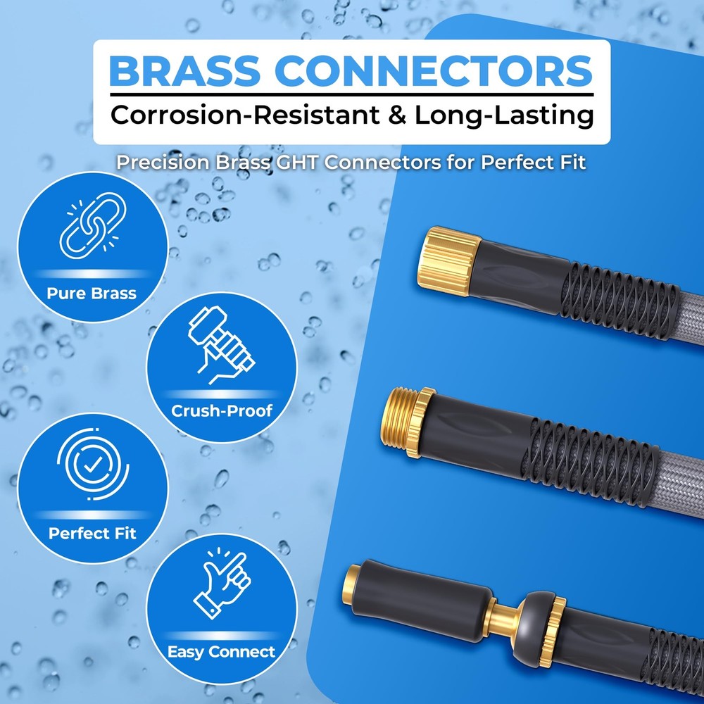GARDEN HOSE: Unmatched flexibility, durability, and flow. Its lightweight, full-length, Patent-Pending multi-layer design provides reliable, leak-performance for long-lasting utility. [This hose does NOT expand or retract] EFFICIENT WATERING & CLEANING: This kink-resistant full length hose makes gardening, vehicle washing, and cleaning tasks effortless. Featuring an ergonomic handle and a robust 5/8” middle layer, it delivers strong, steady water flow while remaining static in length, offering stability and reliability for various applications. HIGH PRESSURE TOLERANCE: Designed to work with most pressure washers and sprinklers, the hose excels in handling high-pressure water. Its durable construction with PVC, foam, and polyester outer webbing ensures it resists cracks and leaks, maintaining structural integrity even under intense use. UNIVERSAL COMPTABILITY: With standard GHT 3/4" brass connectors, this hose offers universal compatibility, seamlessly integrating with a wide range of faucets, , and nozzles. Providing efficient watering and cleaning without compatibility issues. [This hose does NOT expand or retract]