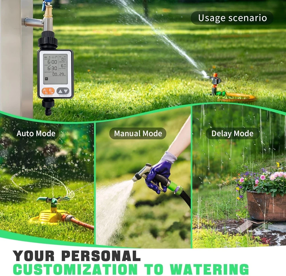 đ°ă10 Smart Watering FunctionsăBy setting a watering timer, it supports precise watering duration settings from 1 to 999 minutes. The cycle period can be finely adjusted to 1 hour or up to 32 days to meet the different watering needs of various plants. đ€ăInnovative and Energy-Saving Irrigation SystemsăEquipped with an environmental rainfall sensor chip, it automatically activates a 24/48-hour irrigation pause program when it rains, increasing water savings by 40% compared to traditional models. Manual mode allows you to water as needed, with watering times ranging from 1 minute to 8 hours, without affecting your set watering schedule. â ăWaterproof MaterialăThe water hose timer is made of waterproof material, and a sealing ring inside the battery cover effectively isolates moisture. The water hose timer connector incorporates 35% fiber, capable of withstanding high water pressures from 7.25 psi to 116 psi. đșă3.3-inch Large Capacity LCD DisplayăThis timer features a large 3.3-inch LCD display, clearly showing watering time, frequency, battery level, low battery reminders, and other information for convenient and quick adjustments. The user-friendly display design allows you to easily monitor and manage your watering needs. đčăMOLTI-SCEN WATE HASEREăăApplicationsăThis irrigation timer can be used in outdoor gardens, lawns, vegetable gardens, orchards, greenhouse misting systems, pool watering, bird bath drip irrigation, pet drinking water, and more. This timer meets the daily irrigation needs of flower enthusiasts, indoor gardeners, professional gardeners, horticulture suppliers, and farmers. đȘŽăHose TimerăăChild Lock ModeăThe child lock mode prevents children and pets from accidentally operating the sprinkler timer, ensuring their safety. We've optimized the program so it continues to work for 3 minutes after a power outage, ensuring you don't need to reprogram it after replacing the batteries. ăPackage Contentsă1 hose timer, 1 instruction manual, 1 quick start guide, 2 AA alkaline batteries (not included), 1 nipple connector, 1 roll of Teflon tape. This quick start guide will help you set the timer better. Remember, using this product can save water, thus saving on your watering costs. Product description Previous page Next page Auto watering timer Auto Rain Delay Previous page Next page 10 Independent Programs Upgrade Leak Design 116 Psi Max pressure