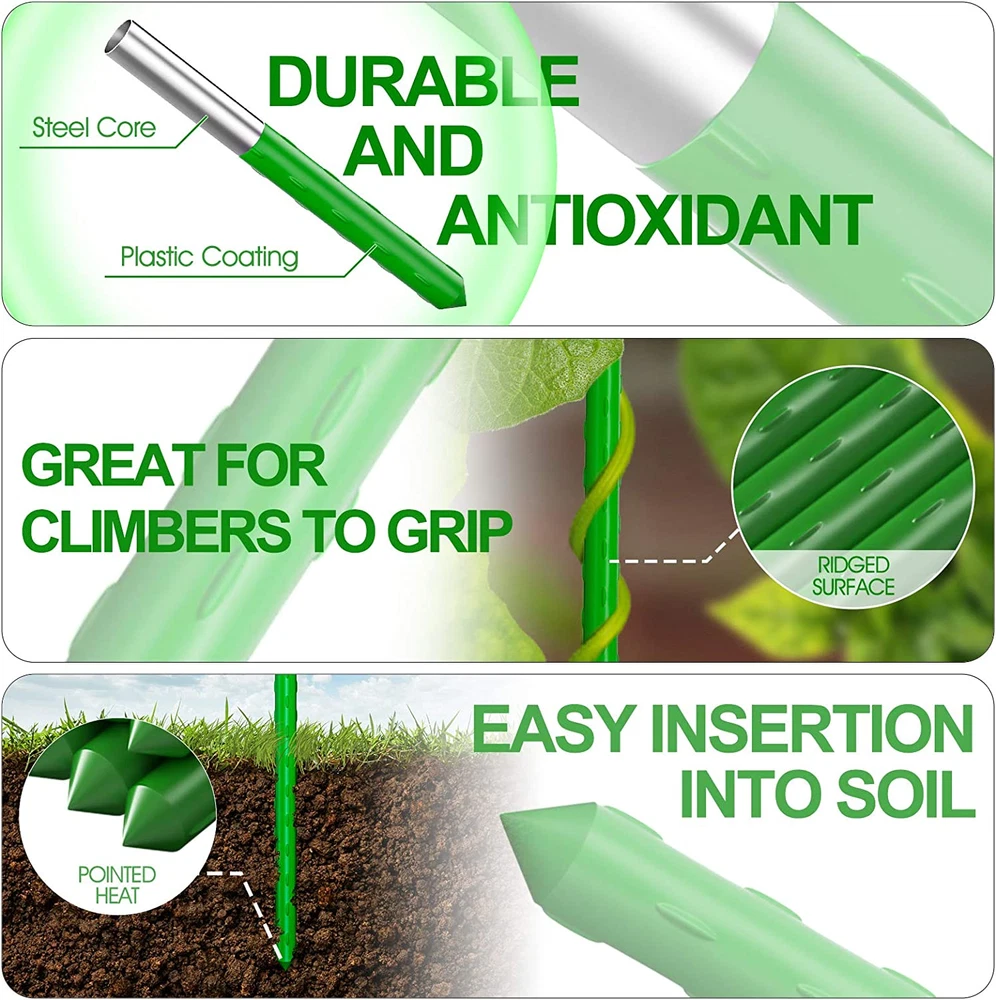 Size: 7/16- Inch diameter, 4Ft high. Each package contains 30 Pcs sturdy garden stakes for plants. Rustproof & Durable :Plastic coated steel tube, excellent performance in UV resistance and chemical resistance. Longer life cycle than bamboo stakes and wood stakes. Ridged surface: Perfect for training plants, ridged surface are great for climbers to grip at they. Works for young plant supporting, eggplant stakes, tomato stakes, pole bean stakes, tree stakes and great for building trellises or teepees for natural climbing plant support . Easy install: Easy to cut the length as you want, The tapered end is better inserted into the ground. Application: Use sturdy stretch to secure branches to support, Allows plants to grow through the sturdy stake, Secure trees, shrubs, vines and other plants. Suitable for tomato stakes, cucumber stakes, grapes stakes, etc. Product Description WANELIR sturdy garden stakes for plants Advantages: Reusable and hard wearing Weatherproof Ridged surface for climbers to grip Metal with Non-Toxic Plastic Coated Information: Material: Plastic coated steel core Condition: 100% New Color: Green 5 star collection plant supports for the garden. we are engaged at providing high quality products to customers in long term. With Our plant stakes, make the plant grow better and Increase Crop Yield. Application It works for tomato stakes, young plant supporting, eggplant stakes, pole bean stakes, tree stakes and great for building trellises or teepees for natural climbing plant support.
