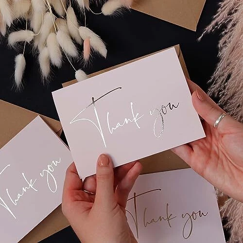 Premium Quality Thank You Cards for all occasions - Weddings, Baby Shower, Bridal Shower, Small Business, Graduation, Baptisms, Birthday, Funerals, Engagement Parties etc PREMIUM QUALITY – Our blush pink thank you cards with envelopes are pre-creased and printed on thick 300 gsm smudge-free card. All greeting cards come in a durable box for easy storage. ENVELOPES & STICKERS INCLUDED - Each set contains 30 thank you cards together with 30 kraft envelopes and 40 stickers. All the envelopes are pre-glued, making them easy to seal. The stickers with matching silver foil design are provided for additional adhesion. MODERN & ELEGANT –The minimalist design with silver foil text provides a meaningful way to say thanks. Our thank you cards are ideal for personal or professional use. PERFECT SIZE - Our bulk thank you cards measure 5x3.75” when folded. The matte cards are blank inside allowing plenty of space to share your sincere thanks. CELEBRATE ANY OCCASION - Keep a pack of thank you cards with envelopes on hand, ready for weddings, engagement parties, birthday parties, baby showers, bridal showers, business events, religious holidays, anniversaries, funerals, customer appreciation, or any other occasion.