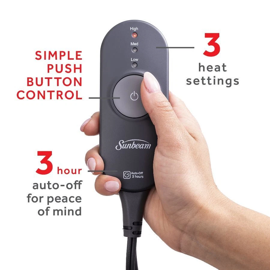 Snuggle up with the Sunbeam Fleece Electric Heated Throw to beat those winter chills and warm you up on cold nights. Indulge yourself with its comfy and cozy fleece fabric to keep you toasty and comfortable while you unwind. The stylish color adds a accent to any decor. This 50” x 60” electric throw makes a great accessory while relaxing on the couch, bed or your favorite chair. It includes an easy-to-use push button controller with 3 personalized heat settings, allowing you to get just the right temperature, and a 3-hour auto-shut off feature for added peace of mind. The Electric Heated wires are made with premium components and includes a wire technology that senses and adjusts for continuous heat and safe operation. When ready to clean, simply detach the controller from the throw and place into the washing machine and tumble dry for easy care, stays silky soft after many washes. You can rest easy knowing it was built to last and includes a limited 5-year warranty. On Dec 26, 2024 at 18:45:56 PST, seller added the following information: