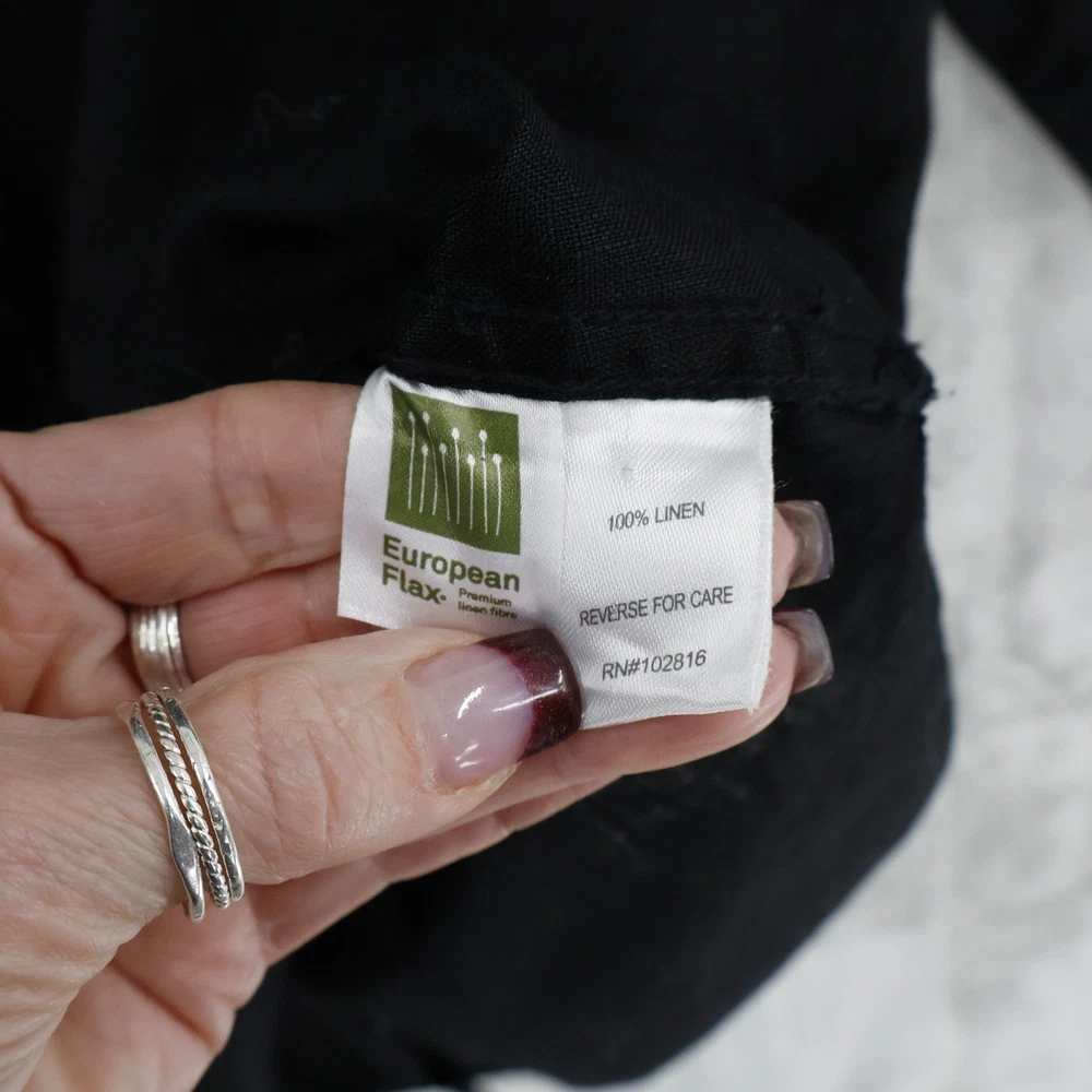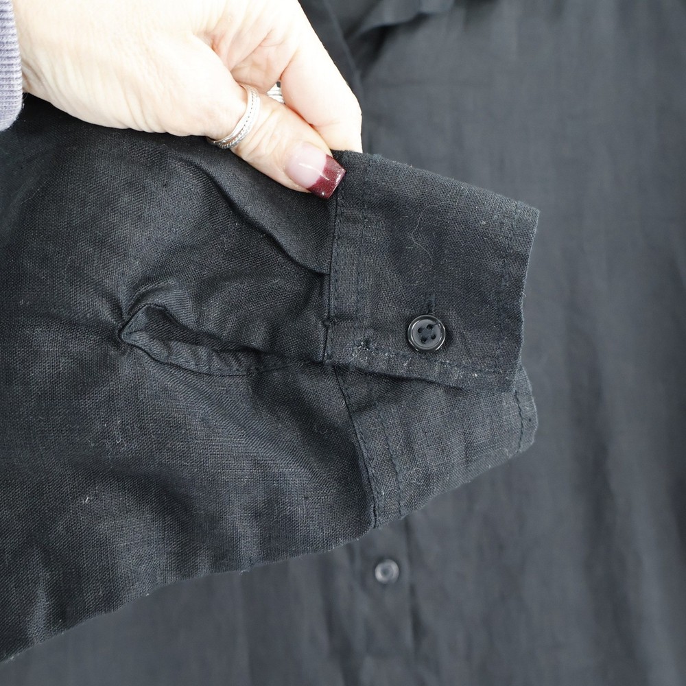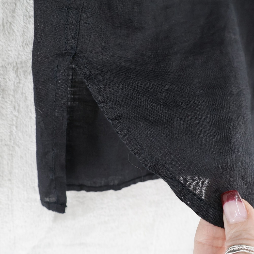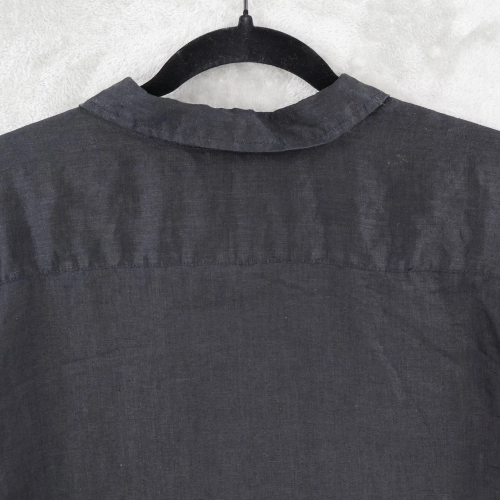 Classic button-down tunic crafted from premium European Flax linen, offering a breathable and lightweight feel. This long-sleeve shirt features a relaxed silhouette with a pointed collar, buttoned cuffs, and a curved hem with side slits for easy movement. The solid black color and clean lines make it a versatile staple for layering or wearing as a standalone piece. Measurements: • Bust: 23" • Length: 34" Brand: Garnet Hill Material: 100% Linen Color: Black Pattern: Solid Sleeve Length: Long Sleeve Neckline: Collared Closure: Button Style: Tunic / Button Down Fit: Relaxed Features: Side Slits, European Flax Certified Occasion: Casual, Workwear, Travel, Resort, Boho, Bohemian Season: Spring, Summer, Fall Excellent pre-owned condition, see photos for details. 7604 •Model image(s) are for style reference only and may not represent the garment fully.