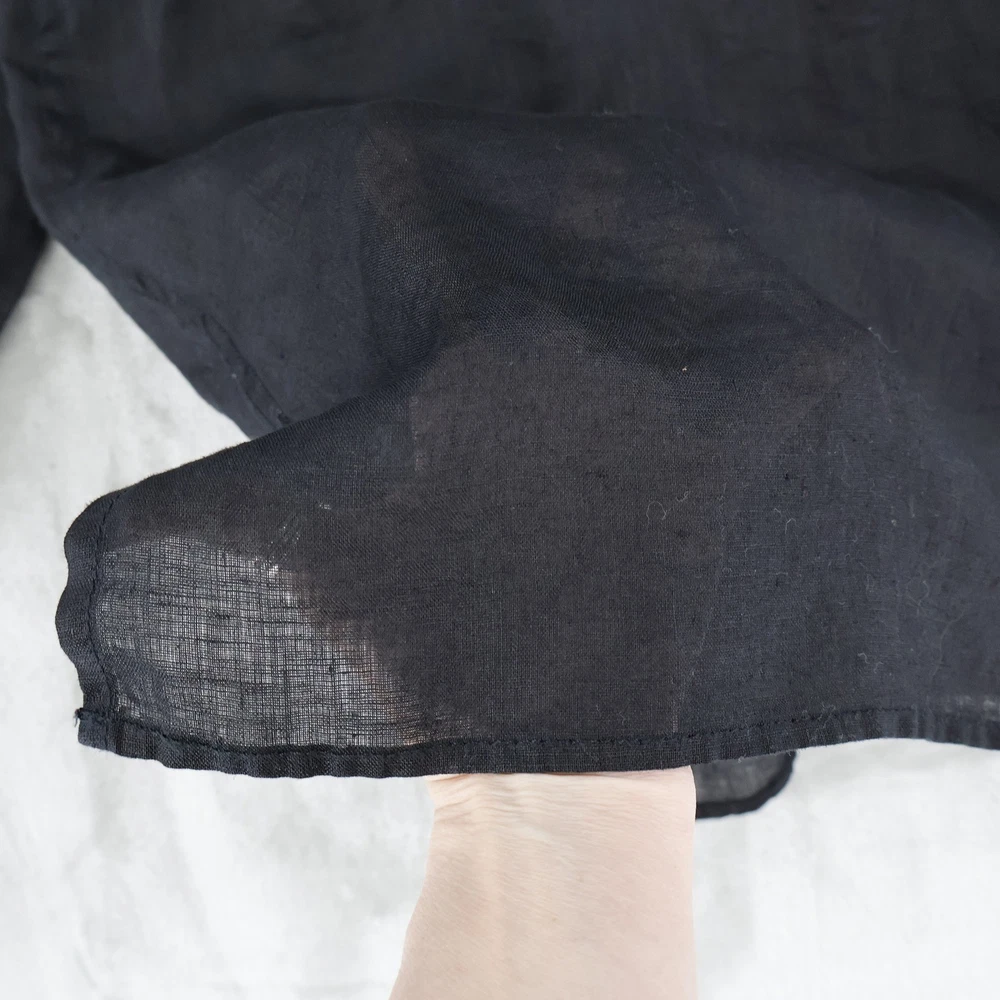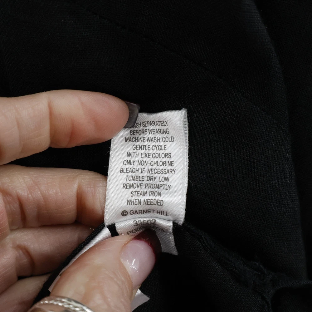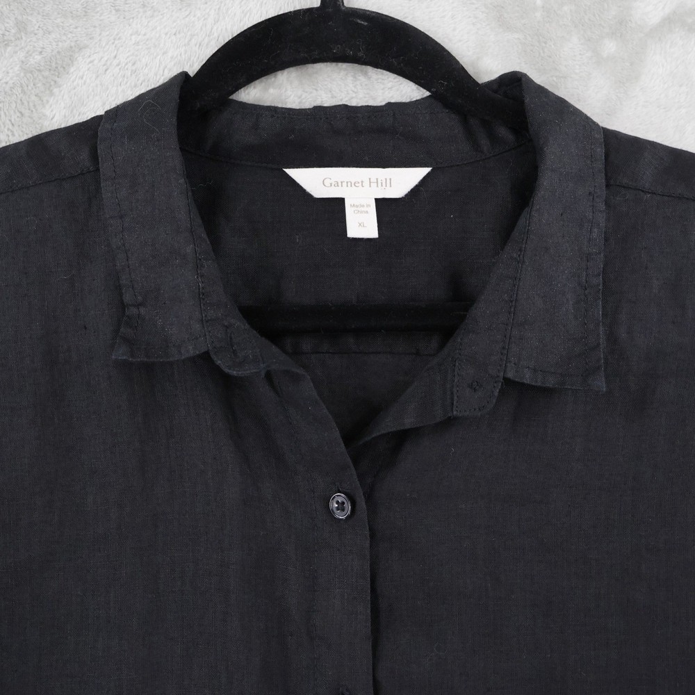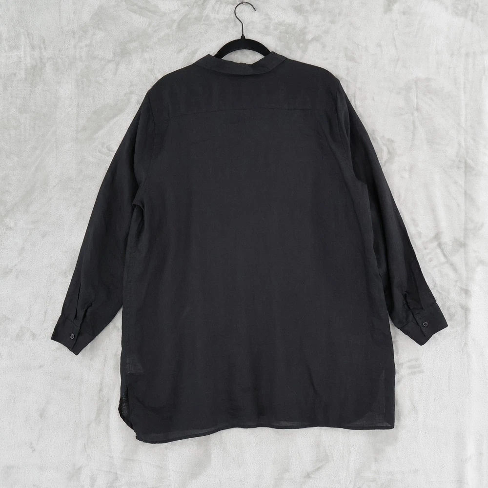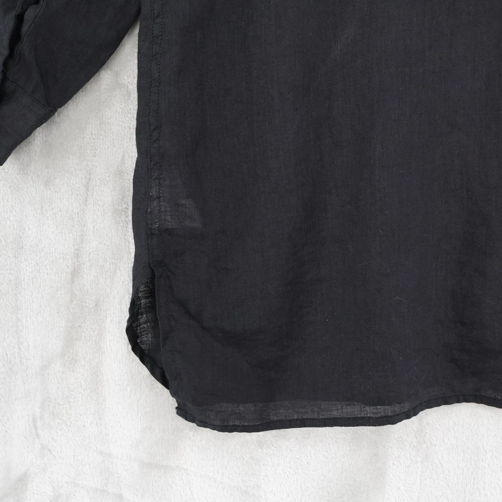 Classic button-down tunic crafted from premium European Flax linen, offering a breathable and lightweight feel. This long-sleeve shirt features a relaxed silhouette with a pointed collar, buttoned cuffs, and a curved hem with side slits for easy movement. The solid black color and clean lines make it a versatile staple for layering or wearing as a standalone piece. Measurements: • Bust: 23" • Length: 34" Brand: Garnet Hill Material: 100% Linen Color: Black Pattern: Solid Sleeve Length: Long Sleeve Neckline: Collared Closure: Button Style: Tunic / Button Down Fit: Relaxed Features: Side Slits, European Flax Certified Occasion: Casual, Workwear, Travel, Resort, Boho, Bohemian Season: Spring, Summer, Fall Excellent pre-owned condition, see photos for details. 7604 •Model image(s) are for style reference only and may not represent the garment fully.