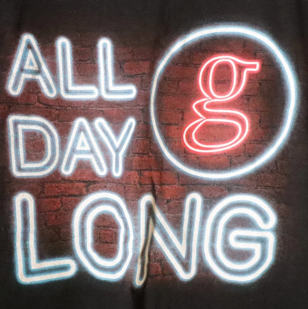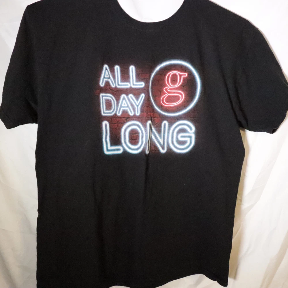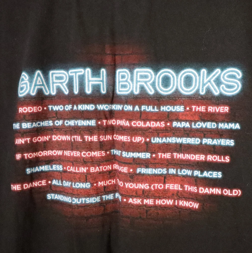 This Garth Brooks All Day Long concert t-shirt is a must-have for any fan of the country music legend. The black shirt features the concert title and artist name in bold white letters, making it a stylish addition to any wardrobe. Made from comfortable cotton material, this short-sleeved crew neck t-shirt is perfect for casual wear or for attending concerts. The XL size is suitable for men of all sizes, and the shirt is sure to become a favorite in any fan's collection.