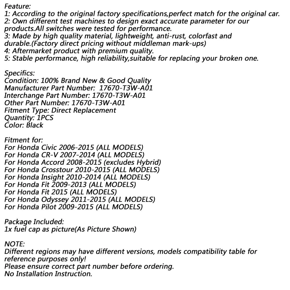 You may also like Cafe Honda BMW 2.4 9L/ Racer Custom Gas Yamaha Fuel Gallon Tank US For Universal 76.85 USD Free shipping 1/2" NPTF Fuel Gas Tank Rollover Safety Vent Valve Assembly 5/16 Hose 18.85 USD Free shipping Fuel Gas Tank Fill Cap 42031FE000 For Impreza & Forester Wrx STi 2005-2008 20.85 USD Free shipping Fuel Tank Filler Hose 7721335380 For Toyota Land Cruiser Prado GRJ120 AV 21.85 USD Free shipping Fuel Filler Hose Neck to Tank W/Clamps For TJ Wrangler 2003 2004-2006 D01 19.85 USD Free shipping Fuel Gas Tank Fill Cap 42031SC000 For Impreza WRX & STi Forester 2011-2014 21.85 USD Free shipping Fuel Tank Cap Cover Assembly GT329 23368720 For Envision Malibu Acadia Equinox M 17.85 USD Free shipping Motorcycle 5L Plastic Jerry Cans Gas Diesel Fuel Tank w/ Lock SUV ATV Scooter 77.85 USD Free shipping Fuel Level Control Module Sendin Unit 68141873AA For RAM 1500 5.7L 2011-2017 25.85 USD Free shipping Feature: 1: According to the original factory specifications,perfect match for the original car. 2: Own different test machines to design exact accurate parameter for our products.All switches were tested for performance. 3: Made by high quality material, lightweight, anti-rust, colorfast and durable.(Factory direct pricing without middleman mark-ups) 4: Aftermarket product with premium quality. 5: Stable performance, high reliability,suitable for replacing your broken one.Specifics: Condition: 100% Brand New Good Quality Manufacturer Part Number: 17670-T3W-A01 Interchange Part Number: 17670-T3W-A01 Other Part Number: 17670-T3W-A01 Fitment Type: Direct Replacement Quantity: 1PCS Color: BlackFitment for: For Honda Civic 2006-2015 (ALL MODELS) For Honda CR-V 2007-2014 (ALL MODELS) For Honda Accord 2008-2015 (excludes Hybrid) For Honda Crosstour 2010-2015 (ALL MODELS) For Honda Insight 2010-2014 (ALL MODELS) For Honda Fit 2009-2013 (ALL MODELS) For Honda Fit 2015 (ALL MODELS) For Honda Odyssey 2011-2015 (ALL MODELS) For Honda Pilot 2009-2015 (ALL MODELS)Package Included: 1x fuel cap as picture(As Picture Shown)NOTE: Different regions may have different versions, models compatibility table for reference purposes only! Please ensure correct part number before ordering. No Installation Instruction. -About US Founded in 2012, VIPJQ have professional development and sales, and are involved in various products, providing customers with various high-quality products. Since its establishment, VIPJQ has always adhered to the service concept of "customer first" and the management concept of "pursuit of quality", and is committed to providing customers with high-quality original designs. We commit to provide you the best innovative, quality products & professional services with competitive prices. We value every customer, and we look forward to providing solutions for your business needs to help your business achieve its goals, please contact us immediately! We are all about you! We are a Japanese seller,but with large warehouse in USA. We are profesional on Auto Parts,Car Parts,Motorcycle Parts,3C,other hot sale items and so on. We aim to provide to customers high quality product and best service. -About Shipment&Returns The item usually will be dispatched within 3 days after you ordered.All are free shipping. And it usually takes 3-10 working days to delivery depends on buyers' address or other majeure on the way. If you are not satisfied with the items and want to return the item,we hope you could message us first,we will give you the return details, we think we could give you the best service to save your time and money.Thank you. -About Feedback&Customer Service If you are enjoy your shopping here,not only enjoy the items but also the service,we are appreciate you could give us a 5-star feedback. If you are not satisfied with the item,before you give us the negative feedback,we hope we could give you the best solution through our commutication. We think we could do it if you give us the chance.Thank you.
