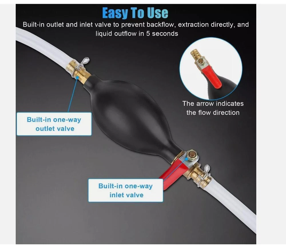 product Store Home Shipping Payment Warranty and Guarantee Other Policies Item Description ⭐ Product description: Type:Hand Siphon Pump Specifications : Hose length: 198 cm Hose outer diameter: 10.8 mm Hose inner diameter: 8.5 mm Black accessory: 14.2 cm (L) × 4.6 cm (W), inner diameter 8.3 mm Small accessory: Outer diameter 21 mm, inner diameter 9.6 mm Features:Premium Quality,Must Need,Easy To Use Fit for:Air, gas, coolant, fuel, petrol, diesel, gasoline, oil, water, and other common liquids. ⭐ Suitable for: Various vehicles without anti-theft filter nets, such as brush cutters, lawn Mowers, snowblowers, hedge trimmers, etc. ⭐ Package Includes 1xHose 1 x Suction sphere 2xHose Clips Item Pictures More Shipping 1.We ship to worldwide,except Hong Kong,Taiwan,Macao,China,Guemsey,Puerto Rico and we do not ship to APO/FPO, etc. 2.Item will be shipped within 3 business day on payment received. 3.Items are shipped from China using Airmail,reach most of countries within 10-20 business days. 4.sDelivery time depends on destination and other factors,it may takes up to 20 business days. Payment 1.We accept Paypal only. 2.All major credit cards are accepted through secure payment processor PayPal. 3.Payment must be received with 7 days of auction closing 4.If you have bought multiple items from us,you can send us one payment for all the items instead of paying for them individually. When you click the Pay Now button,eBay will automatically determine if there are other items you have won of purchased from us and will combine them for your review. Warranty and Guarantee 1.One year warranty!30 days money back!Buy with confidence! 2.If you are not satisfied when you receive your item,please return it within 30 days for a replacement or money back.Please contact us before you return the item. 3.If item is defective in 3 months,we will send you a replacement without extra charger,or offer refund after we receive the defective item. 4.If item is defective after 3 months,you can still send it back to us.We will send you a new one after after receiving the defective item,but you have to pay the extra shipping fee. Other Policies 1.We are not responsible for any custom duty or import tax. 2.We will leave Positive Feedback after receiving the payment.Please contact us if you are not satisfied with the item after receiving it. 3.All emails will be answered within 1 business day.If you do not receive our reply,please kindly re-sent your email and we will reply you as soon as possible. 4.Serious Buyer Only!Please place bid only if you agree with all the terms.