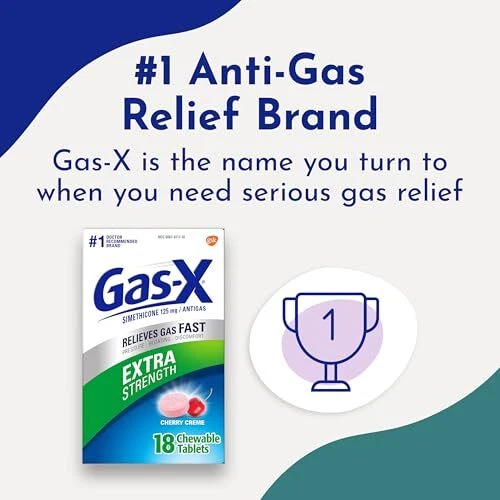 From the number 1 Anti-Gas Relief Brand comes Gas-X Extra Strength Chewable Gas Relief Tablets with Simethicone 125 mg deliver fast relief of gas pressure, bloating and discomfort. These chewable tablets go to work in minutes, rescuing you from embarrassing situations and helping you get back to feeling like yourself. Gas-X uses 125 mg simethicone to break up gas bubbles in your stomach and intestines. Once this trapped gas is broken down, your body can deal with the gas properly. These portable and easy to take simethicone chewable tablets come in tasty cherry flavor. Adults and children 12 years of age and older may chew one or two antigas chewables as needed, not to exceed four gas tablets in 24 hours unless directed by a doctor. Gas-X is the name you turn to when you need serious gas relief. Trust Gas-X, the number 1 doctor recommended OTC anti-gas product.* *ProVoice Survey fielded from March 1, 2020 to February 28, 2021, and recording recommendations for OTC Anti-Gas products One package of 18 cherry flavored Gas-X Extra Strength Chewable Gas Relief Tablets with Simethicone 125 mg; number 1 Anti-Gas Relief Brand Gas-X simethicone gas relief tablets provide fast gas and bloating relief Gas-X antigas chewable simethicone tablets go to work in minutes to provide bloating and gas relief, rescuing you from embarrassing situations and helping you get back to feeling like yourself Contains 125 mg of simethicone for fast gas relief Simethicone extra strength gas relief tablets are easy to take and come in delicious cherry flavor Gas-X is the #1 doctor recommended OTC anti-gas product Adults and children 12 years of age and older may chew one or two gas relief chewable tablets as needed, not to exceed four tablets in 24 hours Gas-X is the name you turn to when you need serious gas relief HSA and FSA eligible product