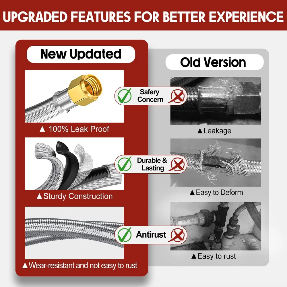 propane hose propane gas line propane hose extension propane line gas line hose lp gas hose propane extension hose 3/8 propane hose 120 gallon propane tank propane conversion kit propane heater extend a stay rv propane kit propane to natural gas conversion kit 3/4 gas flex line propane hose quick connect hose extension natural gas hose 30 lb propane tank propane quick connect hose quick connect propane hose propane hose adapter 1lb to 20lb rv quick connect propane hose long hose propane gas line propane conversion kit gas hose gas pipe lp gas hose natural gas hose propane hose gas line propane to natural gas conversion kit propane fire hose propane extension hose propane line 3/8 propane hose gas line hose rv propane hose gas grill parts propane tank hose replacement parts for gas grills rv grill grill parts high pressure hose propane fire pit kit outdoor heater replacement parts propane heater outdoor 3/4 gas flex line dryer gas line gas heater outdoor torch hose bbq torch 3/8 marine fuel line propane hose propane hose extension propane extension hose 3/8 propane hose propane hose quick connect propane gas line propane hose with regulator propane torch hose quick connect propane hose mr heater propane hose extend a stay rv propane kit propane fittings quick connect propane hose for rv to grill propane line rv propane hose lp gas hose hose extension gas line hose propane hose adapter propane fittings & adapters propane quick connect hose propane tree heated hose for rv grill torch rv quick connect propane hose gas line bbq torch 120 gallon propane tank Upgraded 20FT 350 PSI high-pressure Propane extension Hose: This Propane Extension Hose upgrade to come with powerful 6 different couplings adapter fitting: 3/8" NPT Male x 3/8" NPT Male; 3/8" Flare Male x 3/8" Flare Male; 3/8" NPT Male x 3/8" Flare Male; 1/2" Female NPT x 3/8" Flare Male; 1/4" NPT Male x 3/8" Flare Male; 1/2" NPT Male x 3/8" Flare Male. These conversion connection extand the outdoor appliance to propane or LP gas line by 20 FT 3/8" Female Flare propane hose Premium Material: 3/8" female flare fittings on both ends and 6 different types of adapters fittings kit of this 3/8" propane hose are made of 100% Solid Brass to ensure secure and durable for long-lasting to use. The 3/8” Female Flare propane hose is made of durable stainless steel braided with anti corrosion, anti-aging, air tightness, heat-resistance, flexibility features. This propane extension hose with CSA Certification, ensures air tightness and stability. High Pressure: 350 PSI. Compatible and Wide Application: This 3/8" propane hose adapter kit hose has female 3/8" ends on both sides, connect an appliance equipped with a 3/8" male flare fitting. For extending the propane tank line on your LP appliance and fire pit table. Compatible with RV, portable fire pit, gas grill, stove, propane heater, griddle, propane smoker, propane generator, portable generator, burner and more. Add 1* Buckle Velcro to hang and 2* Small Velcro to fix anywhere. Standard Connector: This 3/8" female flare fitting x 3/8" female flare fitting propane hose with 5 different types conversion coupling adapters. Excellent 3/8" propane hose conversion adapter kit easy to store and carry, also flexible to use, saves space. This 20 Feet braided stainless steel high pressure propane extension flexible hose with standard connectors kit takes all your worries away. Best ideal for RVs, travel trailers. Packaging and 100% - Satisfaction Guarantee: The kit includes: 1* 20FT 350 PSI High Pressure Propane extension Hose + 5* Couplings Adapter Fitting (3/8" NPT Male x 3/8" NPT Male, 3/8" Flare Male x 3/8" Flare Male, 3/8" NPT Male x 3/8" Flare Male, 1/2" Female NPT x 3/8" Flare Male, 1/4" NPT Male x 3/8" Flare Male) +1* Roll Sealing Tape + 1* Buckle Velcro + 2* Small Velcro. If you're not satisfied with this item at any time within 1 years after purchased, we'll provide a refund or replacement.