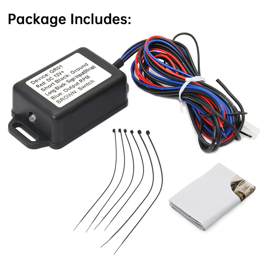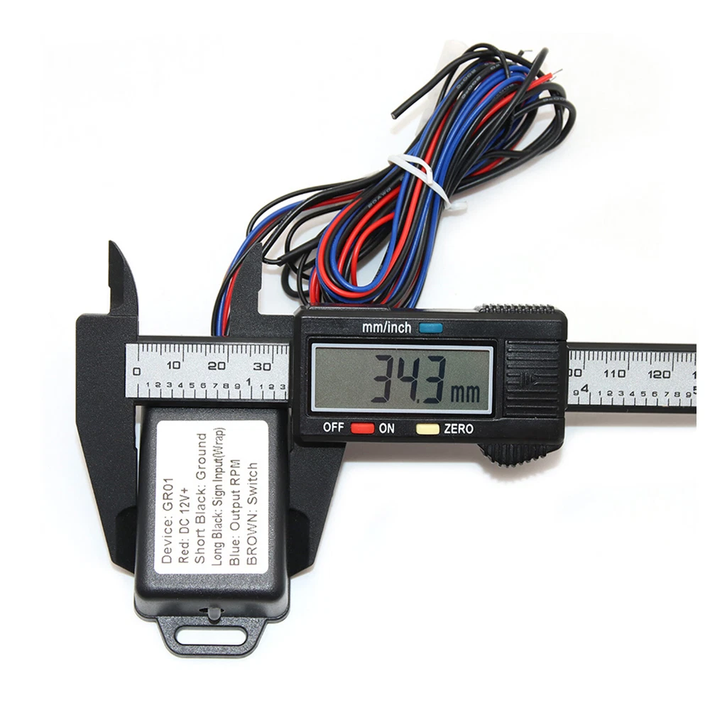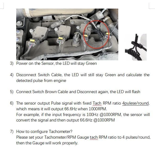 Model: GR01 1.Cable Definition RED: Power Supply 12V DC BLACK: Power GND BLACK/BROWN (1.6m): Input Signal Cable BLUE: Output Signal (fixed 4pulses/round rpm ratio) BROWN: Switch Control Cable 2.Configure Steps: 1)Connect Switch Cable to enter in setting mode 2)Find the Ignition Coil of your Gasoline Engine, normally it’s close to Spark Plug, which can be easily found from your engine/car/vehicle user guide. Wrap the input signal cable 5~8 round across the ignition coil cable, and then tighten like below: 3)Power on the Sensor, the LED will stay Green 4)Disconnect Switch Cable, the LED will still stay Green and calculate the detected pulse from engine 5)Connect Switch Brown Cable and Disconnect again, the LED will flash 6)The sensor output Pulse signal with fixed Tach RPM ratio 4pulese/round, which means it will output 66.6Hz when 1000RPM. For example, if the input frequency is 100Hz @1000RPM, the sensor will convert the signal and then output 66.6Hz @1000RPM 7)How to configure Tachometer? Please set your Tachometer/RPM Gauge tach RPM ratio to 4 pulses/round, then the Gauge will work properly. On Apr 7, 2025 at 06:50:56 PDT, seller added the following information: