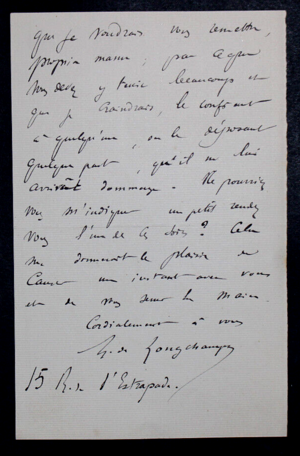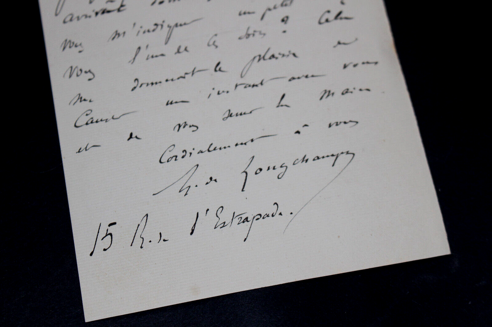 Lettre autographe signée de Gaston Albert Gohierre DE LONGCHAMPS adressée à Charles-Ange LAISANT État: Voir photos pour plus de détails. Dimensions : 11,3 x 17,6 cm. 2 pages. Gaston Albert Gohierre de Longchamps, né le 1ᵉʳ mars 1842 à Alençon et mort le 9 juillet 1906 à Paris, est un mathématicien français. Ses travaux portent sur la théorie des nombres, sur les courbes algébriques ou sur la géométrie du triangle. Wikipédia Satisfait ou remboursé. Si vous n'êtes pas entièrement satisfait, je reprends la marchandise avec retour à ma charge pour l'Europe et à la charge de l'acheteur pour le reste du monde. N’hésitez pas à visiter ma boutique et affiner vos recherches en fonction des catégories qui vous intéressent. Ma boutique L'Art Délivré. Lettres autographes, vieux papiers, livres anciens, photographies, gravures, timbres… Nous expertisons et/ou rachetons dans toute la France vos lettres, collections de lettres et livres anciens. Merci de votre visite. Jérôme KAYSER. Lettre autographe signée de Gaston Albert Gohierre DE LONGCHAMPS adressée à Charles-Ange LAISANT Gaston Albert Gohierre de Longchamps, né le 1ᵉʳ mars 1842 à Alençon et mort le 9 juillet 1906 à Paris, est un mathématicien français. Ses travaux portent sur la théorie des nombres, sur les courbes algébriques ou sur la géométrie du triangle. Wikipédia Si vous n'êtes pas entièrement satisfait, je reprends la marchandise avec retour à ma charge pour l'Europe et à la charge de l'acheteur pour le reste du monde. N’hésitez pas à visiter ma boutique et affiner vos recherches en fonction des catégories qui vous intéressent. Ma boutique Lettres autographes, vieux papiers, livres anciens, photographies, gravures, timbres… Nous expertisons et/ou rachetons dans toute la France vos lettres, collections de