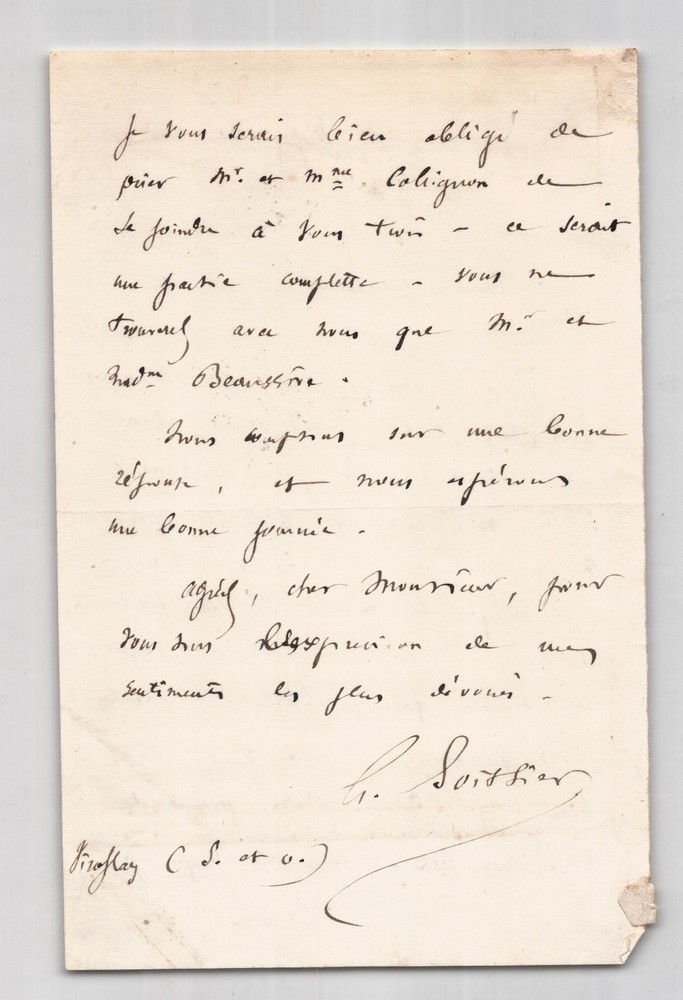 Free eBay listing template designed by dewiso.com Gaston Boissier. Lettre autographe signée Historien et philologue français Lettre autographe signée de Gaston Boissier, datée du 30 mai à Viroflay. Rédigée à l'encre noire sur un feuillet de papier vergé. Il invite son correspondant à un diner précédé d'une promenade dans leurs bois. Dimensions : 10,8 x 16,8 cm État : T races d'onglet au dos, sinon bel état de conservation. Voir photos et description pour plus de détails. Nombre de pages : 2 pages Gaston Boissier Marie Louis Antoine Gaston Boissier, né à Nîmes le 15 août 1823 et mort à Viroflay le 10 juin 1908, est un historien et philologue français. Wikipédia Contactez-nous Lettres autographes, vieux papiers, livres anciens, photographies, gravures, timbres... Nous expertisons et/ou rachetons dans toute la France vos lettres, collections de lettres et livres anciens. Une question ? Une précision ? N'hésitez pas à me contacter Paiement Sont acceptés les paiements par eBay, par PayPal, par virement ou par chèque. Envoi Envoi soigné dans un emballage rigide et étanche sous trois jours. Prévoir les délais postaux habituels en plus. Retour Satisfait ou remboursé. Si vous n'êtes pas entièrement satisfait, retour à la charge du vendeur pour l'Europe. À la charge de l'acheteur pour le reste du monde. Il invite son correspondant à un diner précédé d'une promenade dans leurs bois. État : Traces d'onglet au dos, sinon bel état de conservation. Voir photos et description pour plus de détails. Marie Louis Antoine Gaston Boissier, né à Nîmes le 15 août 1823 et mort à Viroflay le 10 juin 1908, est un historien et philologue français. Wikipédia Lettres autographes, vieux papiers, livres anciens, photographies, gravures, timbres... Nous expertisons et/ou rachetons dans toute la France vos lettres, collections de lettres et livres anciens. Envoi soigné dans un emballage rigide et étanche sous trois jours. Prévoir les délais postaux habituels en plus. Satisfait ou remboursé. Si vous n'êtes pas entièrement satisfait, retour à la charge du vendeur pour l'Europe. À la charge de l'acheteur pour le r