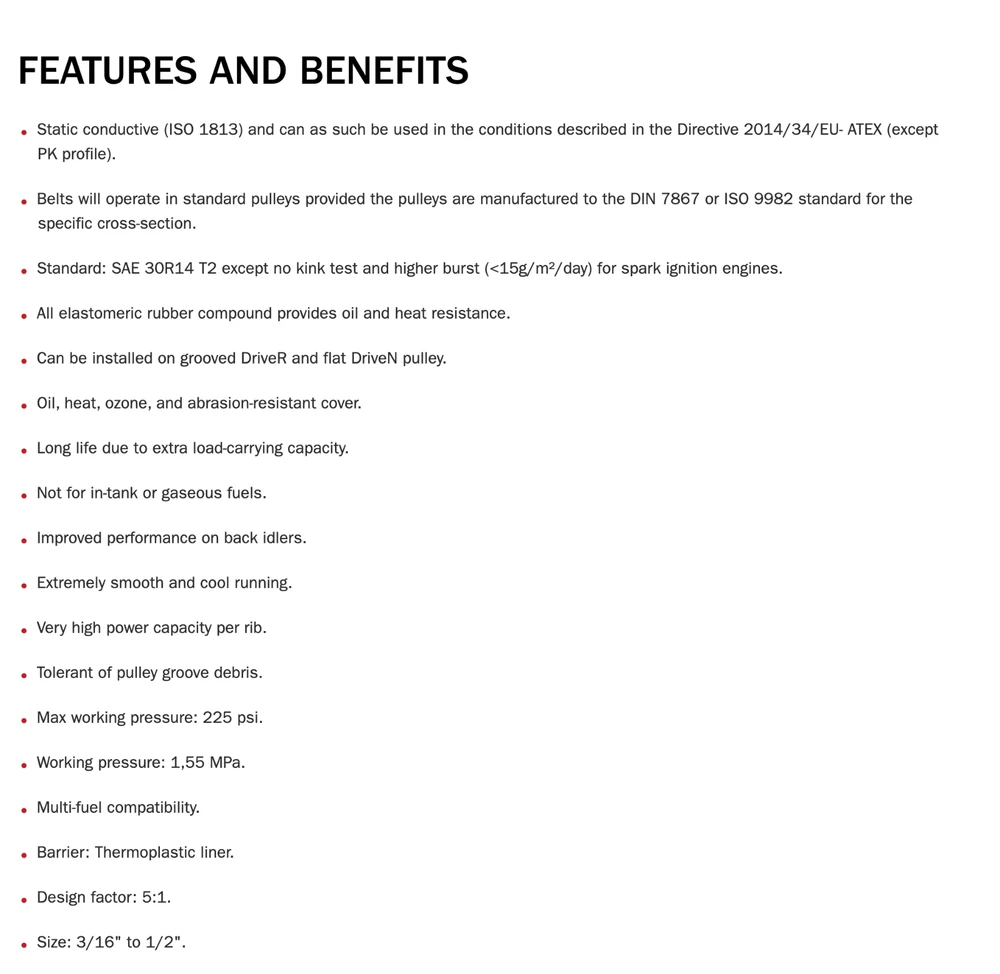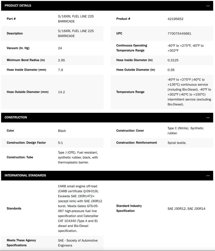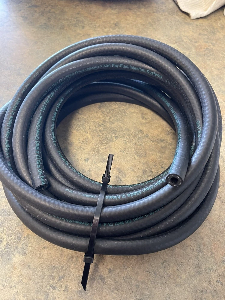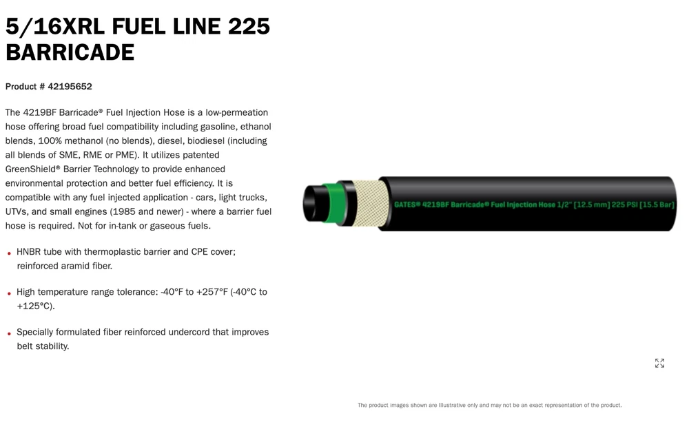 This auction is for one 25-foot piece of Gates Barricade Fuel Injection (5/16") Hose. If ordering a quantity of 2, you will receive one continuous 50-foot piece, an order of 3 will be one 75-foot piece, etc. NOTE: This hose is NOT shipped on a reel. This hose is offered at a bulk price (over 30% savings) for customers who dont need a storage reel or just want to refill an empty reel they already have. This hose is brand-new production (2021). All hose is in-stock and ready to ship. Who We Are: Military family based in Colorado Springs, CO with ability to purchase genuine Gates hose at wholesale prices. We purchase bulk rolls of this hose and allow our customers to buy exactly what they need at prices that are approximately half of those found at auto parts stores. Note: The 25' cut shown in the first photo is a carbureted hose, and this listing is for a 25' cut of 5/16" fuel injection hose. This photo is added to show how your item will be shipped, wrapped and bound in a coil. This hose is cut to order and non-returnable. Please verify you are ordering the correct size for your application. See my other auctions for additional sizes available. The 4219BF Barricade® Fuel Injection Hose is a low-permeation hose offering broad fuel compatibility including gasoline, ethanol blends, 100% methanol (no blends), diesel, biodiesel (including all blends of SME, RME or PME). It utilizes patented GreenShield® Barrier Technology to provide enhanced environmental protection and better fuel efficiency. It is compatible with any fuel injected application - cars, light trucks, UTVs, and small engines (1985 and newer) - where a barrier fuel hose is required. Not for in-tank or gaseous fuels. Our five-layer Greenshield® Barrier Technology cuts vapor loss and saves fuel, making it safe for the environment and fuel efficient. Barrier tube - provides high heat and corrosive liquid resistance. Greenshield® barrier - patent-pending technology provides the lowest permeation in the industry. Adhesion layer - secondary protective barrier. Reinforcement layer - spiral textile reinforcement provide strength and pressure resistance. Cover - protect underlying components. Long life due to extra load-carrying capacity. Not for in-tank or gaseous fuels. Improved performance on back idlers. Very high power capacity per rib. Tolerant of pulley groove debris. Max working pressure: 225 psi. Working pressure: 1,55 MPa. Multi-fuel compatibility. Barricade® Fuel Injection Hose provides a versatile solution in OE-quality aftermarket fuel hose. The Barricade® Fuel Injection Hose is approved for use with: unleaded gasoline, diesel, biodiesel (up to B100 [SME, PME, RME], max temp +100°C; +212°F), methanol, ethanol (E10, E15, E85), and gasohol fuels.