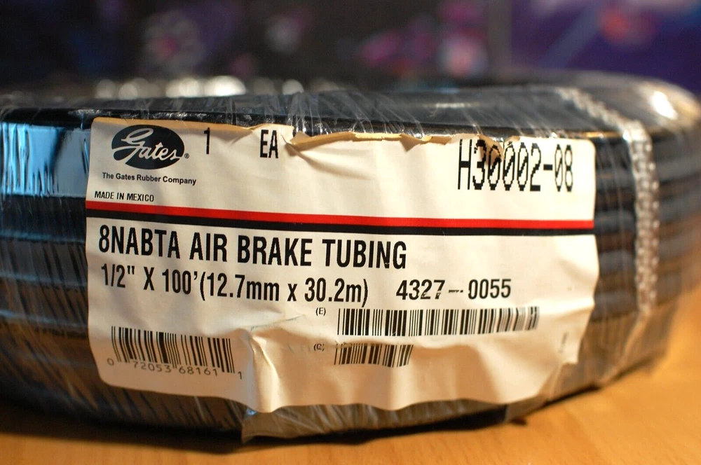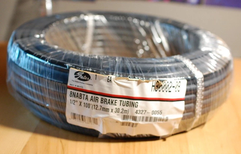 Product Title: Gates air-brake tubing (H30002-08) 8NABTA 1/2" x 100' - Hydraulic Hose Recommended For: Truck, bus and mobile air brake, and service lines where heat and battery acids are not present. Conforms to SAE J844 specifications. Meets DOT FMVSS 106-74. Key Features: Reinforced with one open ply of fibrous nylon Heat and light stabilized seamless extruded nylon. Temperature Range: -40°F to +200°F (-40°C to +93°C). Meets These Agency Specifications: DOT - Department of Transportation, USASAE - Society of Automotive EngineersFMVSS - Federal Motor Vehicle Safety Standard, USA Standard Industry Specifications: SAE J844 Specifications: Brand: Gates Model: 8NABTA (H30002-08) Max Working Pressure(psi): 150 Min Burst Pressure (psi): 760 Minimum Bend Radius (in): 2 Tube Od (in): 1/2 Condition: New, In original factory packaging. Weight(lb): 3.90 Color: Black Package Includes: 1 Gates air-brake tubing (H30002-08) 8NABTA 1/2" x 100' - Hydraulic Hose Why Buy From Us: Fast & Free Shipping 30-Day Return Policy Excellent Customer Service 100% Satisfaction Guarantee Returns: Returns: Hassle-free returns within 30 days. Buyer pays return shipping unless the item is defective.