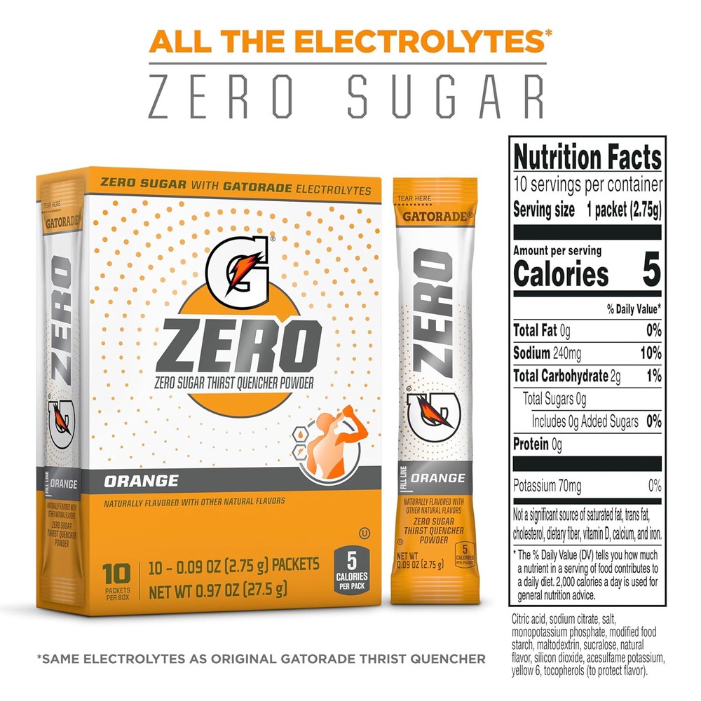 Gatorade G Zero Powder, Orange, 0.10oz Packets,(120 0.97 Ounce (Pack of 12) Product Details Package Dimensions : 12.6 x 10.35 x 3.11 inches; 0.2 ounces Brand: Gatorade Item Weight: 0.01 Pounds Caffeine Content: caffeine free Item Form: Powder Package Information: Box, Sachet Don’t count the days. Make the days count. Grab your home workout equipment then replenish during your at-home workout with the electrolytes from G Zero Gatorade Zero has no sugar while maintaining the same proven hydration and fueling benefits of Gatorade Thirst Quencher When you sweat, you lose more than water. Losses in fluids and electrolytes can negatively impact performance. Gatorade Zero contains critical electrolytes to help replace what’s lost in sweat During training, your energy needs are unique. Gatorade Zero lets you replace what you’ve lost without adding more of what you may not need 5-10 Calories Per Serving: Refueling goes beyond simply refilling. With minimal calories, Gatorade Zero complements your nutritional efforts so you don’t need a workout after your workout Gatorade Zero has no sugar while maintaining the same proven hydration and fueling benefits of Gatorade Thirst Quencher. With refreshing flavors to keep you in the game, you won’t even miss what’s missing.