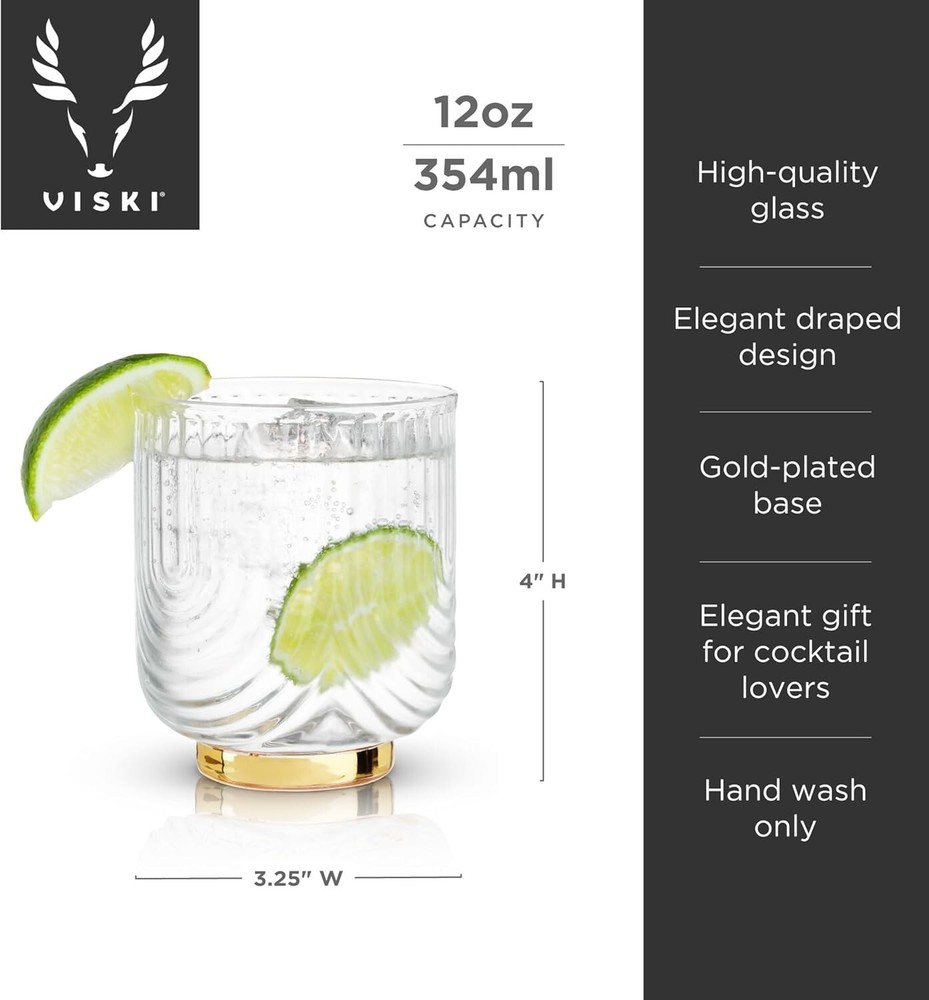 The Viski Gatsby Lowball Glasses Set includes two vintage-style drinking tumblers designed for enjoying whiskey or other beverages. Made of glass, these Gatsby Tumblers have a classic yet stylish design suitable for various occasions. The set is perfect for those who appreciate quality glassware and enjoy sipping their favorite drinks in elegant vessels.