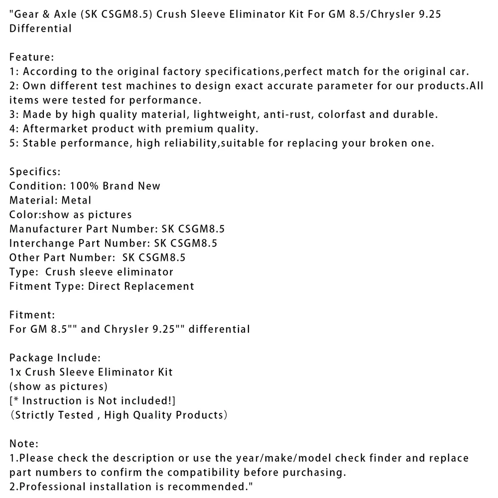 Interchange Part Number: SK CSGM8.5 gtin13: Does not apply Material: Metal Color: as shown in pictures Fitment: For GM 8.5" and Chrysler 9.25" differential Brand: Areyourshop UPC: Does not apply Manufacturer Part Number: SK CSGM8.5 Other Part Number:: SK CSGM8.5