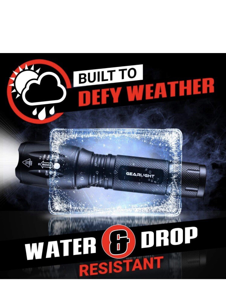GearLight LED Tactical Flashlight S1000 [2 Pack] - High Lumen, Zoomable, 5. Modes, Water Resistant Light - Camping Accessories, Outdoor Gear, Emergency Flashlights About this item Ultra Bright & Long-lasting - Easily light up an entire room or focus in on objects up to 1000 feet away! 10 times brighter than old incandescent lights. Conveniently powered for hours with 3 AAA batteries or a single rechargeable battery. (Batteries are not included) Compact, Adjustable Focus, & Five Modes - 5 Useful Setting and wide-to-narrow beam zoom makes it ideal for use around the house, dog walking, or camping. It is compact enough to fit in your pocket, backpack, or purse allowing for easy storage and quick access. Water Resistant & Virtually Indestructible - Built for rough handling, this flashlight can survive a 10-foot drop or being temporarily submerged under water. You can even freeze it or run it over with a truck, and it will still work! Suitable for use in rain, snow, or emergency situations. Perfect for Any Situation - The Patent Pending S1000 delivers convenience and power that other flashlights simply do not offer. Featuring a run time of 10+ hours when used on the low setting, it is the ultimate camping accessories and gear. Exceptional Value, 2 Flashlights & 2 Cases - Keep one in your car, one in your home, or gift one to a friend or family member. Package Contents: 2x GearLight S1000 LED Tactical Flashlights, 2x AAA Battery Holders, 2x Battery Tubes, 2x Lanyards, 2x Holsters, 1x User Manual. (Batteries are not included)