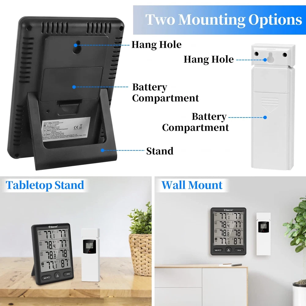 Indoor Outdoor Thermometer Wireless with 3 Remote Sensors, Digital Hygrometer Thermometer, Temperature Humidity Monitor Gauge with 200FT/60M Range 【Accurate Temperature & Humidity Readings】 Indoor outdoor thermometer hygrometer wireless weather station with large LCD display measures the real-time temperature and humidity with past 24 hours Max/Min records and trends arrows. Assess historical data and refer to the Comfort Indicator to quickly know your home living conditions. Works with the hi/lo temperature and humidity alert function, helps create a healthier lifestyle. 【Come with 3 Wireless Sensors】 Wireless indoor outdoor thermometer with remote sensors support to be connected to display temperature and humidity readings from 4 different places simultaneously up to 200FT/60M apart (Wireless Frequency: 433 MHz). Monitor your whole home, basement, or greenhouse confidently with our digital temperature humidity meter. 【Wide Measuring Range】Indoor outdoor temperature and humidity monitor measures inside temperature from 50°F ~ 140°F(-10°C ~ 60°C) , and outside temperature from -58°F ~ 158°F(-50°C ~ 70°C) with ± 1.8°F /1°C accuracy. The indoor and outdoor humidity range is 20%-95% with ± 5% accuracy. (Wet: humidity﹥70%; COM: 40%≤humidity≤70% & 20°C≤Temperature≤28°C); DRY: humidity﹤40%. ) 【Max/Min Record & Temp Alert】 Inside outside thermometer for home features Max/Min and Alarm functions on both in/out temperature and humidity. The Max&Min data will update every 24hrs and you can press the “MEM” button to switch between ℃ and °F. With an audible alarm, you can set the maximum and minimum temp and humidity alert values manually. It will ring when the value reaches the point of pre-set max or min alarm values. 【Multiple Applications】Geevon indoor outdoor thermometer wireless can be placed on the desk or hung on the wall as you like. You can place it in your bedroom, baby room, wine cellar, basement, garden, greenhouse, grow tent, or office. The base station is powered by 2 AA Battery, and the remote sensor is powered by 2 AAA Battery(Not Included). Please let us know if there are any problems with the weather thermometers, we will do our best to solve the problem for you.