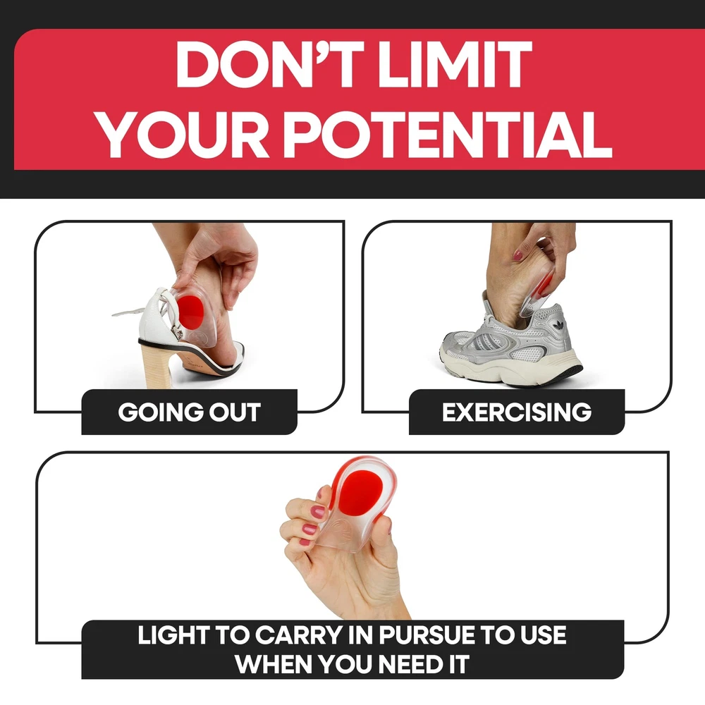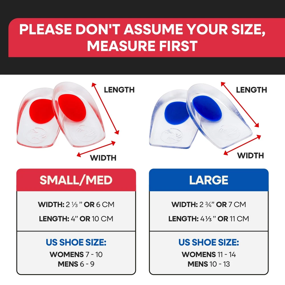 HEEL CUPS for INSTANT HEEL PAIN RELIEF - Gel Shoes Inserts to Help Relieve Your Heel Pain & Discomfort from Hurting Heels, Sore Feet, Plantar Fasciitis, Bone Spurs or Aching Heel Spurs, Achilles, Edema, Treat Stress Fractures or Sprained Foot when Walking, Running & Playing Sports. Great Orthopedic Shoe Inserts for All Types of Heel Pain Relief and All Types of Shoes, Boots or Sandals HELP YOUR TIRED SORE FEET – Soft Gel Heel Pad Liners Won't Slip in Your Shoe or Boot. Heel Cups Boost Your Energy so You Can Perform at Your Very Best ALL DAY by Reducing Impact on Your Joints & Muscles. Put a SPRING in Your Step Today. Great Shock Absorbing Heel Cushion Pads for Plantar Fasciitis Pain Relief that Pad Either Left or Right Heel COMFORTABLE SHOE INSERTS For All Day Wear – PACK of 3 Pairs. Relieving Your Tired Throbbing Feet, Giving You Greater Arch Support. Protect and Cushion Your Sore Heels from Shock, Bruising & Impact. Fits Both Womens and Mens Shoes High Heels or Boots, Great Alternative to Orthotic Insoles or Custom Heel Supports. Heel Lift or Wedge for Achilles Tendonitis Relief SILICON GEL HEEL CUPS Ultra-lightweight, Silicon Heel Gels Grip Pads Soften Impact on Your Sore Foot. Calcaneal Heel Spur or Bone Spurs. Great for Running, Walking, Standing All Day Long. These Long Lasting Heel Cushion Inserts are Durable, Re-Usable Plantar Fasciitis Support Make Great Shoe Lifts for Women or Men : We are here to help you every step of the way, our goal is your happiness & foot pain relief. We stand by the quality of all our pain relief products. Check out for all our foot care products.