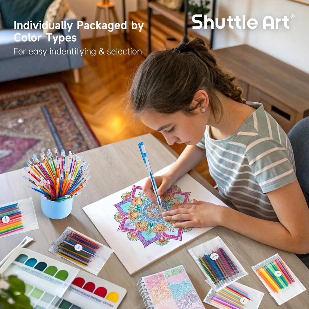 Gel Pen Refills, Shuttle Art 120 Colors (No 120 Count (Pack of 1), 120 Product Details Manufacturer: Shuttle Art Brand: Shuttle Art Item Weight: 7 ounces Package Dimensions: 10.67 x 5.75 x 0.63 inches Item model number: SAGP-120R Color: 120 Colors Closure: Snap Material Type: gel Number of Items: 120 Size: 120 Count (Pack of 1) Point Type: Fine Ink Color: Pastel Manufacturer Part Number: SAGP-120R Brand: Shuttle Art Ink Color: Pastel Style: Ballpoint Point Type: Fine Number of Pieces: 120 120 UNIQUE COLORS: Shuttle Art Gel Pen Refills Set has 120 unique colors, including 7 color types: glitter, neon glitter, metallic, neon, pastel, swirl, standard. Abundant colors with varied color types, fully meet your demands of coloring, writing and drawing. SMOOTH WRITING: Without skipping or bleeding, 0.8mm-1.0mm ballpoint tip can produce smooth and no skipping fine lines for coloring. And different color types are individually packaged, which makes it easier to find what you need. VARIETY OF USES: Great for bullet journaling, sketching, drawing, writing, coloring books and any other designs on Scrapbooks, School Projects, Party Invites, Greeting Cards, DIY Decor & Letters to Friends & Family. QUALITY GEL PEN REFILLS: The coloring gel pen refill set is non-toxic and acid-free. Conforms to ASTM-D4236. Definitely an ideal art supply for adults and kids. With those refills, there is no need to buy single pen. Less cost, more happiness.
