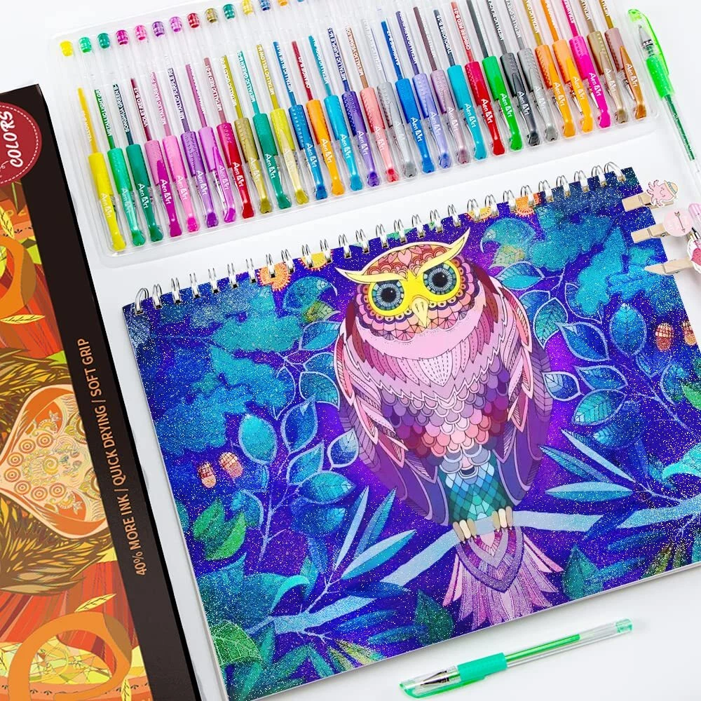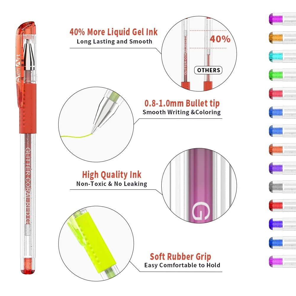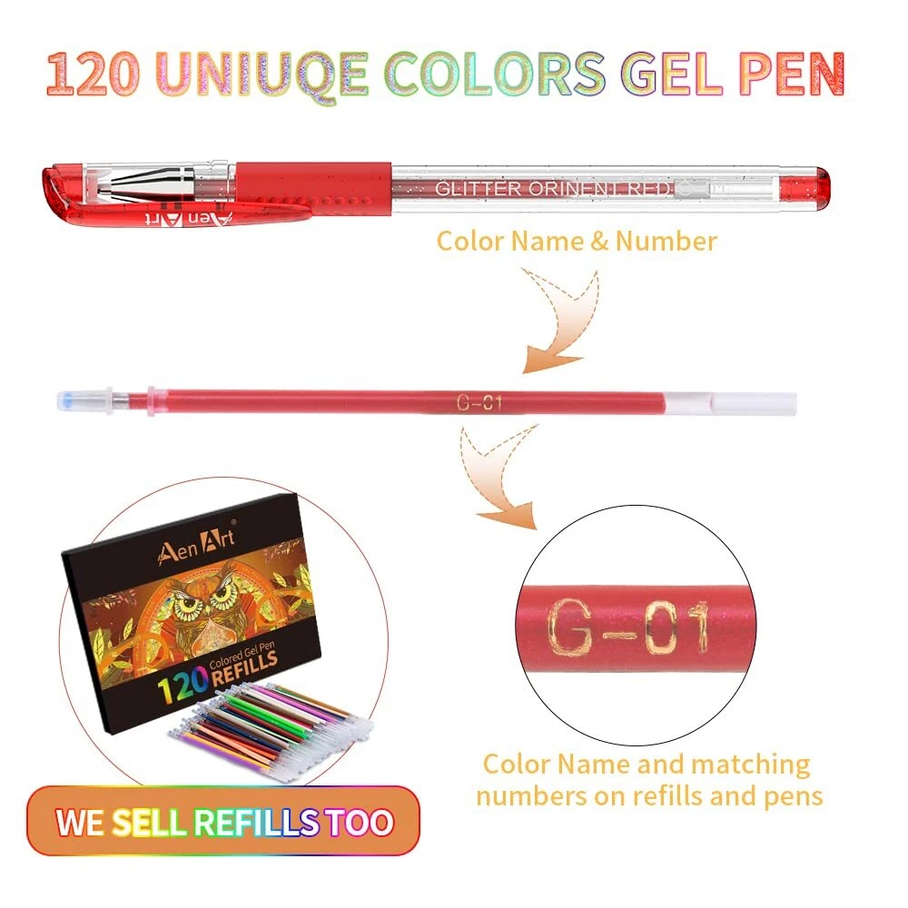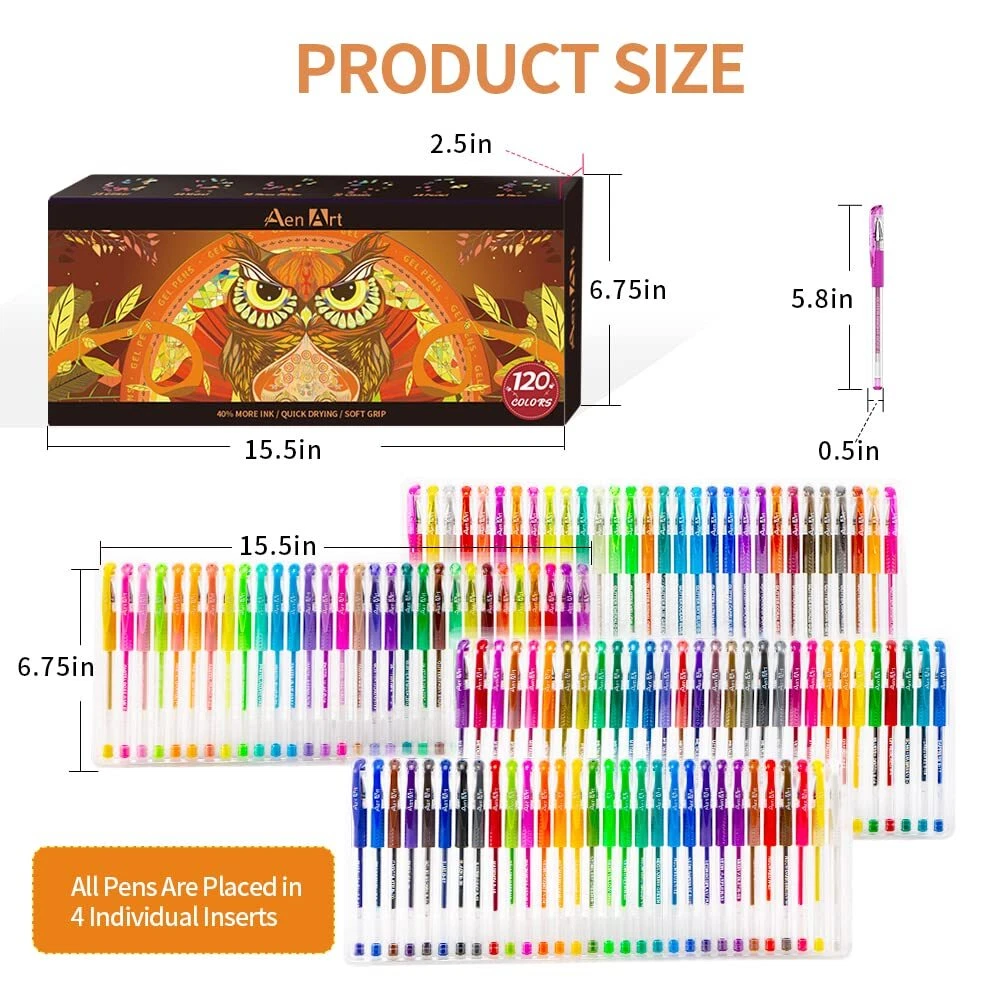 THIS IS THE NEWEST IMPROVED VERSION Super Value 120 UNIQUE Gel Pens Set for Kids Adult Coloring Book 40% MORE INK GEL PENS - LONGER LASTING SMOOTH APPLICATION You won’t run out of ink anytime soon. Just enjoy Free-Flowing, Smooth Gliding & Crisp Application. Each gel pen set is packaged in a PORTABLE STORAGE CASE which makes it easy for carrying, so you can take your Gel Pen Set wherever you go for non-stop creativity. Aen Art 120 Unique Gel Pen Set contains 120 INDIVIDULE colors. It has 28 Glitter, 16 Neon-Glitter, 20 Standard, 20 Metallic Colors, 18 Pastel, 18 Neon colors. We believe this set will meet all your need when choosing gel pen Each gel pen features soft grip and 0.8-1.0mm durable tip. Premium material makes our pens glide smoothly than others. You will like the way you can colour precisely in the tiny details of your adult colouring books Upgraded gel pens come with 40% more ink, can coloring more pages than before. Do not need find refills whenever doing artworks, writing, drawing, crafting, doodling, art designs and journaling We print color names and color codes on each gel pen, so It’s convenient and easy taking. Also the durable case keep pens securely in place with individual inserts. NOW spend less money to get a generous gel pen set Acid-free and non-toxic ink doesn’t smear, fade, or skip. Safe to give our gel pens to kids and girls. Why Not Consider giving coloring supplier as a gift? Please feel free to contact us if you have any questions.