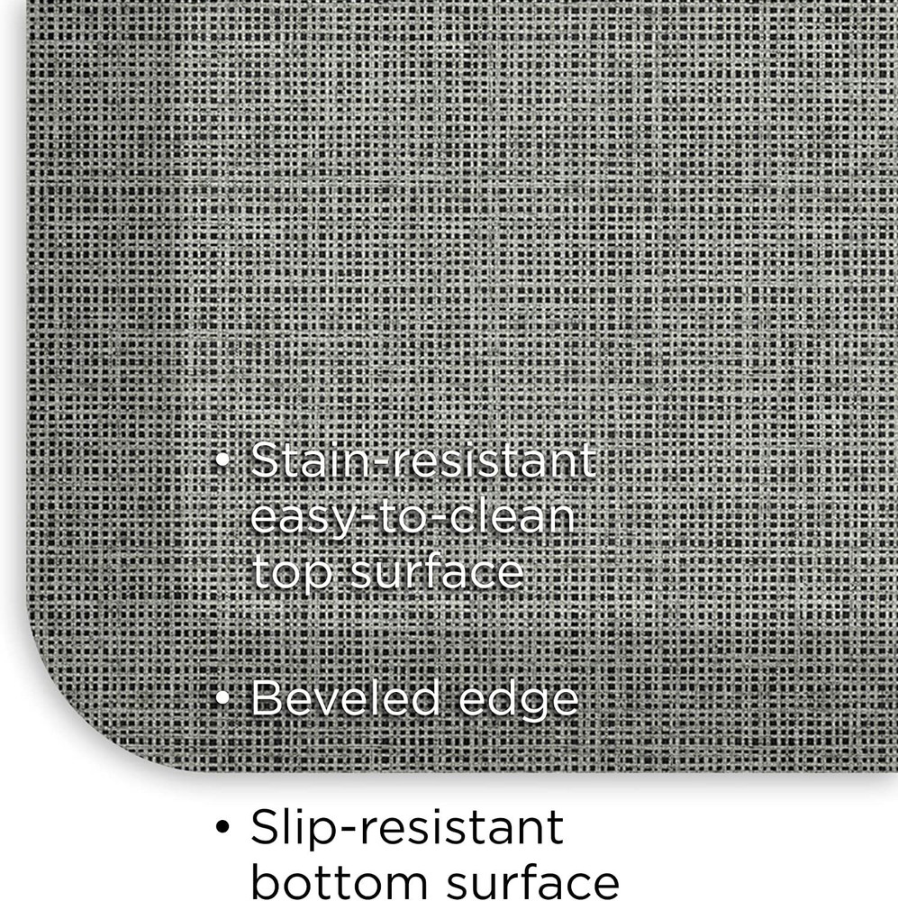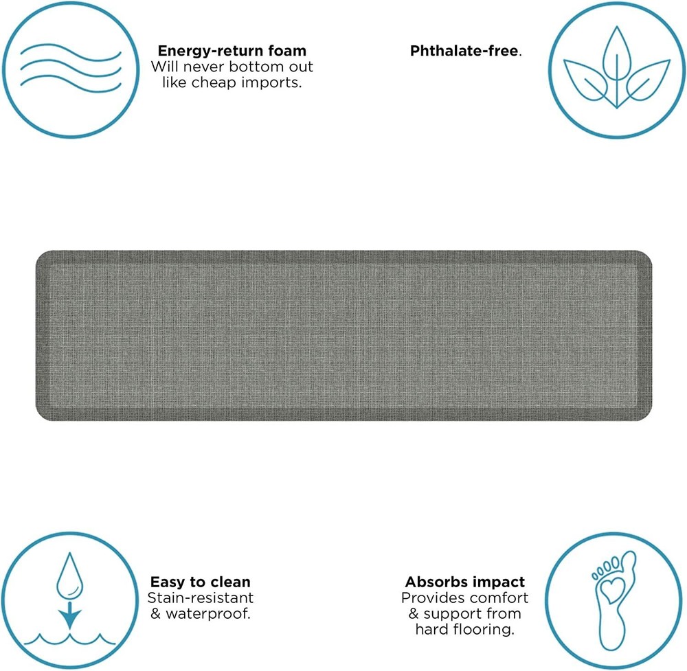 Reduce Fatigue, Prevent Feet, Legs and Lower Back Pain and Add Up To Your Working Space's Decoration Thanks to the Ultimate, Most Stylish, Decorative Foam Floor Mat. If you are a chef, a bartender, a retail shop assistant or you simply spend long hours standing, aching feet, lower back pain and discomfort are part of your daily life. If you have been looking for a way to soothe pain and remain comfortable throughout the day, your quest stops here! The NewLife anti-fatigue standing mat by GelPro is bound to give the solution to your problem, providing you with unmatched support and comfort! 3/4" Thick Ergo-Foam Core Standing Mat Which Reduces Fatigue While Standing. Forget about cheaply made, thin and sinking foam mats which fail to support your body and prevent pain. This premium quality kitchen and office mat for standing features a 3/4'' thick ergo-foam core which can provide soothing relief, allowing you to stand for long periods of time while remaining perfectly comfortable. Durable, Stain Resistant Construction, Beveled Edges and Stylish Grass Cloth Pattern. This ergonomic foot comfort mat features an extremely durable construction that assures unmatched longevity. In addition, its beveled, non-curling edges prevent tripping accidents while the non-slip bottom keeps the mat in place, preventing it from slipping on the floor. The stain-resistant surface allows you to effortlessly keep it clean! Last but not least, the striking, classy grass cloth pattern makes this kitchen and stand up desk mat the perfect addition to any environment, adding style to your living and working spaces. Click Add To Cart Now And Make This Comfort Standing Mat Yours While Supplies Still Last!. PATTERN: The Tweed pattern is a versatile and classic design that can be used to complement a variety of home decor styles, from traditional to contemporary. This pattern features a tightly woven design that is sure to add depth and character to any room in your home. COLOR: The Grey Goose color is a sophisticated and timeless steel grey hue with a subtle, patina green background tone. This unique color combination creates a sense of depth and adds a touch of natural beauty to any space. THICK, SUPPORTIVE ERGO-FOAM CORE: This anti-fatigue cushion mat for standing features a 3/4'' thick ergo-foam core which can provide excellent support and prevent feet, legs and back pain BEVELED EDGES AND DURABLE CONSTRUCTION: The NewLife by GelPro cushion comfort mat features beveled edges that will not curl, protecting you from tripping over it SLIP RESISTANT, SAFETY BOTTOM: This kitchen and desk standing mat features a steady, non-skid bottom surface that assures maximum safety, effectively preventing slipping accidents EASY TO KEEP CLEAN: Featuring a stain resistant surface, this chef kitchen anti-fatigue floor standing mat is incomparably easy to keep clean