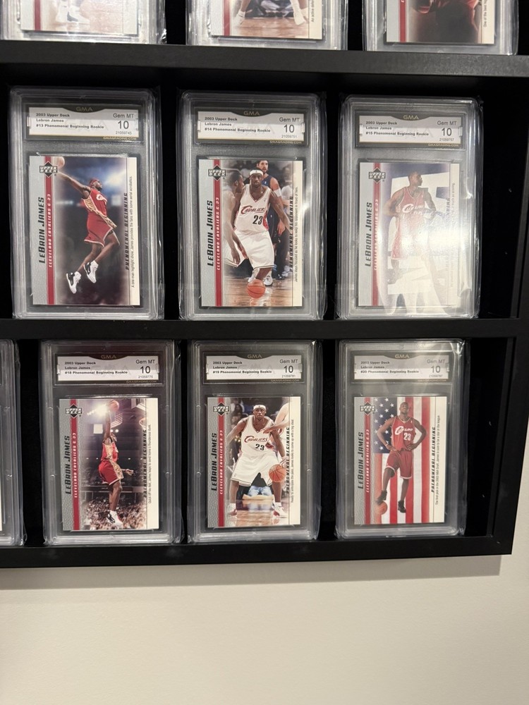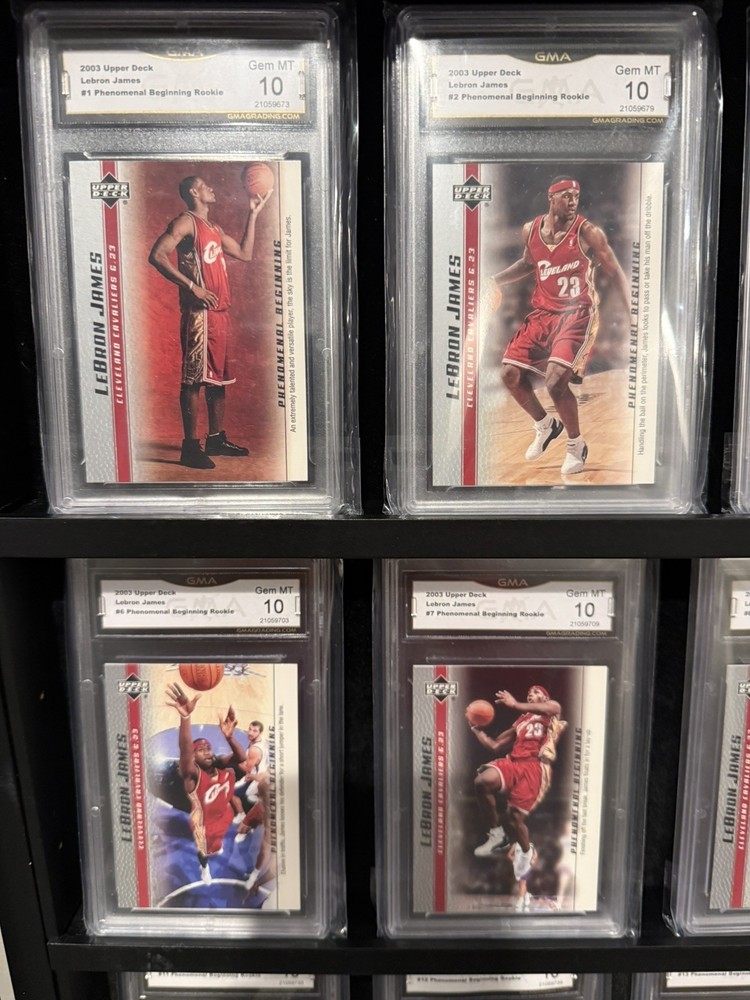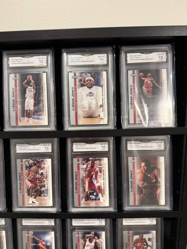 The product is a full set of 20 rookie trading cards featuring basketball legend LeBron James from the 2003 Upper Deck collection ALL GEM MINT GMA 10s! These cards showcase the beginning of LeBron's remarkable career in the National Basketball Association (NBA), making them highly sought after by collectors and fans alike. As part of the Upper Deck manufacturer's set, these cards are a valuable piece of sports memorabilia that captures a pivotal moment in one of the greatest player's early years in the league.