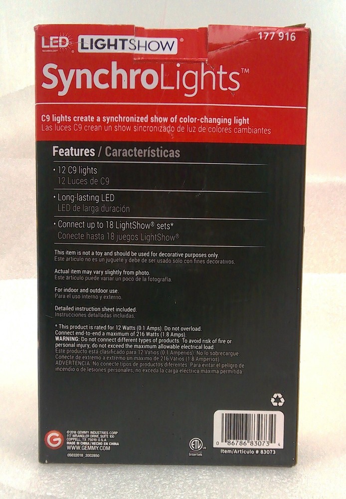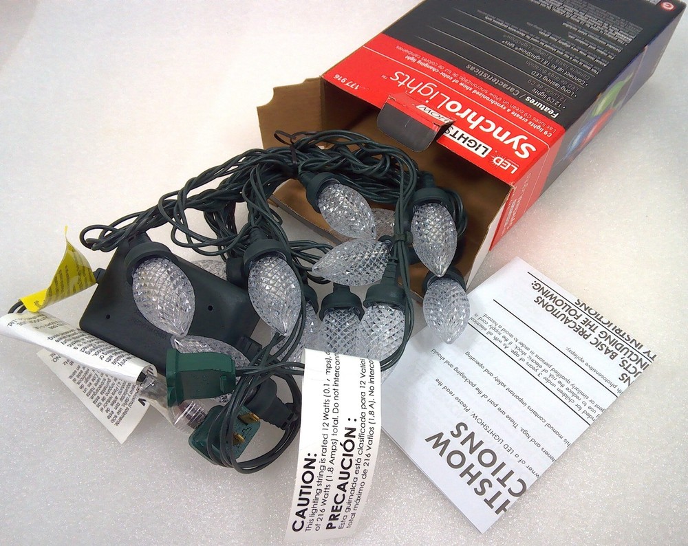 The Gemmy 12 Count LED LightShow Synchrolights C-9 String Christmas Lights are a festive decoration perfect for any holiday occasion. The C9 Lights create a synchronized show of color changing lights Connects end to end plugs These multicolor lights are designed in a C9 shape and can be used both indoors and outdoors. The string lights are electric-powered and feature LED lighting technology, providing a bright and vivid display. With a length of 11 feet and a green cord, these Gemmy string lights are a high-quality and durable option for adding holiday cheer to your home or garden. FREE SHIPPING!