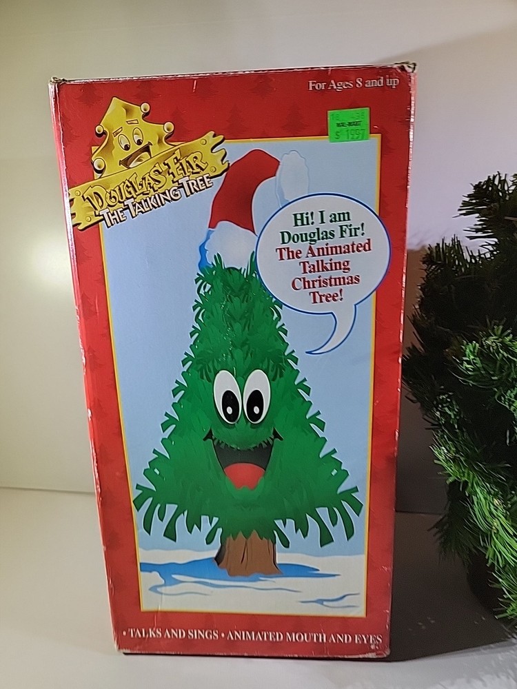 This is a Gemmy Douglas Fir Talking Singing Tree, an animated Christmas decoration that plays holiday music and sings carols. It is a plastic tree with a green color and stands 16 inches tall. The tree is artificial and was manufactured in 1997 in China. The tree features a synchronous motion technology that makes it appear as if the tree is singing and playing instruments. It is a collectible item that is perfect for Christmas decorations.
