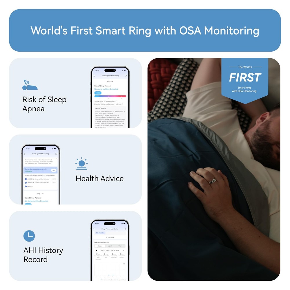 [Sleep Apnea Monitoring] Gen 2 Smart Ring supports sleep health with advanced technology. Developed with leading universities and hospitals, this AI-powered ring accurately tracks sleep apnea. Unlike traditional devices, it's lightweight and comfortable, offering multi-day monitoring with real-time AHI data and personalized insights via a dedicated app for easy sleep health management [Size Before You Buy] Gen 2 Smart Ring uses unique sizing standards, different from U.S. and other health rings. Gen 2 Sizing Kit helps you find the most comfortable and accurate fit for your finger, preventing the inconvenience of returns and exchanges by ensuring you select the correct size before purchasing [No Subscription Fees] Unlock lifetime access to the comprehensive suite of features on the Smart Health Monitoring App with your Gen 2 Smart Ring. Experience continuous, real-time health tracking and personalized insights [More Than Just Health Monitoring] Gen 2 Smart Ring surpasses standard health monitoring features by not only tracking your activity, sleep, stress, heart rate, HRV, and blood oxygen saturation but also supporting OTA updates. This ensures continuous improvements and the addition of new features, delivering an ever-evolving experience tailored to your needs [Waterproof for Every Adventure] Gen 2 Smart Ring features upgraded water resistance of up to 100m, making it perfect for daily wear, workouts, and swimming. Plus, Gen 2 offers outstanding durability with a gentle touch, even for sensitive skin [Longer Battery Life & Ultra-Thin Design] Gen 2 offers up to 10-12 days of battery life, keeping up with your busy lifestyle. Battery life varies by ring size — larger sizes (12-14) can last up to 12 days. With the smart charging case, it can exceed 150 days. The updated design is now thinner, lighter, and more comfortable — with a better fit than ever — so light, you’ll hardly notice it’s there [HSA/FSA Eligible] Gen 2 Smart Ring is HSA/FSA approved. Easily use your Flexible Spending Account or Health Savings Account to make a purchase [What You Get] Gen 2 Smart Ring*1, Charging Case*1, 1m/3.3ft USB-C to USB-C cable*1, user manual*1, our worry-free 12-month warranty, and friendly customer service
