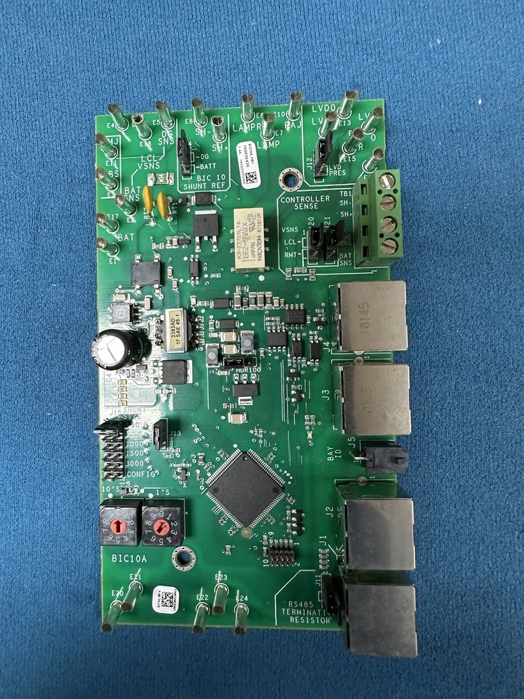 General Electric GE GPS4848 BIC10A Control Module Comcode 150036436. This is the control module (circuit card) that is typically mounted within a variety of GE rectifier and distribution bays in the telecommunication industry. The BIC10A control modules can be found in GPS4848 and GPS4827 bays and are used for monitoring and control of rectifiers and distribution panels. This control module has DIP switches to set the bays ID and shunt settings and communication ports to inter-connect bay to bay communication cabling.