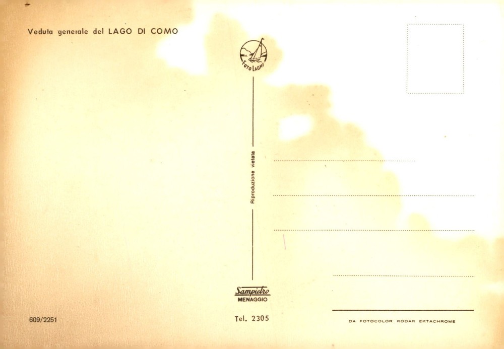 This postcard features a detailed map of Lake Como and its surrounding towns and landmarks. The image captures the beauty and serenity of the area in the 1960s.