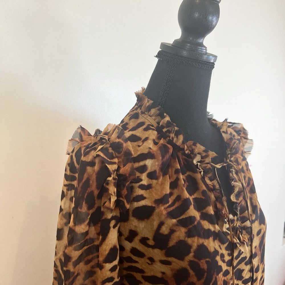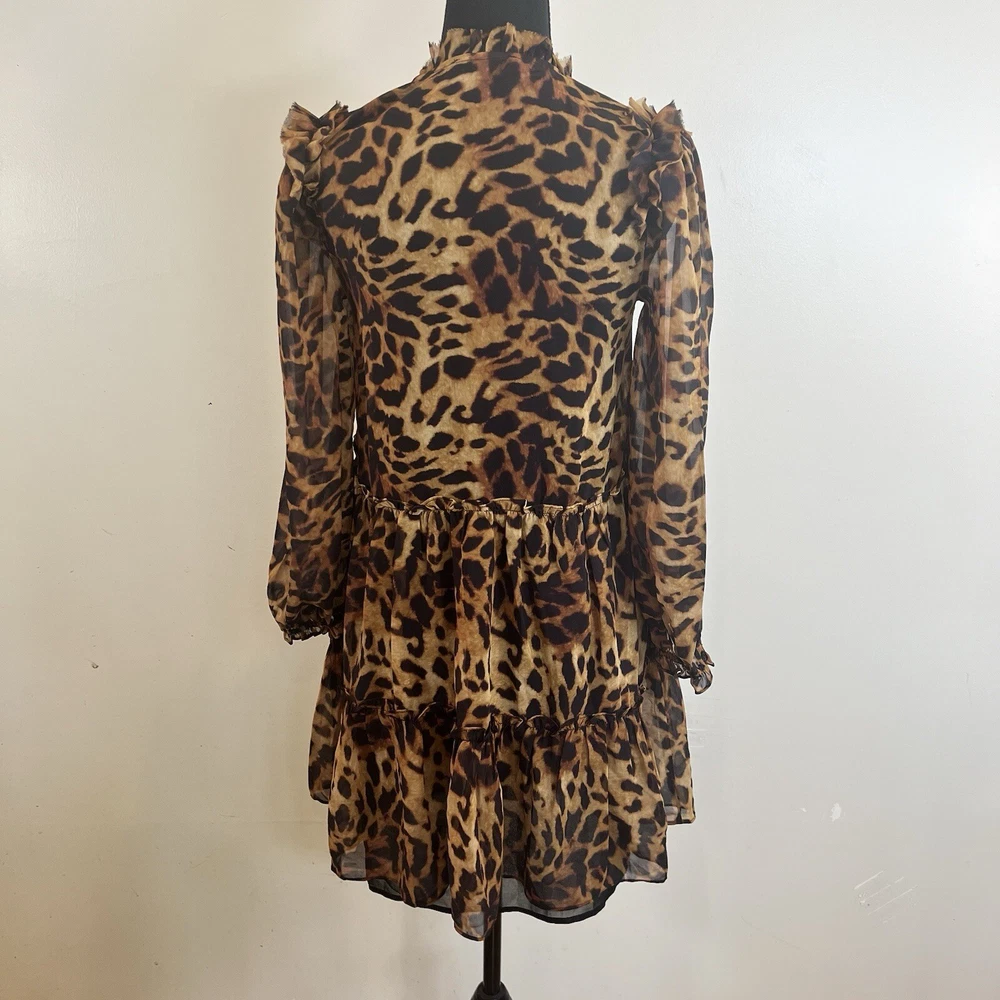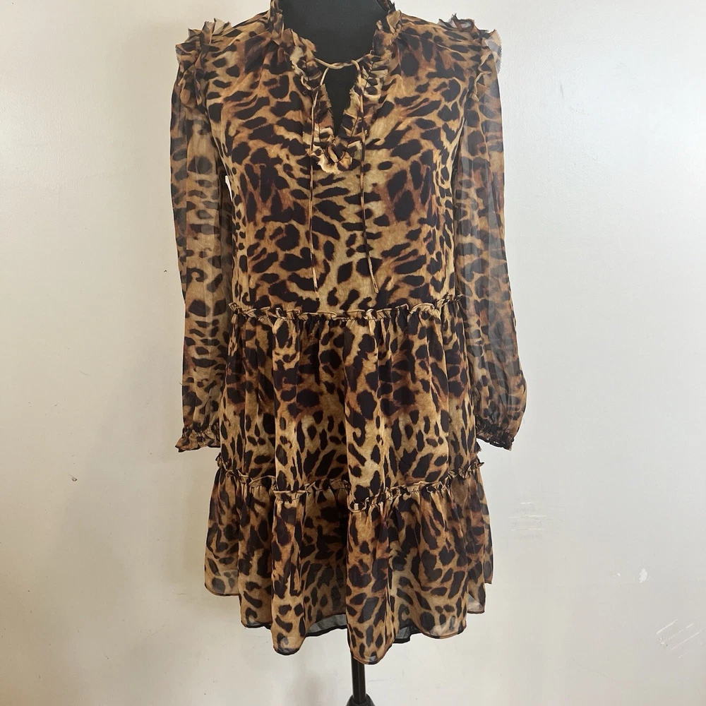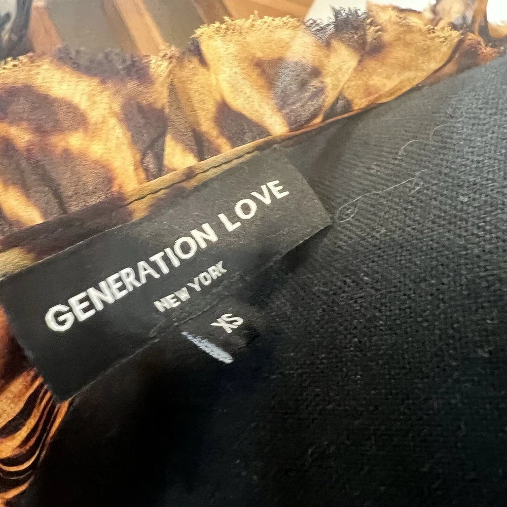 Generation Love Rumi Mini XS Brown Leopard Print separate Black Slip Lining Bust: 17" flat measure pit to pit Length: 34" shoulder to hem This Generation Love Rumi Mini Dress in XS size is perfect addition to your wardrobe. The dress features a beautiful brown leopard print and is made of high-quality polyester material with a chiffon fabric type. The 3/4 sleeves and V-neckline with string tie add a touch of elegance to the dress, while the pullover closure makes it easy to wear. The dress is lined and should be hand washed only. See photos. Ask questions. Thank you for supporting my small, woman owned business.