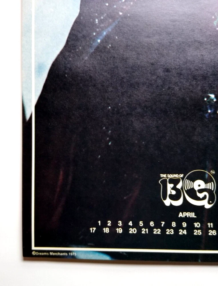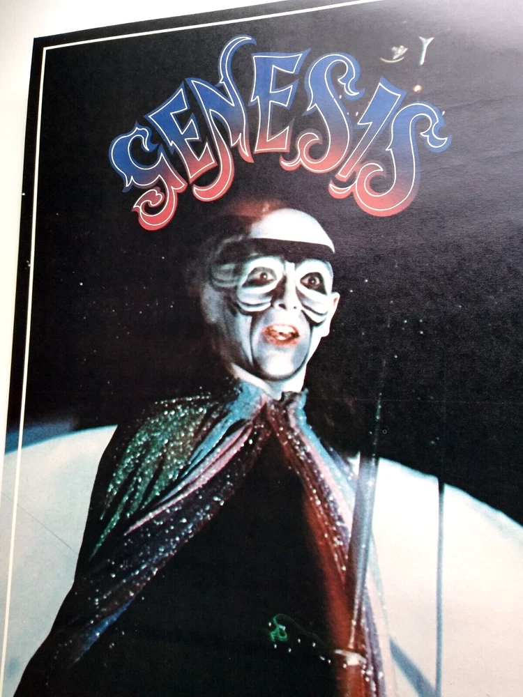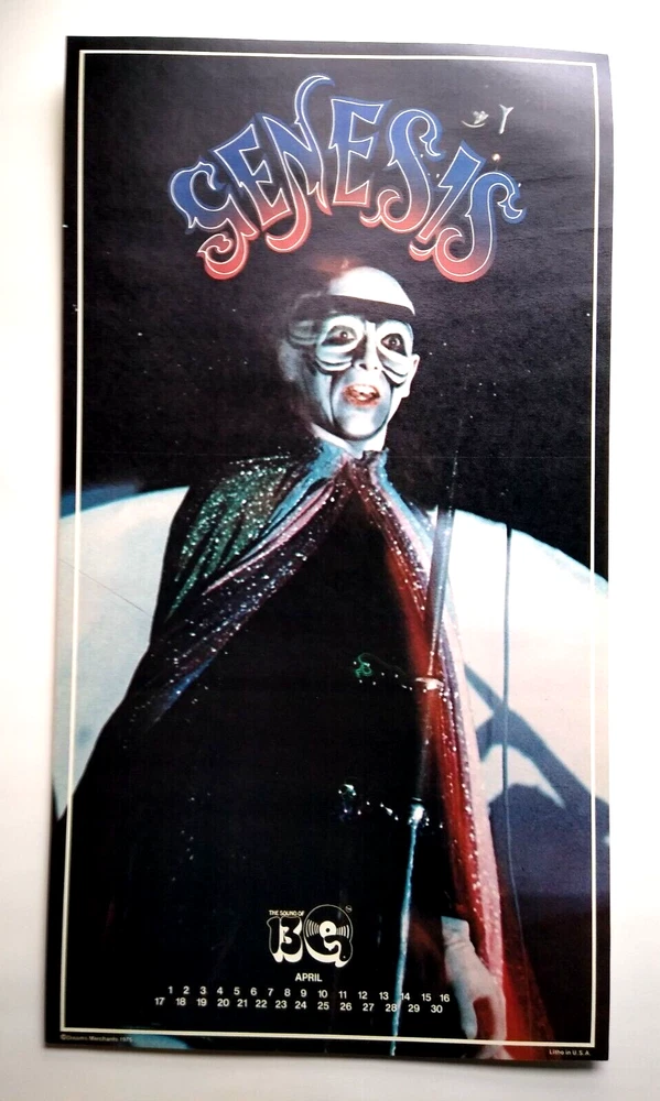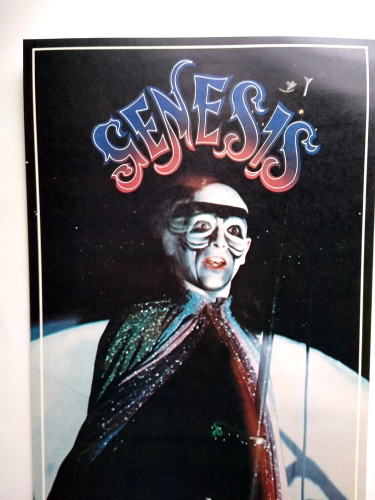 Striking image of vocalist Peter Gabriel in costume at the height of the glam art rock movement. Vintage 22" x 12.25" licensed wall poster. These were the first glossy licensed paper posters ever produced featuring rock stars. Dream Merchants issued a different one each month for a year. Now, they are nearly impossible to find. Issued in November, 1975. Super nice UNUSED condition with light age wear. More music related memorabilia for sale in our store. Bundle and save by using cart and making single payment.