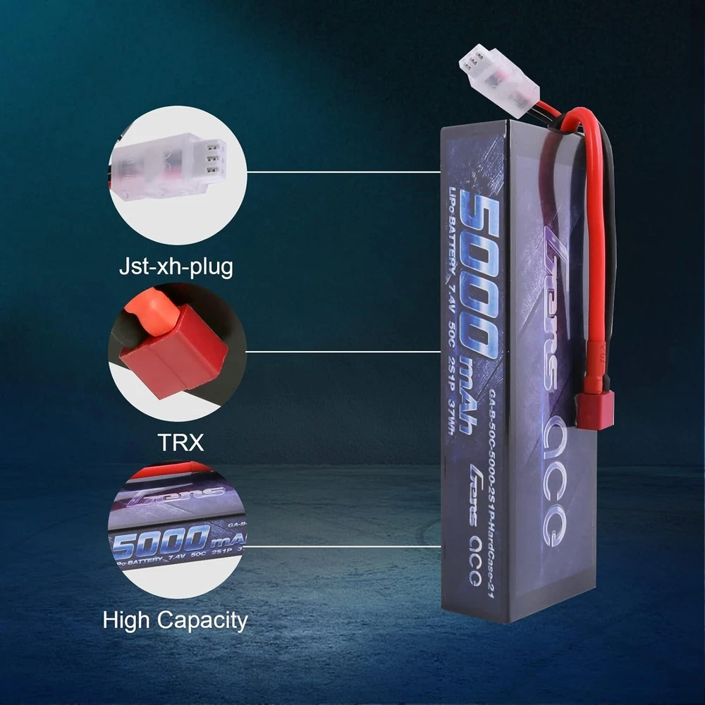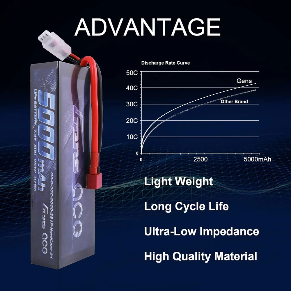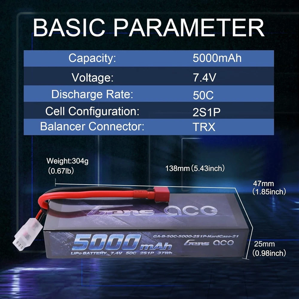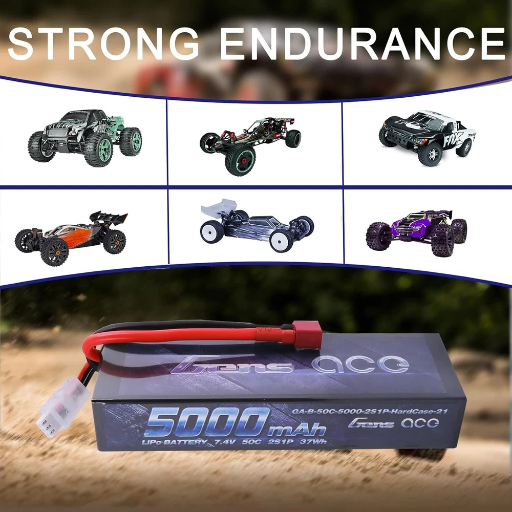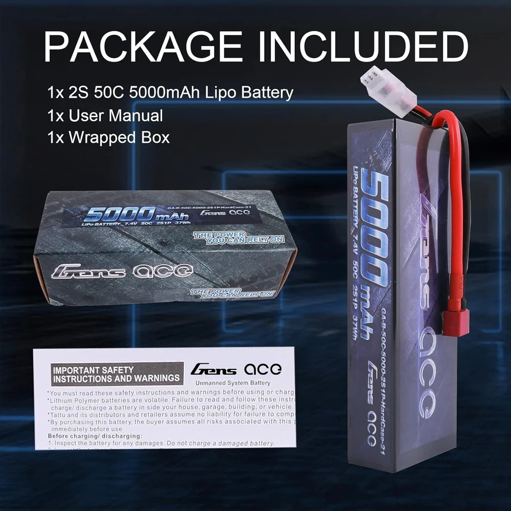 Gens Ace 5000mAh 7.4V 50C 2S Hard Case Lipo RC Car Battery Pack With Deans Plug S/4 About this item: Gens ace 2S 7.4V 5000mAh 50C LiPo Battery Pack HardCase with Deans T Plug for RC Car Arrma Axial Losi TRX Slash Buggy Team Associated Serpent HPI Redcat LRP Monster Truck Roar Approved Gens ace 7.4V 5000mAh Lipo battery Specification:Battery Voltage:7.4V;Configuration:2S1P; Capacity:5000mAh;Discharge: 50C Plug: Deans T Plug. Dimensions: Gens ace 5000mAh 2S Lipo battery dimensions is: 138*47*25mm/5.43*1.85*0.98inch; Approx Weight:304g/10.72oz. High Performance: Gens ace 2S 5000mAh Lipo battery with 50C discharge rate hardcase offers high power and very long time for your RC Model. Application: Gens ace 2S 5000mAh Lipo battery specially compatible with 1/8 and 1/10 rc car, Arrma, Losi, Slash, HPI Strada XB 1/10 RTR Electric Buggy, Team Associated, Axial, Tamiya, Duratrax, Jammin, Redcat Racing, Exceed RC, Electrix RC, Emaxx, Kyosho GP 4WD Racing Truck. Overview Gens ace is one of the top rank RC battery brand in the market. With the effort of 200 professional engineers and technicians, Gens ace always provides batteries with exquisite technology for various RC Models such as RC cars, RC planes, RC helis, RC boats, etc. Product Details: Brand: Gens ace Capacity(mAh): 5000mAh Voltage(V): 7.4V Discharge Rate (C): 50C Max Burst discharge Rate (C): 100C Configuration: 2S1P Net Weight(dev.20g): 304g Length(dev.5mm): 138.5mm Width(dev.2mm): 46.5mm Height(dev.2mm): 25mm Connector Type: Deans Plug Wire Gauge: AWG12# Wire Length(mm): 115mm Balancer Connector Type: JST-XHR Features: Superior Japan and Korea Lithium Polymer raw materials. Automatic stacking technology, better performance Strict matching progress, excellent consistency Up to 200Wh/kg energy density Long cycle life (150 times minimum) NOTICE Please read the instruction carefully before using or charging the battery. Check carefully the battery condition about the battery surface and battery voltage before using or charging. Use professional lipo battery charger ONLY. Any issues about the battery, please enter to YOUR ORDER for help. GENS ACE THE ULTIMATE POWERFUL PERFORMANCE LIPO BATTERY Gens ace is one of the top rank battery corporations with deep research and manufacturing on LiPo batteries by the effort of 200 professional engineers and technicians with 20 years exquisite battery technology. With superb pairing techs, safe and steady formula of raw material, smooth and steady discharge curve and rigorous scientific quality control system, Gens ace LiPo Batteries provide the punch and on-demand power for reaching the top speed, acceleration and power your rc models. Experience all the performance that's been engineered into your rc models! COMPATIBLE RC MODELS G ens ace 2S 7.4v lipo battery 5000mah special designed for professional 1/10 scale and 1/8 scale off road on road RC car hobby models such as: Traxxas Slash, Emaxx, Arrma, Losi, Axial, Tamiya, Duratrax, Jammin, Redcat Racing, Exceed RC, ElectrixRC, HPI Strada XB 1/10 RTR Electric Buggy, Kyosho GP 4WD RACING TRUCK, Team Associated SC8, etc. It also cuould be used for RC airplane, RC helicopter, RC boat, drone, FPV, only if the voltage, weight, dimension and plug match. HIGH PERFORMANCE The Gens ace 2S 7.4v lipo battery 5000mah with 50C discharge rate hardcase offers you very high power and very long run time for your RC cars. The 100C max burst rate gives you enough power for acceleration. It enhances your driving experience no matter what type of driving you are into. These 7.4V 2S 5000mah lipo batteries packs are made with superior Lithium Polymer raw materials from Japan and Korea. The advanced stacking technology enables a single cell of capacity to reach 5000mah. They are widely fit the 1/8 and 1/10 RC car Model. The hardcase of this 7.4V 2s lipo battery 5000mah provides your batteries very solid protection, it comes with an equipped Deans plug. They are your ideal chooses for the RC car hobby. LIPO BATTERY SAFETY FIRST Initial Performance Tests Production in the most strict single cell capacity, voltage, resistance, discharge curve matching process. Superior Japan and Korea Lithium Polymer raw materials. Protective Devcie It comes with an equipped Deans plug, they are your ideal chooses for the RC car hobby. The hard case can better protect cells from impacting, punturing and other damage. Important LiPo Battery Safety Information Read and follow all manufacturer's charging and handling instructions, warnings, and precautions before use. Never leave batteries unattended during charging. Shipping In Most cases I ship within One business days of payment. I use a selection of shipping services such as UPS, FedEx, USPS... Local pickups and combined shipping options are not provided. Return You can return a Item Free for up to 30 days from the date you purchased it. Any product you return must be in the same condition you received it and in the original packaging. Payment I accept payment by any of the following methods: Please pay as soon as possible after winning an auction, as that will allow Me to post your item to you sooner! Feedback Customer satisfaction is very important to Me. If you have any problem with your order, please contact Me and I will do My Very best to make it right. Top Rated Plus Trusted seller, fast shipping, and easy returns. Contact Me If you have any queries, please contact Me via eBay. I usually respond within 24 hours or sooner. Thank you for shopping My store And Please check-out My Other Listing, that you might find interesting.
