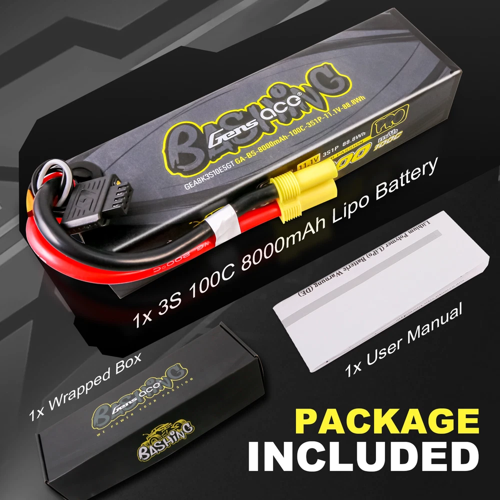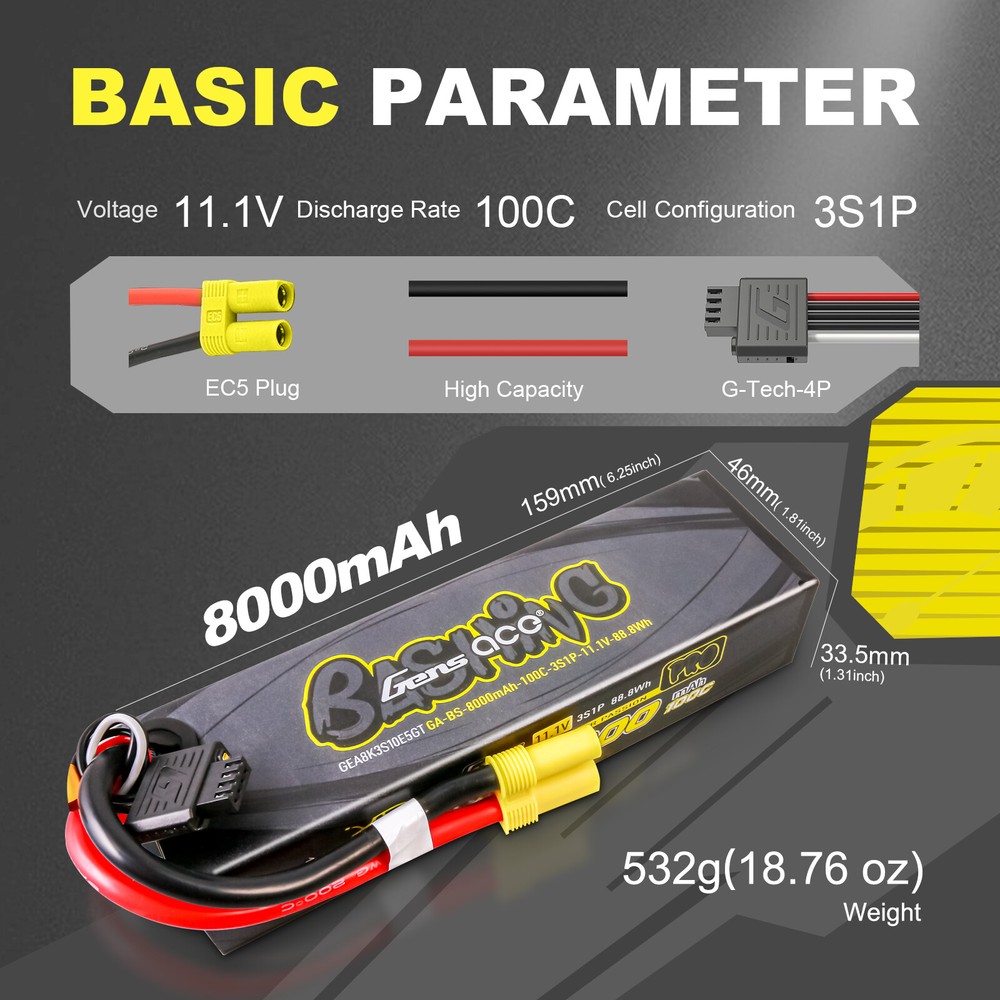 Gens Ace G-Tech Bashing Pro 8000mAh11.1V 100C 3S Lipo Battery EC5 For Arrma Car Gens Ace Bashing Pro 8000mAh 11.1V 100C 3S G-Tech Lipo Battery EC5 For Arrma Car Gens Ace is one of the top rank battery corporations with deep research and manufacturing on NIMH, LI-PO, LI-FE by the effort of 200 professional engineers and technicians with 20 years exquisite battery technology. The Gens Ace brand holds the traditional concept of "excellent quality", "Optimization"& "Priority" on Sales & Services. In order to provide RC car hobbyists with a more pulsating and experiential power, we have come up with the Bashing Pro series. This model has now been updated to a more robust version with a hard shell square tube case and eight gauge wire. Please make a note in your order: Send the upgraded version. Features: Large-capacity battery specially designed for ARRMA vehicles to maximize battery life. Better grip in the battery tray. PC material and silicon rubber case provides dual protection. Specifications: - Minimum Capacity: 8000mAh - Configuration: 3S1P / 11.1V / 3 cells - Discharge Rate: 100C - Max Burst discharge Rate: 200C - Net Weight(±20g): 532g - Dimensions: 159x46x33.5mm(LxWxH) - Balancer Connector Type: G-tech Application: Suit for 1:7 FELONY 6S BLX / LIMITLESS / INFRACTION 6S BLX / MOJAVE 6S / Kraton Roller / MOJAVE ROLLER; 1:8 TYPHON 6S/3S, KRATON 6S BLX / TALION 6S BLX / OUTCAST 6S BLX / NOTORIOUS 6S; 1:10 SENTON 3S / GRANITE 4x4 MEGA / BIGROCK 4x4 3S BLX / OUTCAST / Kraton. Our Advantage: 1. Your orders will be dispatched via FedEx and UPS from the USA directly. 2. Fast shipping and excellent local after-sale service guaranteed in the USA. 3. Service-priority in online shop, like the long warranty period and the lower price for buyers. 4. Energy Density: Specially adapted to each UAV type and RC car/boat/helicopter type. Very High according to capacity/weight. In fact, we are specialists in High Power Lipo Batteries. It is our unique technology, the highest power of our battery is 100C. Another technology is our batteries are able to be stably discharged simultaneously 5. Low IR: Provides stable voltage until the end of your mission. Package included: 1X Gens Ace Bashing Pro 8000mAh11.1V 100C 3S G-Tech Lipo Battery EC5 Payment Delivery details Return & Warranty About us Feedback Payment 1 .Your can choose from any of the following payment methods: Visa Mastercard Discover American Express PayPal PayPal Credit Apple Pay (through the eBay app and mobile website only) Google Pay (through the eBay app, mobile website and desktop) 2 .NOTE : Payment should be sent within 1-3 (Three ) days of auction closing. Or unpaid dispute will be filed for closing auction. Delivery details 1. All items will be shipped within 1-2 business day upon receipt of payment. 2. Items will be sent from USA directly by USPS or UPS or FedEx, it usually takes approximately 4-7 business days to receive order. 3. All items will be shipped to buyer's eBay address. Before you pay, please make sure your address on eBay matches the address you would like us to ship to. 4.Fast shipping and excellent local after-sales service guaranteed in USA Return & Warranty 1.Our items come with 90-Day warranty. 2.Our warranty does not extended to any products that are physically damaged or that are not under normal operating conditions as a result of misuse or improper installation on the buyer/user's part. 3.This product comes with 30-Day Money Back Guarantee. 4.We stand behind every product we sell. If you're not pleased with your purchase, we'll be happy to make an exchange or refund. About us Gens Ace is one of the top rank battery corporations with deep research and manufacturing on NIMH, LI-PO, LI-FE by the effort of 200 professional engineers and technicians with 20 years exquisite battery technology. The Gens Ace brand holds the traditional concept of "excellent quality", "Optimization"& "Priority" on Sales & Services. All batteries are tailored for various scales of the RC Models such as electronic cars, nitro cars, aero planes, vessels and also other models, toys, electric tools, electric bikes, electric autos, digital products etc. Feedback Customer satisfaction is very important to us. If you have any problem with your order , please contact us and we will do our best to make you satisfied, please do not leave a negative feedback before we resolve your problem. We guarantee that your issue will be solved quickly. As long as you are happy with your purchase of , please leave us a positive feedback. Your feedback is very important to us it affects our search placement on eBay. You will receive our positive feedback as soon as you pay for your item. If you have any concern , please contact us first via Ask a Question or via Contact Seller. We usually respond within 24 hours on weekdays.