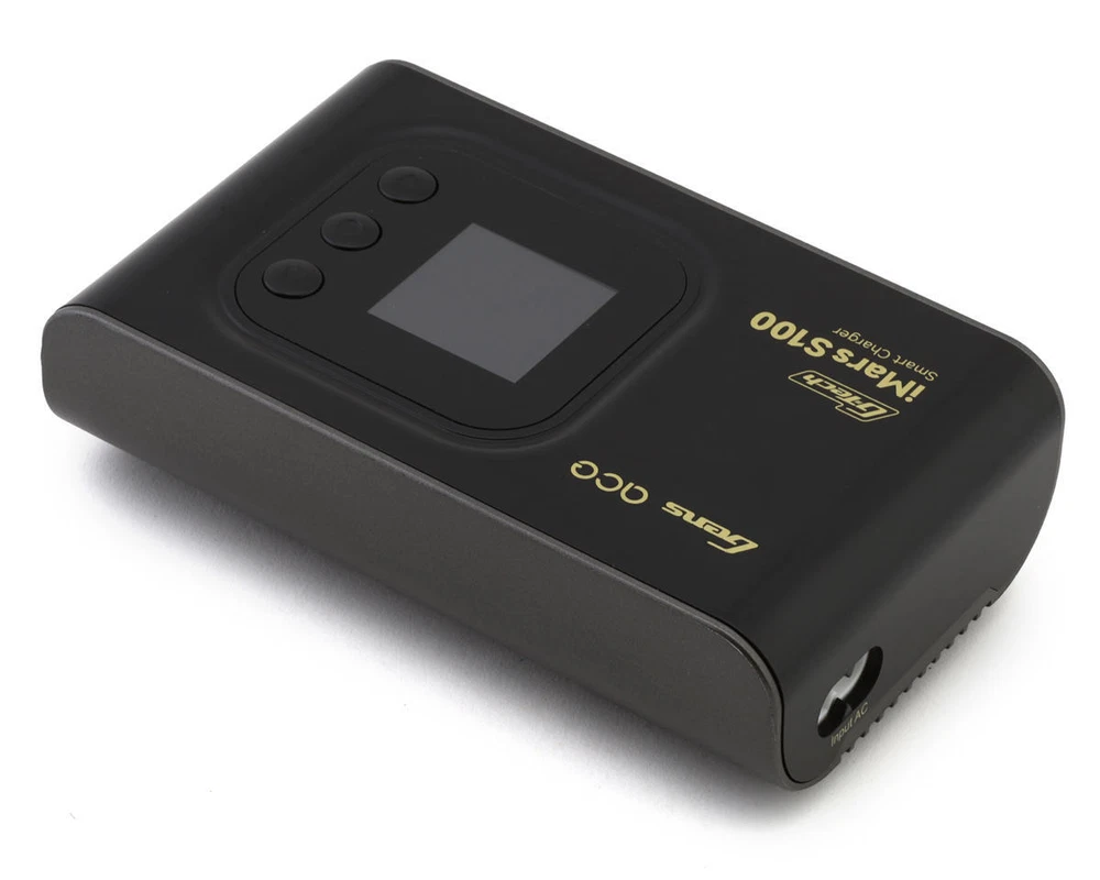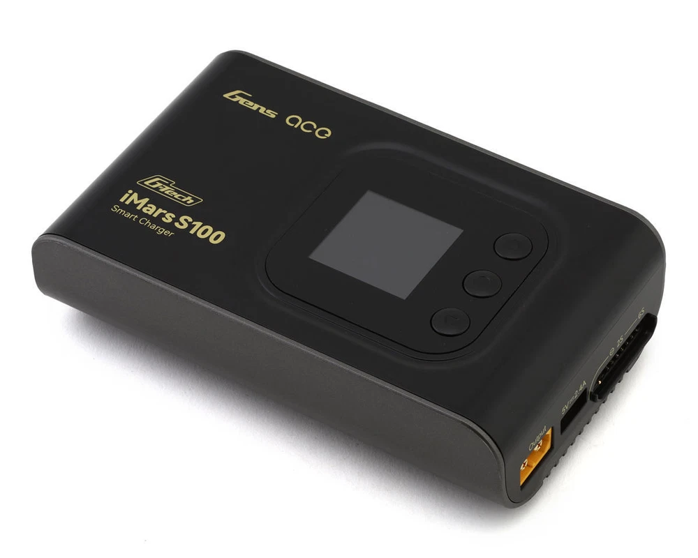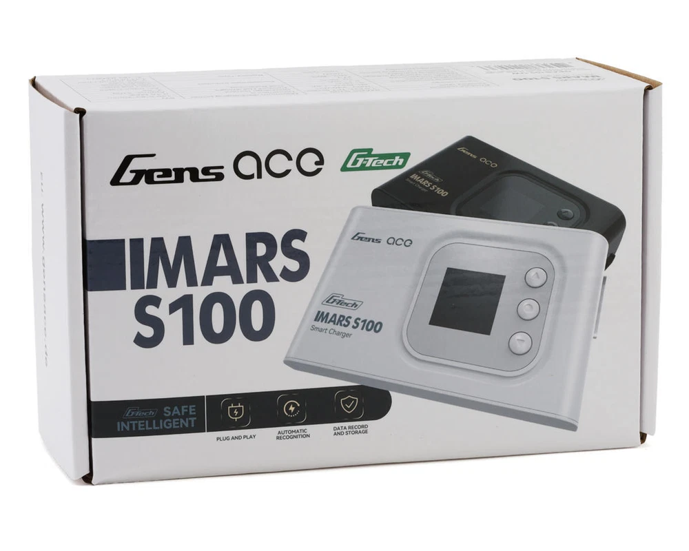 iMars S100 Overview: The Gens ace iMars S100 G-Tech AC Balance Charger is a high-performance charging solution designed for a variety of RC batteries. This iMars S100 charger offers impressive versatility with its ability to handle charge rates up to 10 amps and operates across a worldwide voltage range of 100 to 240 volts! Equipped with a robust one hundred-watt power capacity, making it suitable for everything from small FPV drone batteries to larger 1:10/1:8 racing car batteries or even 700-series helicopters! Upgraded from the iMars Pro III, the iMars S100 features physical buttons for a more tactile experience compared to the previous touchpad model. It integrates seamlessly with G-Tech smart batteries while maintaining compatibility with non-smart batteries. Additionally, the charger boasts a unified user interface language, enhancing ease of use and consistency across G-Tech products. Features: Super lightweight and portable design Capable of charging up to 10 amps with a 100-watt power capacity! Multi-functional colored display Easy to navigate interface Worldwide voltage input compatibility (AC 100-240V) Reliable button keys instead of touchpad for improved user interaction Unified UI language for consistent user experience across G-Tech products Compatible with G-Tech smart batteries and non-smart batteries Controlled heat dissipation system Available in black and white Specifications: Input Voltage: AC 100-240V Output Voltage: 27V (max) Discharging Power: 5W Charging Power: 100W Charge Current: 10A (max) Discharge Current: 4A (max) Cell Balancing: 2S-6S (Lipo/Li-ion/LiHV/LiFe), 4S-18S (NIMH) Function: Charger/Discharge/Storage/Balance Channel: Single Input Connector: AC Output Connector: XT60 Dimensions: 139.8x83x40mm Product Net Weight: 260g Includes: (1) iMars S100 G-Tech Smart AC Balance Battery Charger (1) AC Input Cable (1) XT60-T Adapter (1) XT60-EC5 Adapter (1) XT60-EC3 Adapter (1) USB Cable About Us | View Store