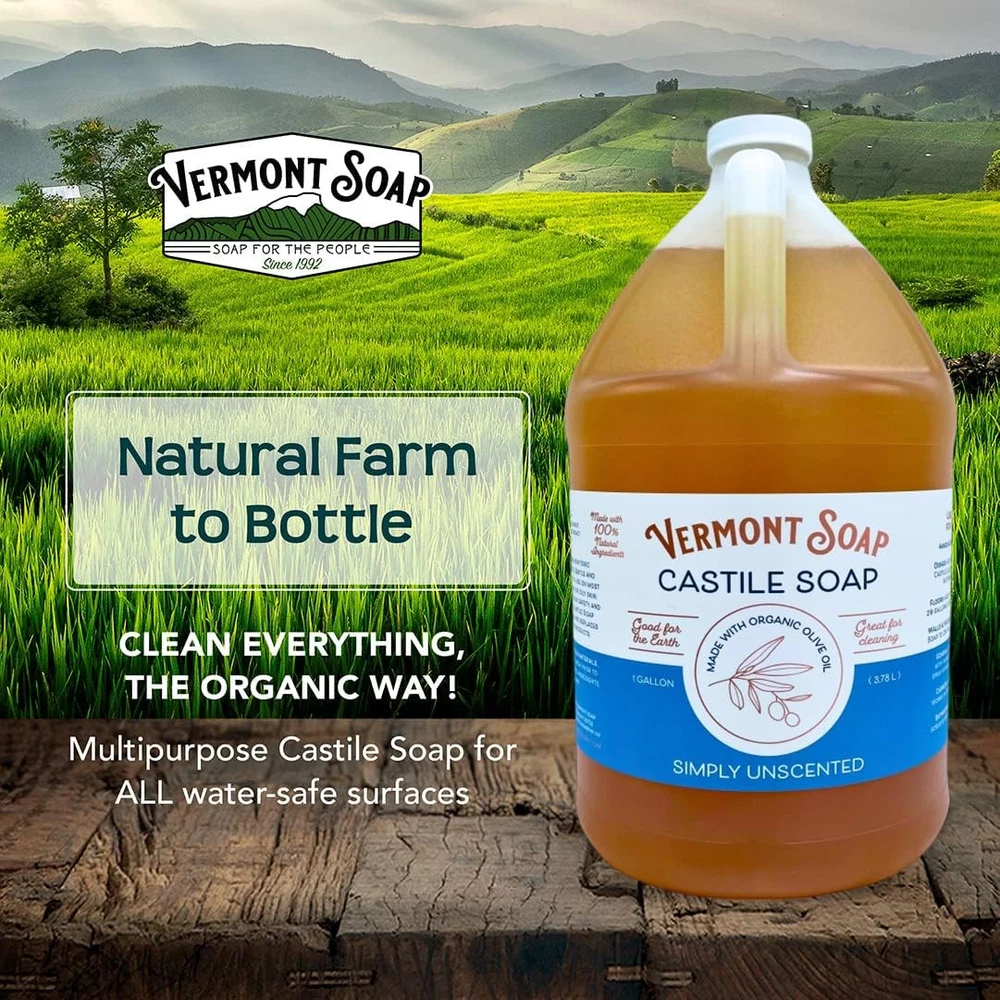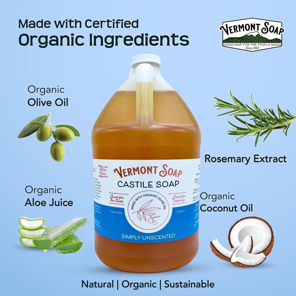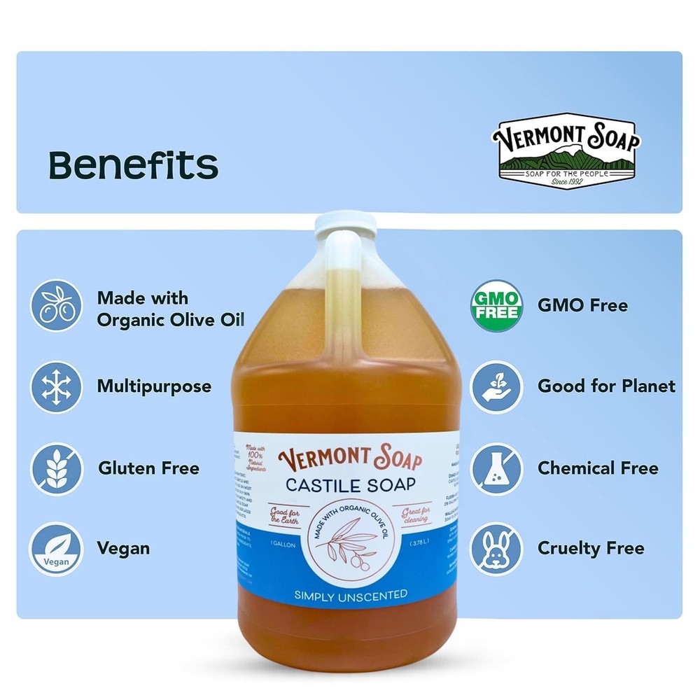 Vermont Castile Soap Unscented, Gentle Liquid Soap for Sensitive Skin & Natural Body Wash, Organic Hair Shampoo for Oily Hair, Aloe Castile Soap for Men & Women - Gallon USDA ORGANIC: AUDITED NATURAL FARM TO BOTTLE: Master Soapmakers at Vermont liquid Soap craft this high quality unscented castile soap liquid from strictly natural and organic ethically sourced ingredients to bring you a mild and gentle skin feel unheard of in mass market petrochemical detergent products. Our organic castile soap is great for sensitive skin and the most discerning customers. CONCENTRATED ALL PURPOSE CLEANER: Our multipurpose Castile soap liquid can be used to clean everything! Use pure-castile liquid soap as a dish soap, body wash, shampoo, baby soap, veggie wash, laundry detergent, dishwashing soap, floor cleaners, and pet shampoo. With our concentrated Castile Soap, a little goes a long way. GREAT FOR YOUR BODY, HOME AND PLANET pure castile soap is made of natural vegan ingredients, and is fully biodegradable making it safe for your body, your home and our environment. NO HARSH CHEMICALS: Our pure castile soap unscented is 100% Vegan, Glutan-free, cruelty-free, and we dont test on animals. We never use sulfates, chemicals detergents, petrochemicals, artificial colors, fragrances, animal by-products, or other harsh chemicals. MULTIPURPOSE CASTILE SOAP: are master soap makers for 30 years. Since 1992 they are crafting premium certified organic castile soap. Our concentrated formula reduces plastic waste, helps the community in every possible way. If you're not completely satisifed with your unscented castile soap, we'll make it right. At we've been passionately crafting high-quality ethically sourced organic and natural castile liquid soaps since 1992. We are USDA organic certified manufacturer and track ingredients from farm to bottle making sure our products are truly organic. Our plant powered Vermont castile liquid soaps work great as a body wash, shampoo for oily hair, and as an all purpose household cleaner. Vermont Castile Liquid Soaps are made of ingredients that are carefully chosen and developed into a premium quality product for men and women with dry and sensitive skin. Our perfectly balanced body washes for men formula leaves no residues or lingering scent, only clean, smooth, moisturized healthy-looking skin. Our body wash men and women is also mild enough for everyday use. We do not test on animals, use no chemicals, have no phthalates, are glutan-free and are vegan. Features: Relieves dry skin, Moisturizes skin For Normal and Senstive Skin For Oily Hair Shampoo Truly Organic with USDA Organic Certification Effortless dispensing Package Includes: Vermont Castile Soap Simply Unscented - Gallon x 1 Shipping We offer FREE shipping on all orders! We ship within Three business days of payment, usually sooner. We use a selection of shipping services such as UPS, FedEx, USPS etc. We only ship to the lower 48 states, no APO/FPO addresses or PO Boxes allowed. Local pickups and combined shipping options are not provided at this time. Return You can return a product for up to 30 days from the date you purchased it. Any product you return must be in the same condition you received it and in the original packaging. Please keep the receipt. Payment We accept payment by any of the following methods: PayPal Please pay as soon as possible after winning an auction, as that will allow us to post your item to you sooner! Feedback Customer satisfaction is very important to us. If you have any problem with your order, please contact us and we will do our best to make you satisfied. Contact Us If you have any queries, please contact us via ebay. We usually respond within 24 hours on weekdays. Please visit our eBay store to check out other items for sale! Thank you for shopping at our store.