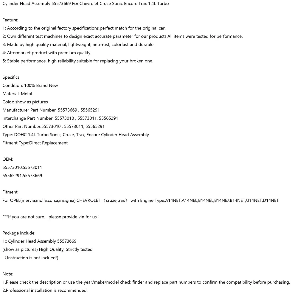 Product Description Cylinder Head Assembly 55573669 For Chevrolet Cruze Sonic Encore Trax 1.4L Turbo Cylinder Head Assembly 55573669 For Chevrolet Cruze Sonic Encore Trax 1.4L Turbo Feature: 1: According to the original factory specifications,perfect match for the original car. 2: Own different test machines to design exact accurate parameter for our products.All items were tested for performance. 3: Made by high quality material, lightweight, anti-rust, colorfast and durable. 4: Aftermarket product with premium quality. 5: Stable performance, high reliability,suitable for replacing your broken one. Specifics: Condition: 100% Brand New Material: Metal Color: show as pictures Manufacturer Part Number: 55573669 , 55565291 Interchange Part Number: 55573010 , 55573011, 55565291 Other Part Number:55573010 , 55573011, 55565291 Type: DOHC 1.4L Turbo Sonic, Cruze, Trax, Encore Cylinder Head Assembly Fitment Type:Direct Replacement OEM: 55573010,55573011 55565291,55573669 Fitment: For OPEL(mervia,molla,corsa,insignia),CHEVROLET (cruze,trax) with Engine Type:A14NET,A14NEL,B14NEL,B14NEJ,B14NET,U14NET,D14NET ***If you are not sure,please provide vin for us! Package Include: 1x Cylinder Head Assembly 55573669 (show as pictures) High Quality, Strictly tested. (Instruction is not inclued!) Note: 1.Please check the description or use the year/make/model check finder and replace part numbers to confirm the compatibility before purchasing. 2.Professional installation is recommended. About Us Bruce & Shark is a company Focus on Motorcycle parts more than 11 years. The design inspiration comes from the awe of the vast sea and worship of the fighting sharks, therefore Bruce & Shark takes a shark as brand logo. Since its inception, we have always put the "customer first" and "top quality" as our principle. We specialized in selling Motorcycle parts and providing customers with various types of high-quality products. Our brand Bruce & Shark has enjoyed good reputation in America, Europe, Japan, Canada and Africa, covering more than 30 countries. Our vision is to deliver high-quality Motorcycle parts products and sincere services to the world. Our main products are motorcycle mounted, fuel pump, stator, windshield, Seat Cover, motorcycle fairing. Welcome to our shop to choose products that are worth more for your Motorcycle! Please Add me to your list of favorite sellers and visit often. Thank you for your business. Shipping United States Buyers Parcel will send via USPS or UPS or FedEx from our United States Warehouse. Shipping Time Usually parcel will be delivered 2-7 working days include handling time. Sometimes shipping time may has a little delay, such as Bad weather, Holidays. Terms We stand behind everything that we sell and will do everything possible to assure you are satisfied. When you receive your purchase if you are not 100% satisfied, please sent me ebay message and we will do our best to make you happy. If you still want to return your purchase, simply ship the item(s) back to us and we will refund your original purchase price and the original shipping charge. Buyers are responsible for the postal cost of returning the items. We must be notified of the intent to return your item within 30 days of receiving the item. Items returned must be in the same condition that they were received. How to return 1,Please ask us for return address . 2,Shipping back the package . The RMA#(Return Merchant Authorization Number = Your ebay ID) must be clearly written on the return package ,Otherwise the package will be refused. 3,Sent us the return tracking number. 4,All returns will be inspected prior to a credit being issued. Contact Us Send us ebay message in English If you have any questions, our Customer Service staffs welcome you to sent me ebay message. We strive to answer all questions and resolve any problems as quickly as possible. Business Hours: HongKong Time GMT+8:00 Monday-Saturday 9:00-17:00 Rider Passenger Seat Front Rear Cushion Black Fit For Kawasaki Zx10R Ninja 11-15 68.65 USD Free shipping 1pcs Fuel Injector Fit Daewoo Lanos Cielo Corsa 1.5L 1.6L 1999-2002 17103677 16.65 USD Free shipping Windshield Windscreen for KAWASAKI Eliminator 500 2024-2025 25 Gray 52.65 USD Free shipping Fog Light Lamp Cover Gloss Black Trim Pair For GMC Yukon / Yukon XL 2015-2020 73.65 USD Free shipping NEW STARTER MOTOR FOR KAWASAKI Z 1000 2014-2016 (Z1000 ZR1000F-G) - 21163-0742 119.65 USD Free shipping Regulator Rectifier For Honda ATC250 ES Big Red TRX250 31600-HA8-770 1985-1987 26.36 USD 28.65 USD Free shipping 8% off Copyright © Bruce&Shark All rights reserved