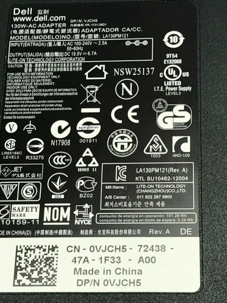 Genuine Dell PA-4E LA130PM121 DA130PE1-00 Laptop AC adapter Charger 130W ~Grade A ~Grade A~ Grade A~ Fit for Dell Inspiron: 7559 5577 5576 7567 7566 7577 5160 11 24 5488 Precision 3520 3510 3541 3530 M2800 M6300 XPS (L502X) 17(L702X) LA130PM121 M20 / M60 / M70 / M90 / M2400 / M4400 / M4500 / M6300 Dell Vostro: 500 / 1000 / 1200 / 1400 / 1500 / 2510 / 3700 / 3750 / A840 | Dell XPS: M1210 / M1330 / M140 / M1530 / M1710 / 14 (L401X) / 15 (L501X) / 15 (L502x) / 17 (L701X) / L702X / M170 | Dell Studio: 1535 / 1536 / 16 (1645) / 16 (1647) PN: 330-1829, 330-1830, X408G, D232H, FA130PE1-00, DA130PE1-00 Fit for Dell Inspiron: 300m / 500m / 510m / 600m / 630m / 640m / 700m / 710m / 6000 / 6000D / 6400 / 8500 / 8600 / 9300 / 1150 / 5150 / 5160 / 1318 / E1405 / E1505 / 1501 / 1420 / 1520 / 1521 / 1525 / 1720 / 1721/ 15R (N5110) / 17R (N7110) / M5110 | Dell Latitude: E6400 / X300 / D400 / D410 / D420 / D430 / D500 / D505 / D510 / D520 / D530 / D531 / D600 / D610 / D620 / D630 / D631 / D800 / D810 / D830 / D831 / 131L / E4300 / E5500 / E5400 / E6400 / E4200/ E4310 / E5410 /E5520 / E6220 Input: 100-240V~1.6A 50-60Hz Output: 19.5V-6.7A Watts: 130 Watts Connecter size: 5.0mm*7.4mm. Package: 1 x AC Adapter & 1 x Power Cord On Mar 30, 2023 at 16:12:18 PDT, seller added the following information: On Apr 16, 2023 at 14:51:05 PDT, seller added the following information: On Jun 14, 2023 at 11:26:22 PDT, seller added the following information: